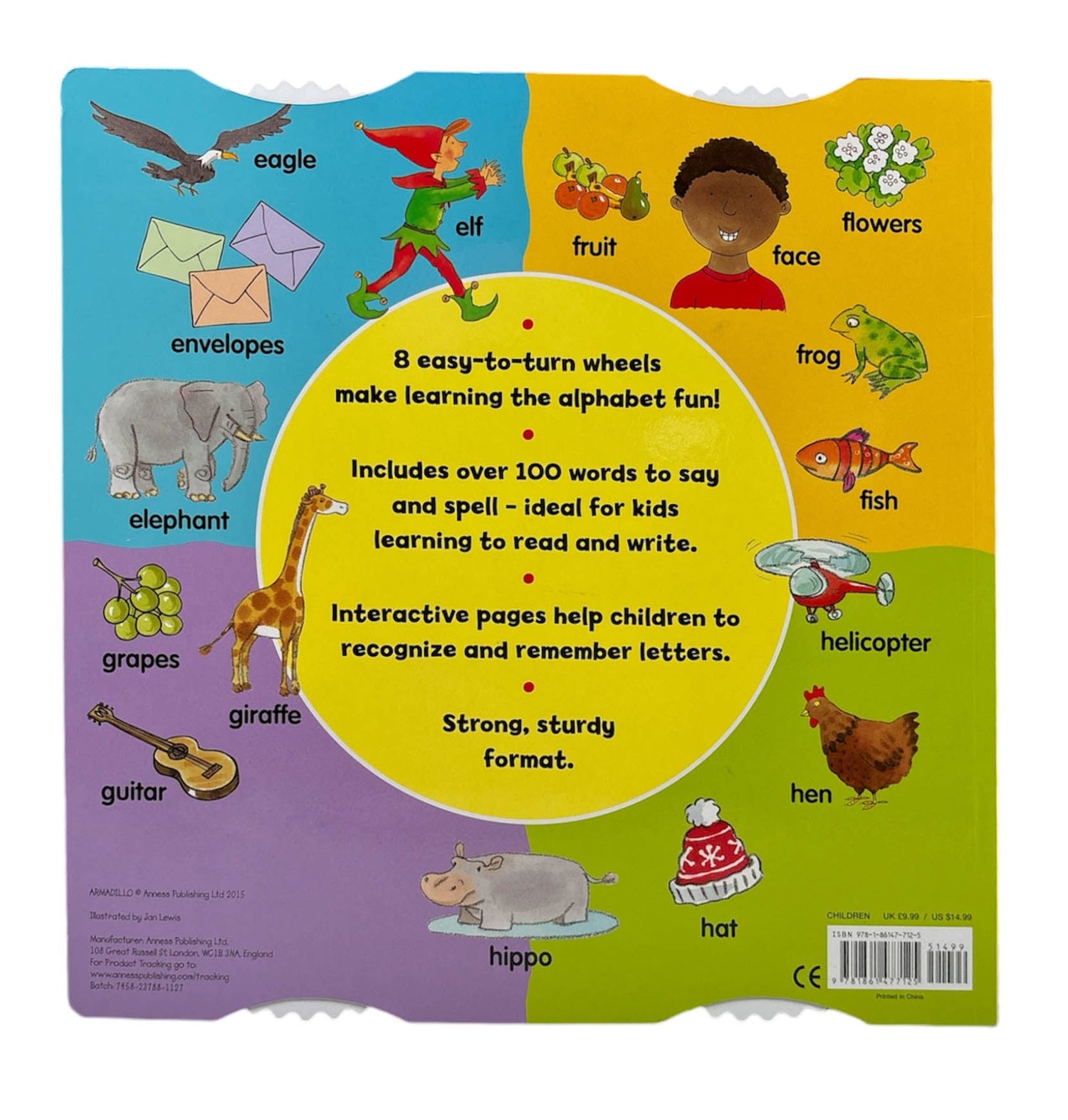 This novelty picture boardbook has eight easy-to-turn wheels, encouraging toddlers to learn the alphabet.