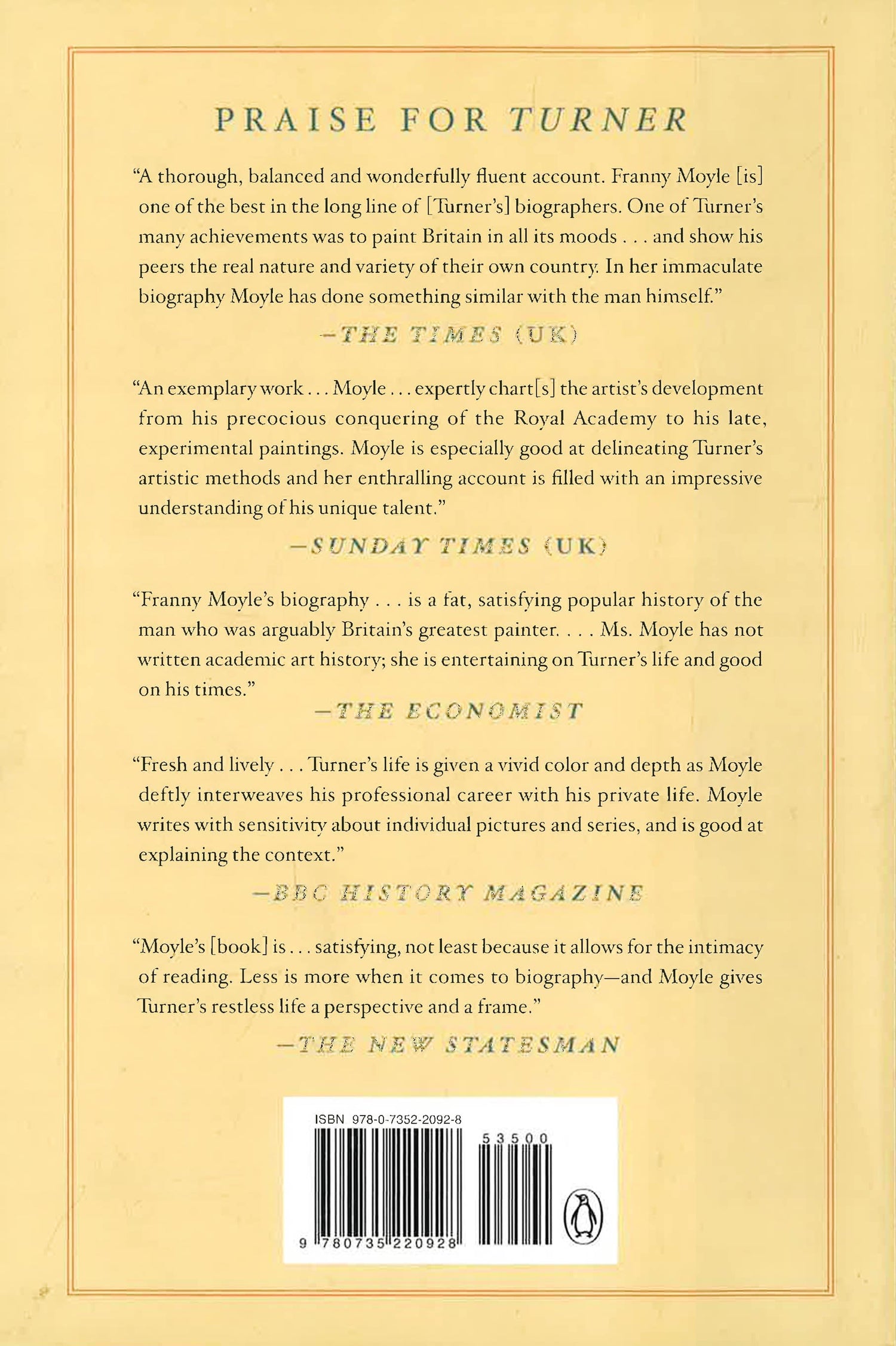 The life of one of Western art's most admired and misunderstood painters J.M.W. Turner is one of the most important figures in Western art, and his visionary work paved the way for a revolution in landscape painting. Over the course of his lifetime, Turner strove to liberate painting from an antiquated system of patronage. Bringing a new level of expression and color to his canvases, he paved the way for the modern artist. Turner was very much a man of his changing era. In his lifetime, he saw Britain ravaged by Napoleonic wars, revived by the Industrial Revolution, and embarked upon a new moment of Imperial glory with the ascendancy of Queen Victoria. His own life embodied astonishing transformation. Born the son of a barber in Covent Garden, he was buried amid pomp and ceremony in St. Paul's Cathedral. Turner was accepted into the prestigious Royal Academy at the height of the French Revolution when a climate of fear dominated Britain. Unable to travel abroad he explored at home, reimagining the landscape to create some of the most iconic scenes of his country. But his work always had a profound human element. When a moment of peace allowed travel into Europe, Turner was one of the first artists to capture the beauty of the Alps, to revive Venice as a subject, and to follow in Byron's footsteps through the Rhine country. While he was commercially successful for most of his career, Turner's personal life remained fraught. His mother suffered from mental illness and was committed to Bedlam. Turner never married but had several long-term mistresses and illegitimate daughters. His erotic drawings were numerous but were covered up by prurient Victorians after his death. Turner's late, impressionistic work was held up by his Victorian detractors as example of a creeping madness. Affection for the artist's work soured. John Ruskin, the greatest of all 19th century art critics, did what he could to rescue Turner's reputation, but Turner's very last works confounded even his greatest defender. TURNER humanizes this surprising genius while placing him in his fascinating historical context. Franny Moyle brilliantly tells the story of the man to give us an astonishing portrait of the artist and a vivid evocation of Britain and Europe in flux. *This book may have remainder mark.