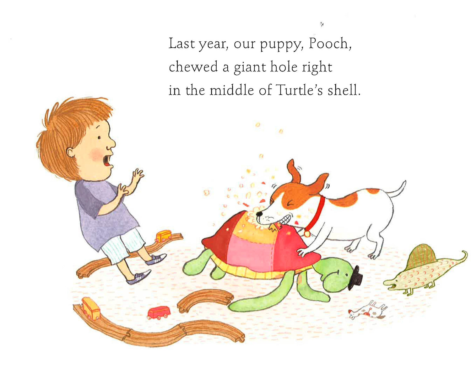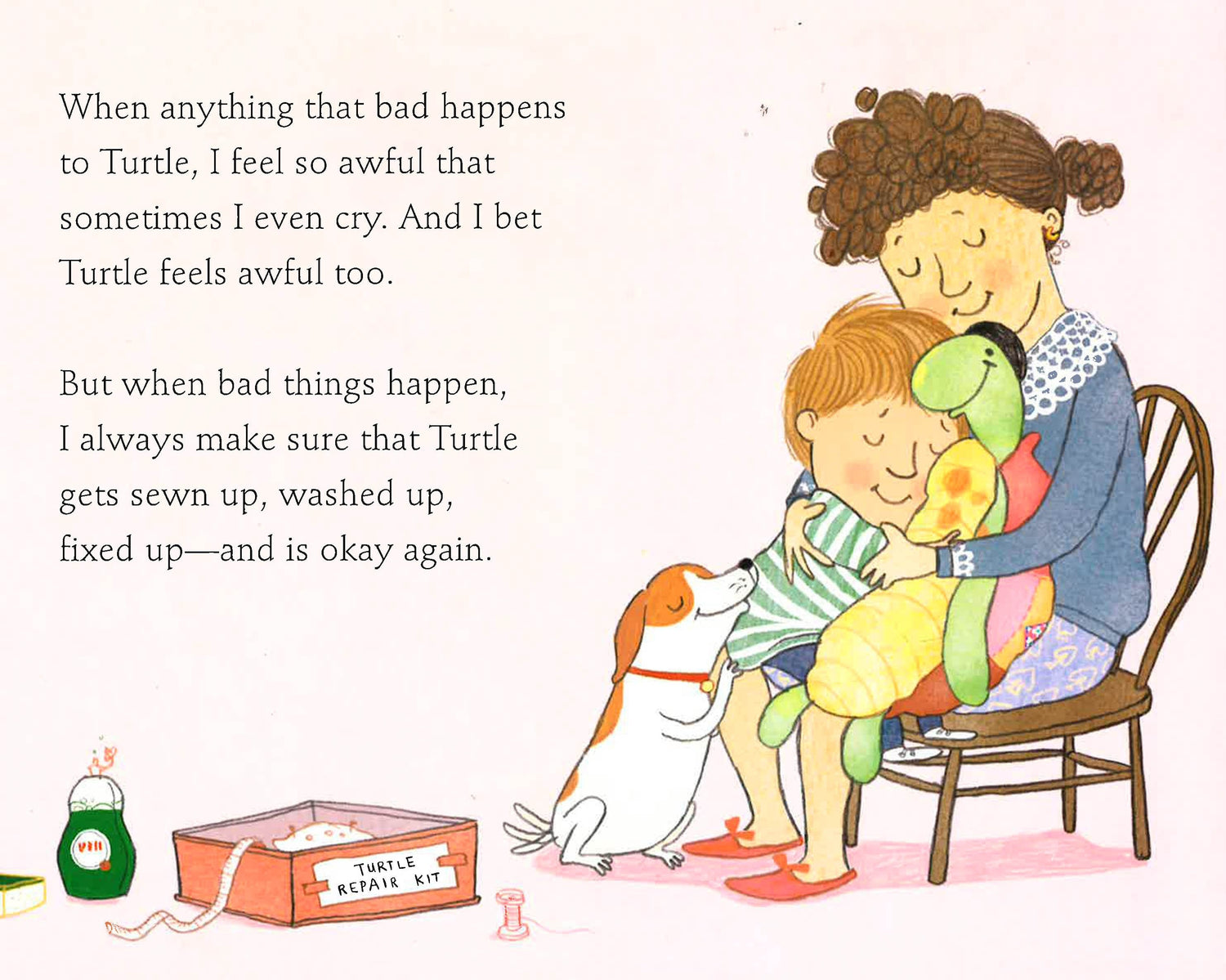 Turtle and Me is a charming story about the adventures a little boy has with his cuddly toy turtle. Over the years, Turtle gets covered in spaghetti, splattered by mud, chewed by a puppy, and much more - but the boy still loves him. Turtle has become his security blanket, as well as his best friend. But one day Turtle suffers a horrible rip that the boy can't repair. The boy decides he doesn't need his old chewed up, sewn up, taped up, ripped up raggedy turtle anymore. But when he tries to sleep at night, he begins to think otherwise!