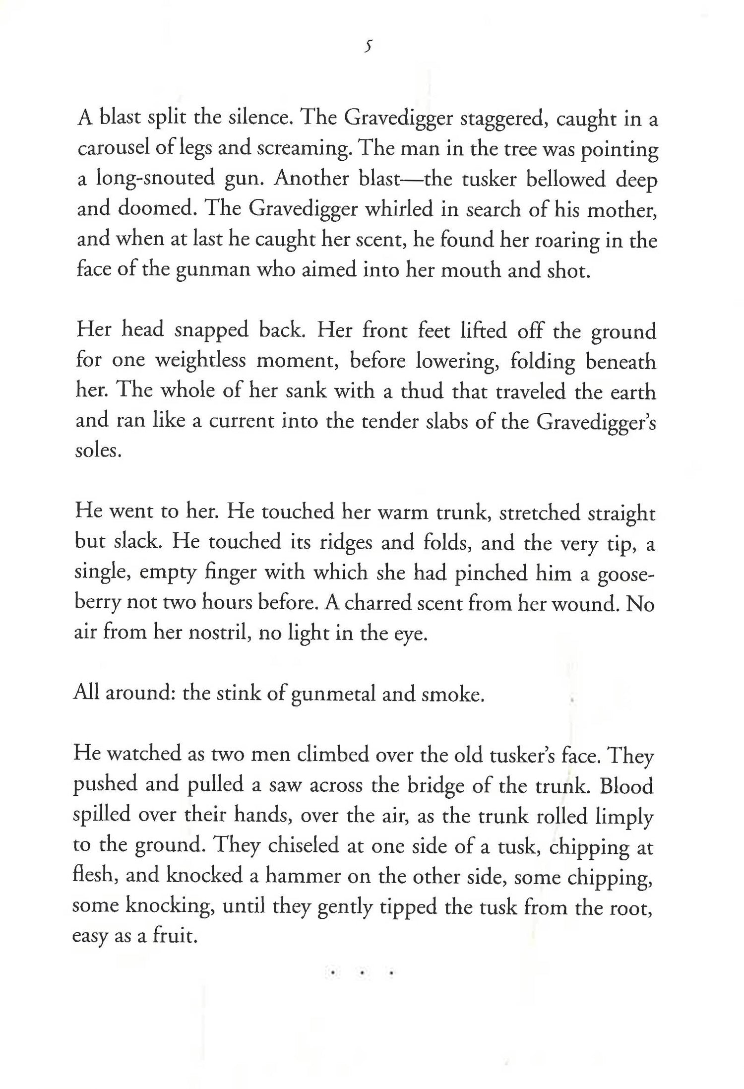 Orphaned by poachers as a calf and sold into a life of labor and exhibition, the Gravedigger breaks free of his chains and begins terrorizing the countryside, earning his name from the humans he kills and then tenderly buries. Manu, the studious younger son of a rice farmer, loses his cousin to the Gravedigger’s violence and is drawn, with his wayward brother Jayan, into the sordid, alluring world of poaching. Emma is a young American working on a documentary with her college best friend, who witnesses the porous boundary between conservation and corruption and finds herself in her own moral gray area: a risky affair with the veterinarian who is the film’s subject. As the novel hurtles toward its tragic climax, these three storylines fuse into a wrenching meditation on love and betrayal, duty and loyalty, and the vexed relationship between man and nature.