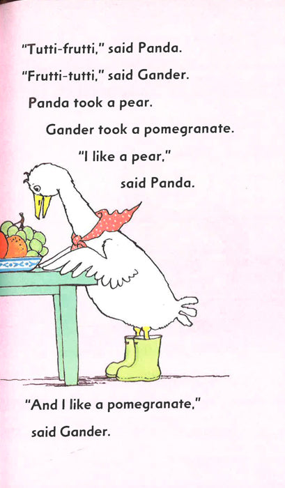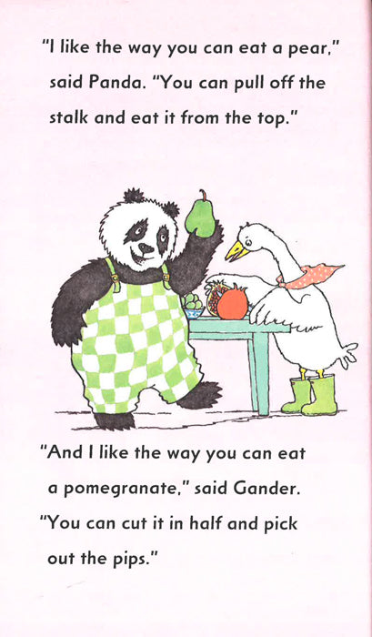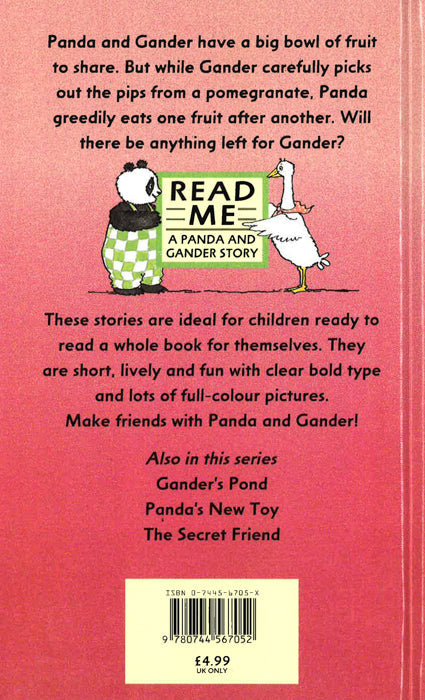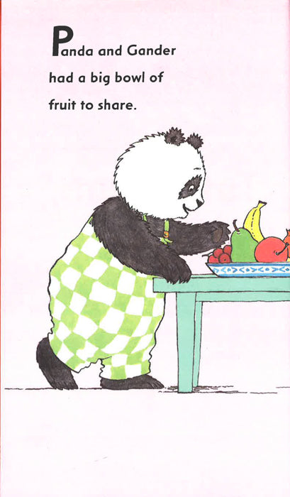 A picture book, which through a series, tells of an episode in the lives of two friends, Gander and Panda. This story which is intended for children ready to read a whole book for themselves, tells of the time that they have a big bowl of fruit to share.