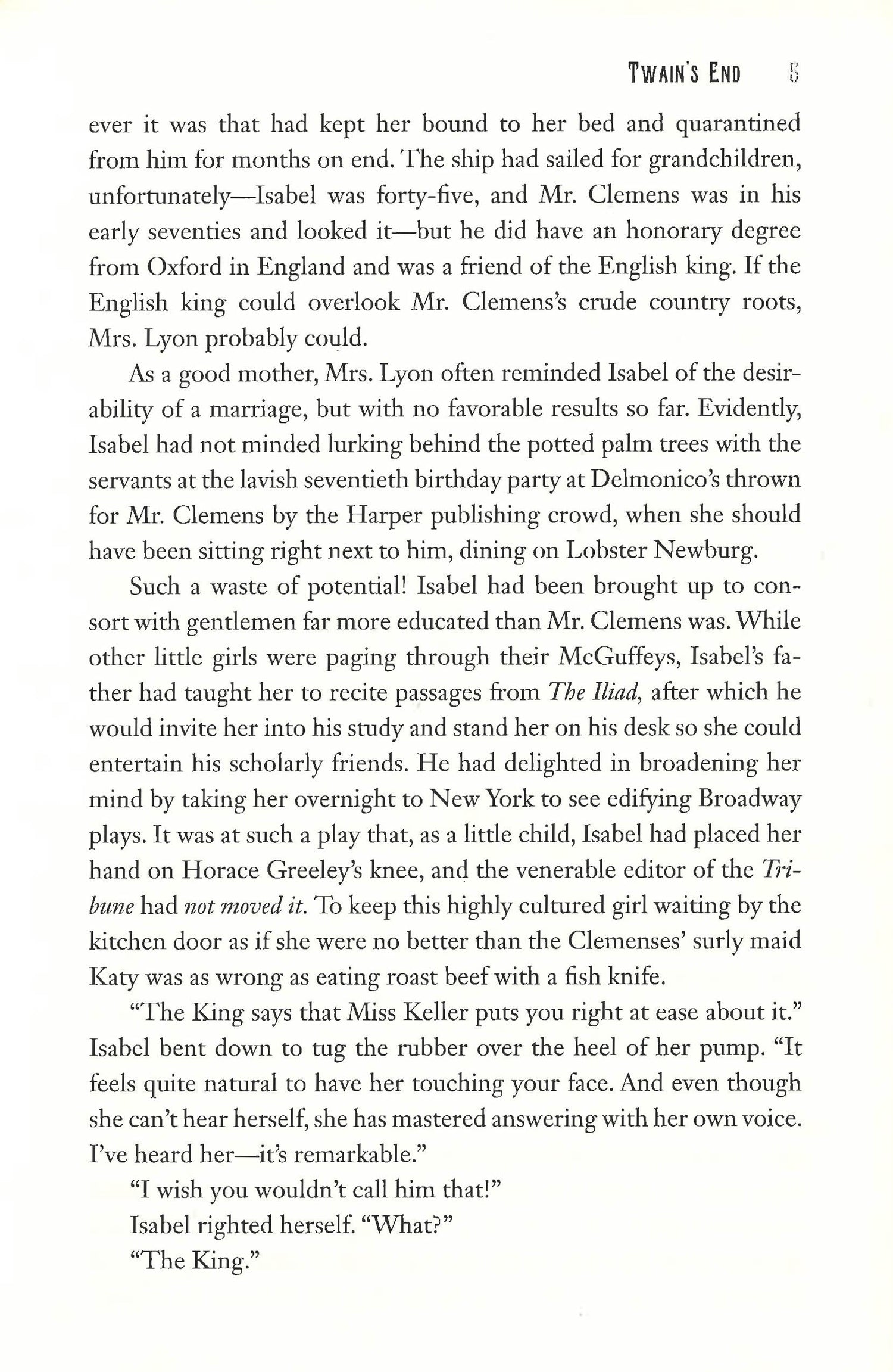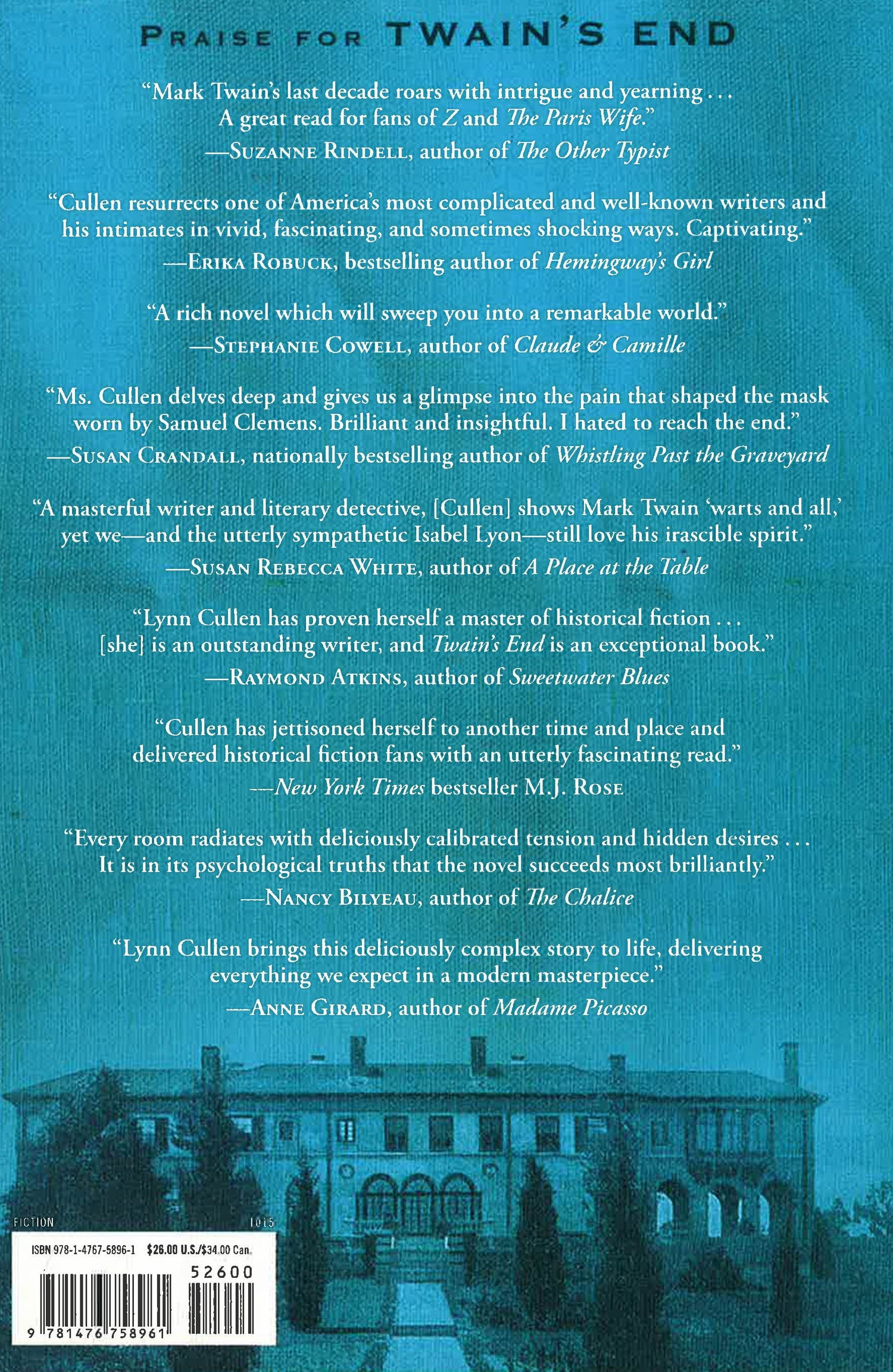In March of 1909, Mark Twain cheerfully blessed the wedding of his private secretary, Isabel V. Lyon, and his business manager, Ralph Ashcroft. One month later, he fired both. He proceeded to write a ferocious 429-page rant about the pair, calling Isabel ?a liar, a forger, a thief, a hypocrite, a drunkard, a sneak, a humbug, a traitor, a conspirator, a filthy-minded and salacious slut pining for seduction.? Twain and his daughter, Clara Clemens, then slandered Isabel in the newspapers, erasing her nearly seven years of devoted service to their family. How did Lyon go from being the beloved secretary who ran Twain?s life to a woman he was determined to destroy? In Twain?s End, Lynn Cullen reimagines the tangled relationships between Twain, Lyon, and Ashcroft, as well as the little-known love triangle between Helen Keller, her teacher Anne Sullivan Macy, and Anne?s husband, John Macy, which comes to light during their visit to Twain?s Connecticut home in 1909. Add to the party a furious Clara Clemens, smarting from her own failed love affair, and carefully kept veneers shatter. Based on Isabel Lyon?s extant diary, Twain?s writings and letters, and events in Twain?s boyhood that may have altered his ability to love, Twain?s End explores this real-life tale of doomed love.