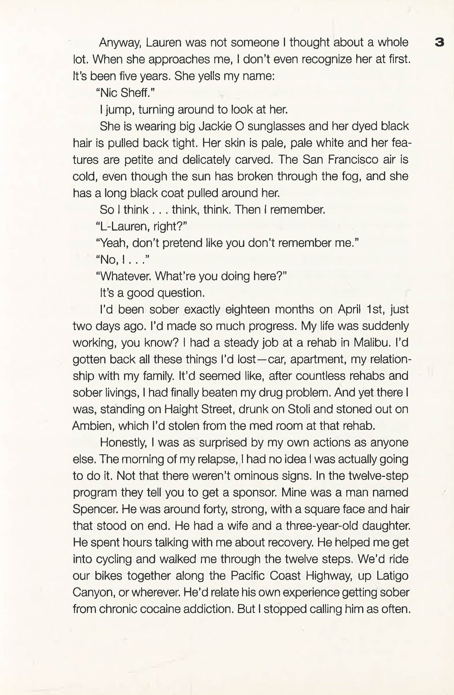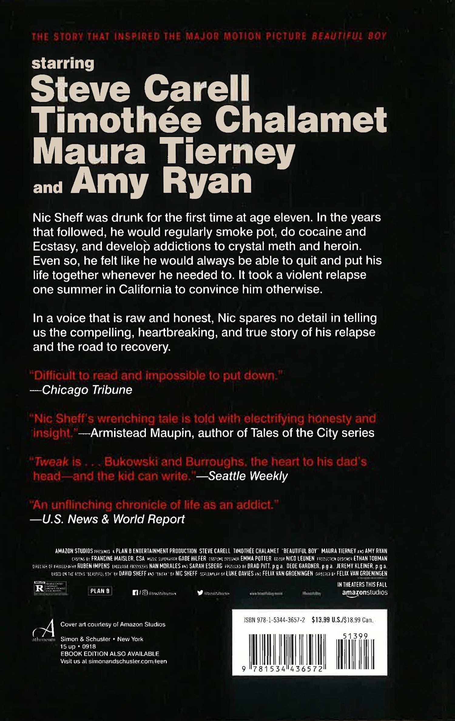 The story that inspired the major motion picture Beautiful Boy featuring Steve Carell and Timothée Chalamet. This New York Times bestselling memoir of a young man's addiction to methamphetamine tells a raw, harrowing, and ultimately hopeful tale of the road from relapse to recovery. Nic Sheff was drunk for the first time at age eleven. In the years that followed, he would regularly smoke pot, do cocaine and Ecstasy, and develop addictions to crystal meth and heroin. Even so, he felt like he would always be able to quit and put his life together whenever he needed to. It took a violent relapse one summer in California to convince him otherwise. In a voice that is raw and honest, Nic spares no detail in telling us the compelling, heartbreaking, and true story of his relapse and the road to recovery. As we watch Nic plunge into the mental and physical depths of drug addiction, he paints a picture for us of a person at odds with his past, with his family, with his substances, and with himself. It's a harrowing portrait--but not one without hope.