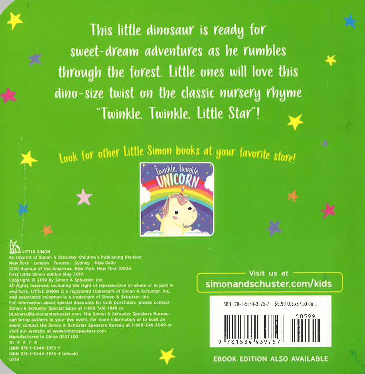 This sleepy dino board book is a prehistoric twist on the popular bedtime lullaby, “Twinkle, Twinkle, Little Star!”Twinkle, twinkle, dinosaur how I like to hear you roar. Stomping through the trees so high, as your friends fly through the sky. A roaring twist on the popular bedtime nursery rhyme, Twinkle, Twinkle, Dinosaur is the second book in a brand-new board book series that’s perfect for parents and little ones to snuggle up with and share.