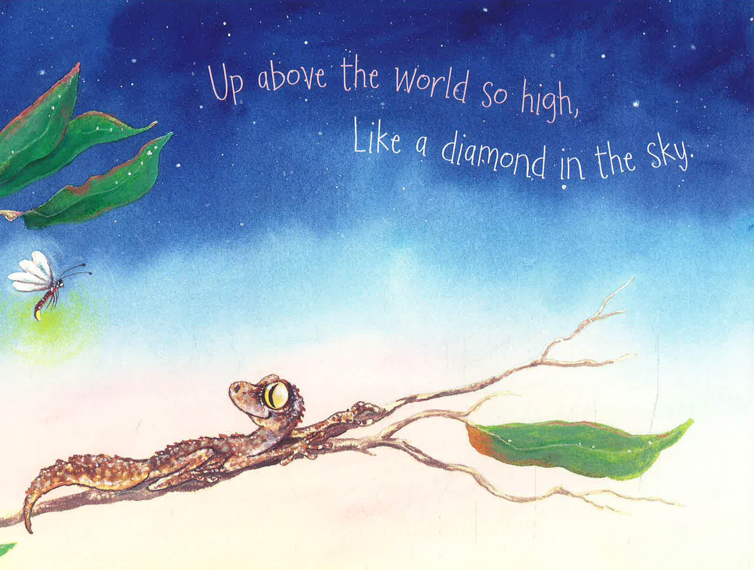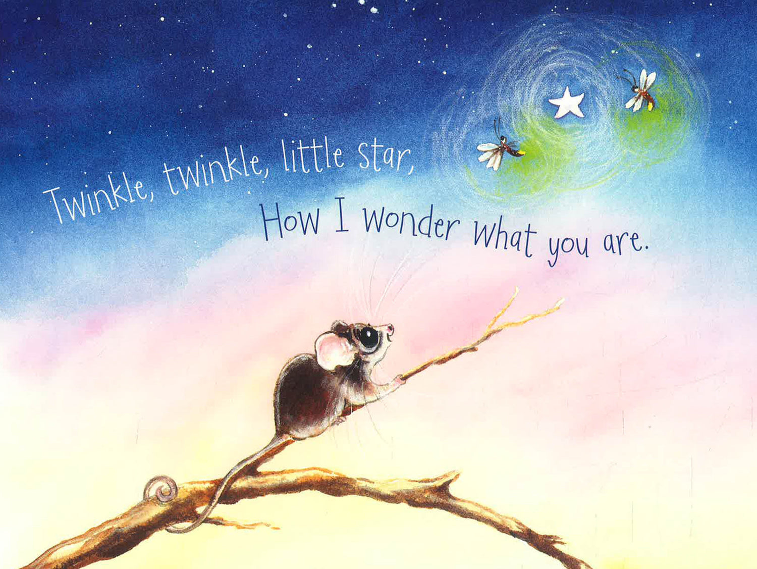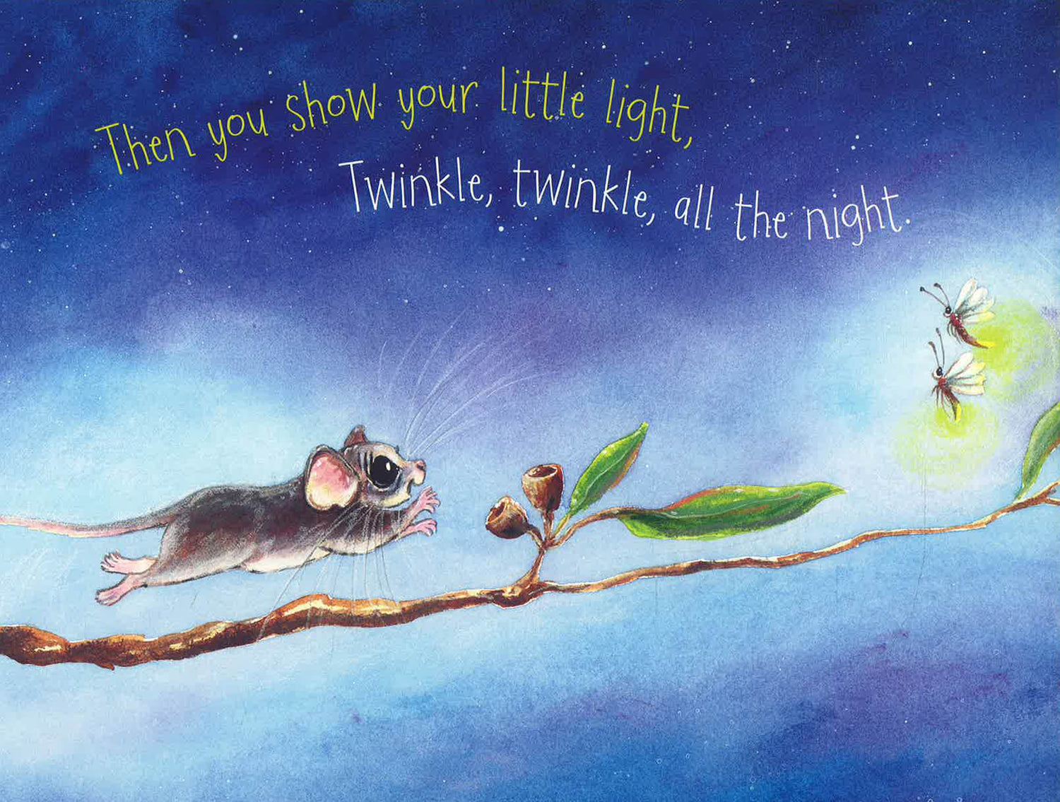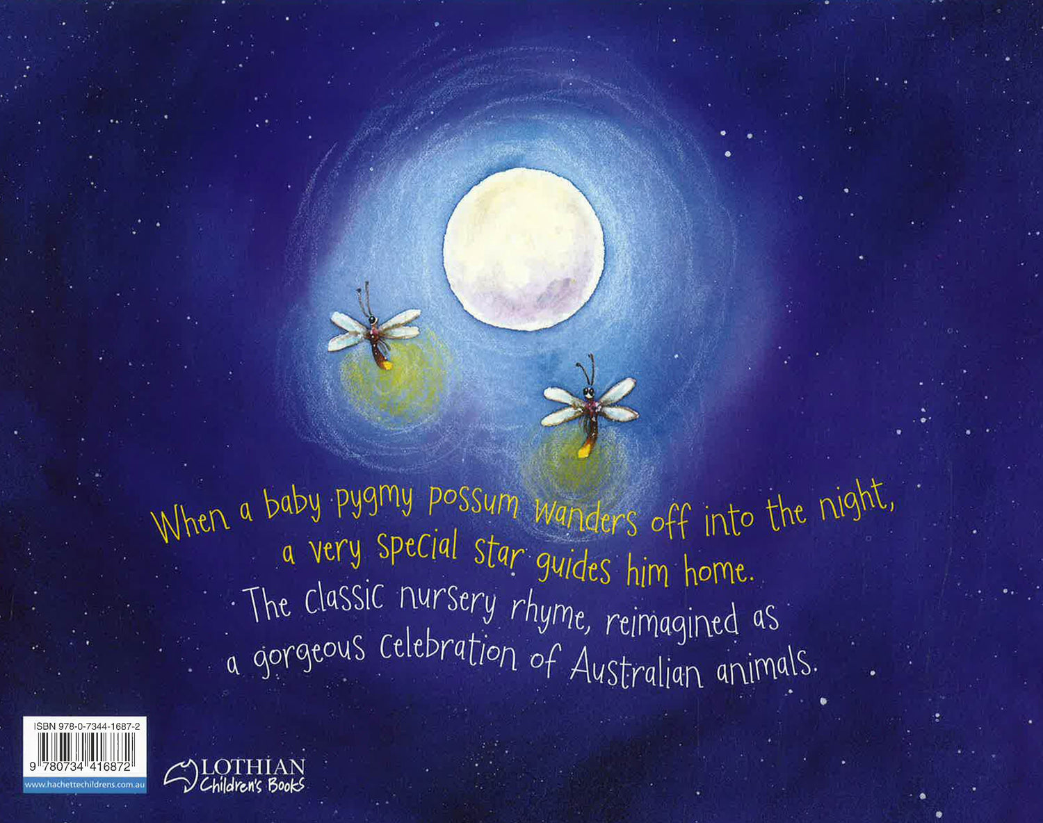 Twinkle, twinkle, little star,How I wonder what you are!Up above the world so high,Like a diamond in the sky.When the blazing sun is gone,When he nothing shines upon,Then you show your little light,Twinkle, twinkle, all the night.When a baby pygmy possum wanders off into the night, a very special star guides him home. Along the way, he encounters many other Australian animals. This lushly illustrated book is perfect for bedtime!