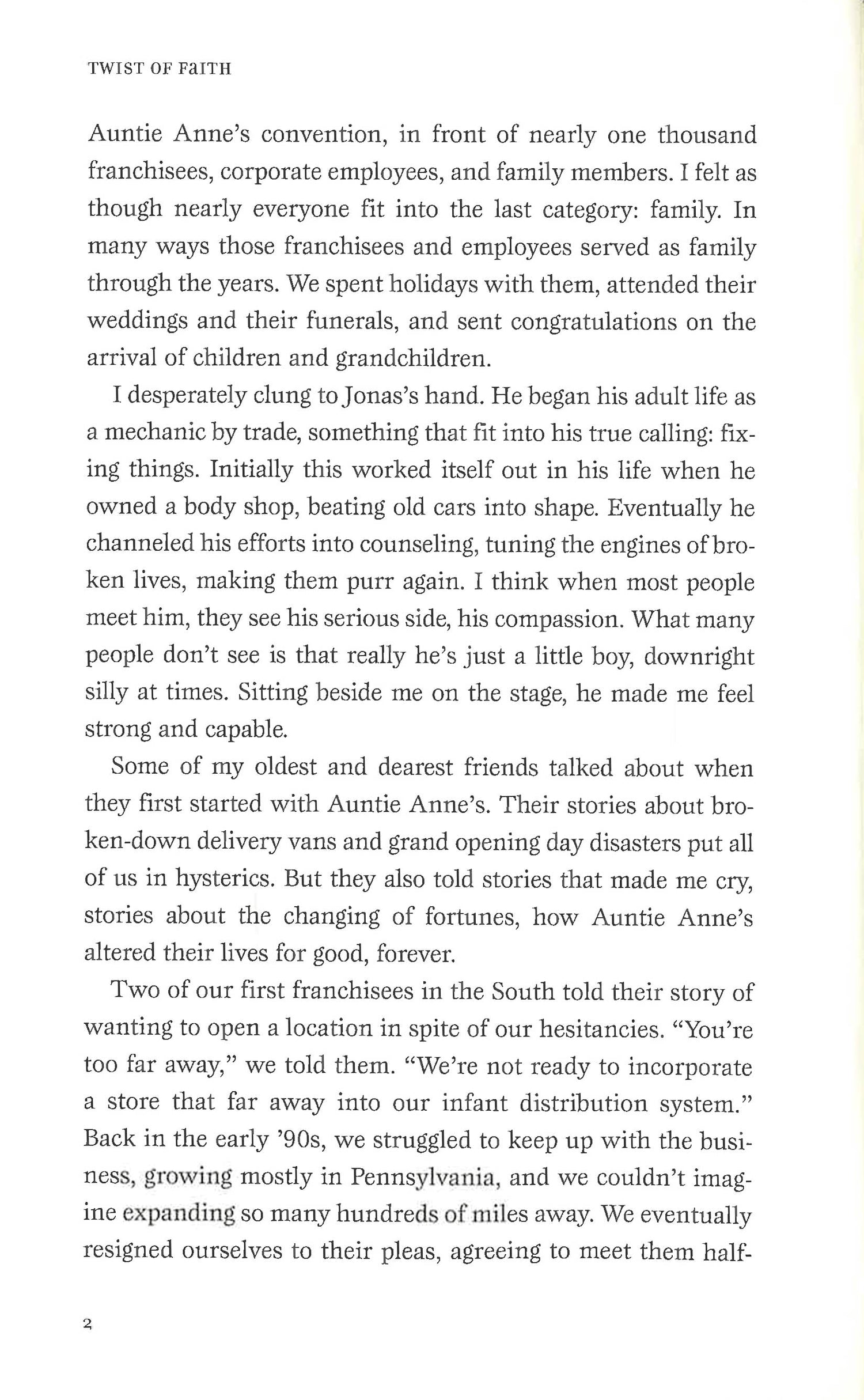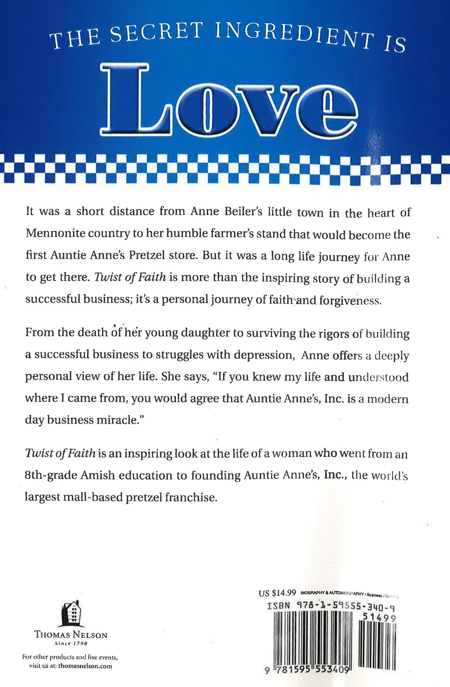 The secret ingredient is love.It was a short distance from Anne Beiler's little town in the heart of Mennonite country to her humble farmer's stand that would become the first Auntie Anne's Pretzel store. But it was a long life journey for Anne to get there. Twist of Faith is more than the inspiring story of building a successful business; it's a personal journey of faith and forgiveness.From the death of her young daughter to surviving the rigors of building a successful business to struggles with depression, Anne offers a deeply personal view of her life. She says, "If you knew my life and understood where I came from, you would agree that Auntie Anne's, Inc. is a modern day business miracle."Twist of Faith is an inspiring look at the life of a woman who went from an 8th-grade Amish education to founding Auntie Anne's, Inc., the world's largest mall-based pretzel franchise.