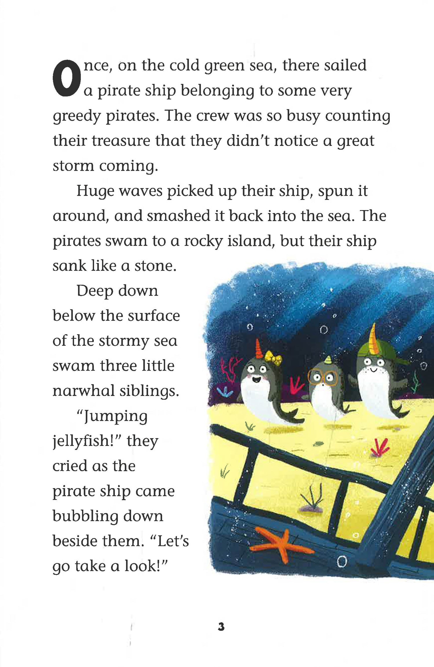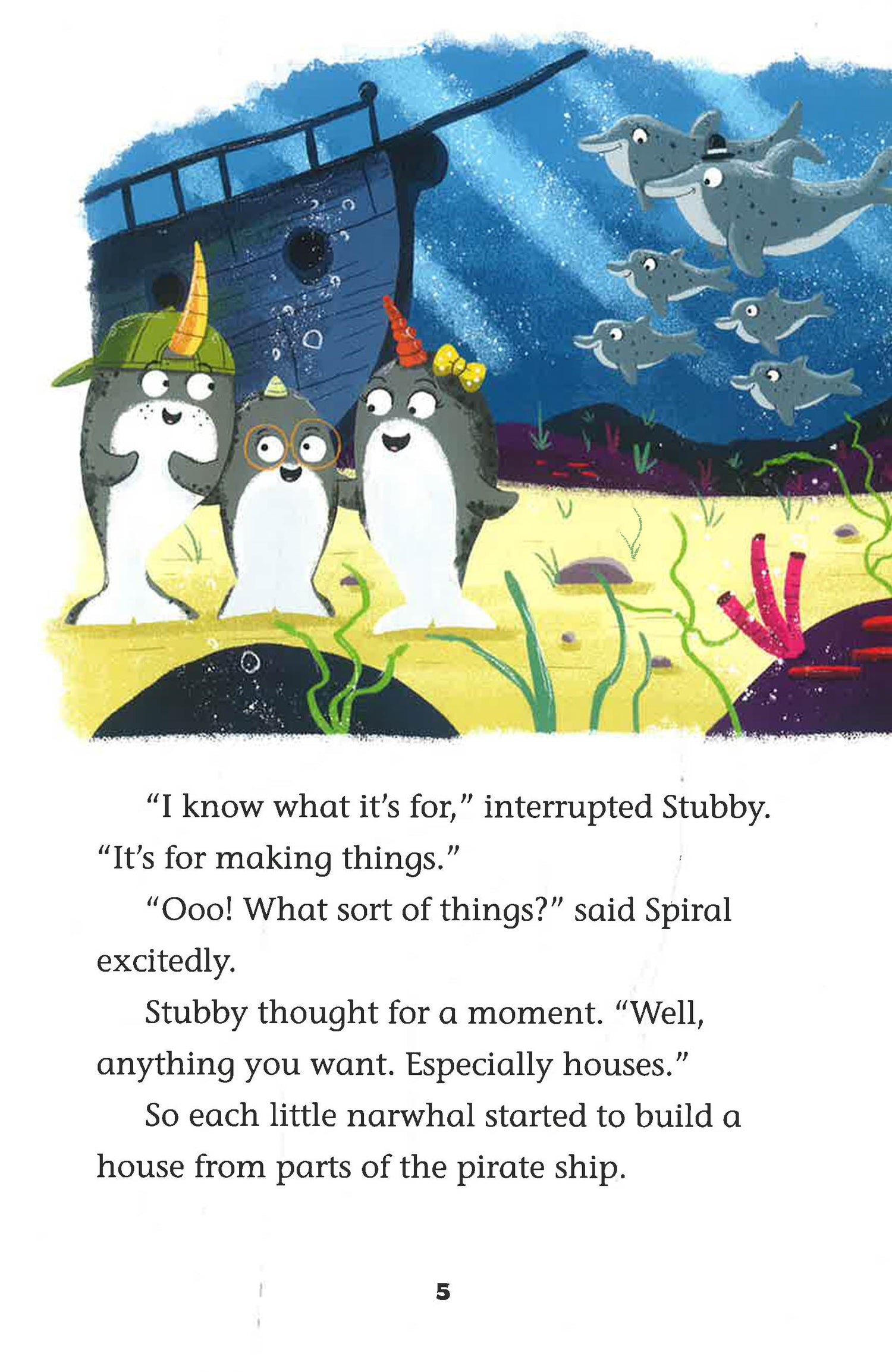 In this whale of a tale, the Big Bad Shark is looking for a tasty snack... when he comes across three delicious-looking narwhals! The loveable, pointy-horned creatures-show-off Spike, arty Spiral, and shy Stubby-discover a sunken pirate ship, and are using the parts to build their own homes. Now they are out of their depth, locked in a battle of wits with the munching, crunching villain.