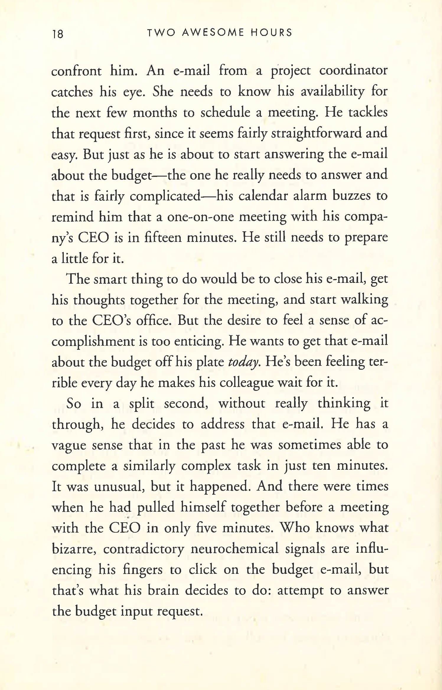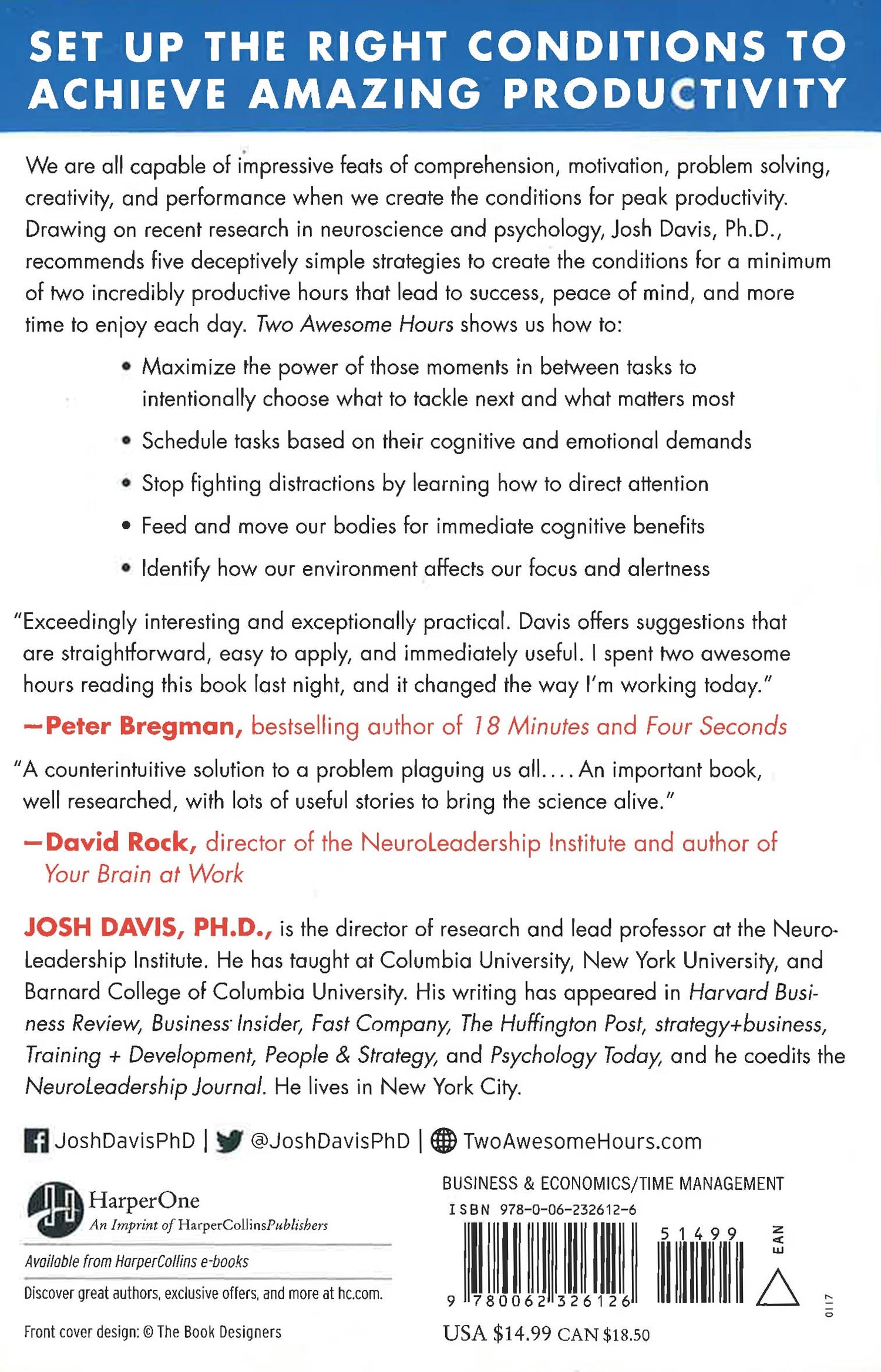 Feeling overwhelmed with work and life demands? Rushing, multitasking, or relying on fancy devices and apps won't help. The answer is to create the conditions for two awesome hours of peak productivity per day. Drawing on cutting-edge neuroscience, Josh Davis, director of research at the NeuroLeadership Institute explains clearly that our brains and bodies operate according to complex biological needs that, when leveraged intelligently, can make us incredibly effective. From what and when we eat, to when we tackle tasks or disengage?how we plan our activities has a huge impact on performance. Davis shows us how we can create the conditions for two awesome hours of effective mental performance by: Recognizing when to effective flip the switch on our automatic thinking; Scheduling tasks based on their ?processing demand? and recovery time; Learning how to direct attention, rather than avoid distractions; Feeding and moving our bodies in ways that prep us for success; Identifying what matters in our environment to be at the top of our mental game. We are capable of impressive feats of comprehension, motivation, thinking, and performance when our brain and biological systems are functioning optimally. Two Awesome Hours will show you how to be your most productive every day. *This book may have remainder mark*