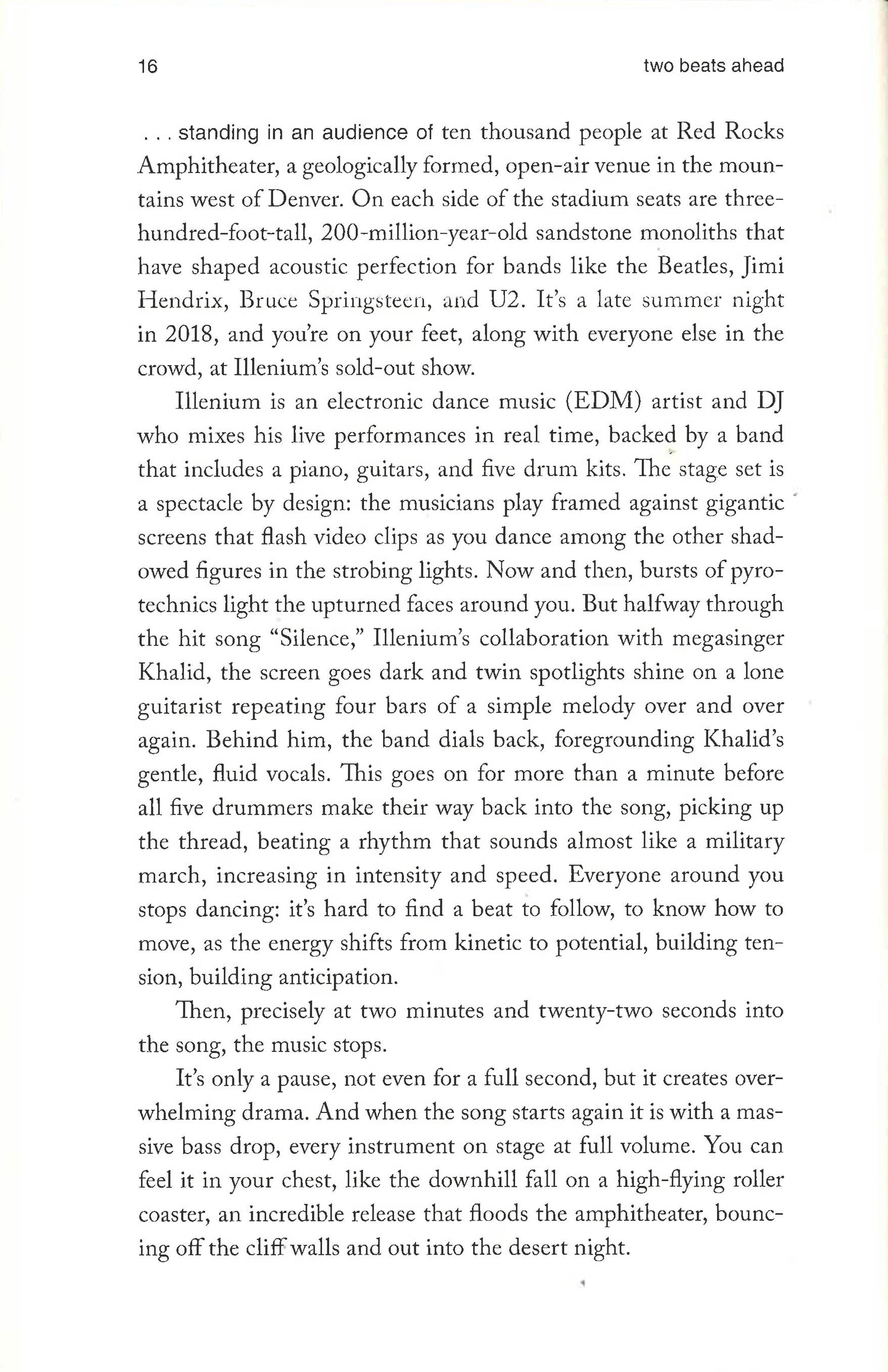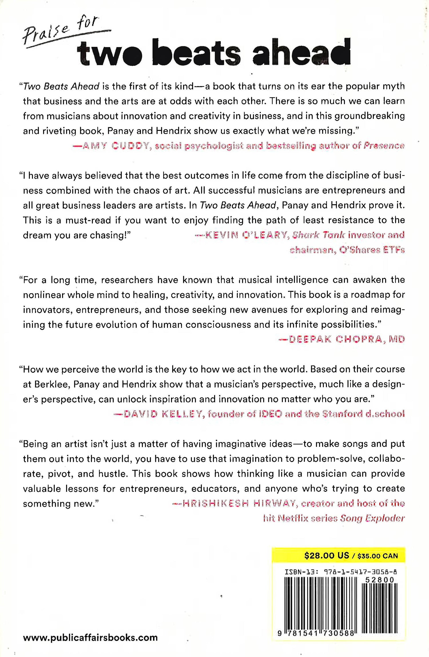 In Two Beats Ahead, Panos A. Panay, senior vice president for strategy at Berklee College of Music, and R. Michael Hendrix, global design director at IDEO, interview some of the nation's top musicians and business leaders about how they approach innovation differently. They speak with hit maker Desmond Child about the importance of demoing and with industry legend Jimmy Iovine about listening and knowing your audience. Readers will learn the secrets of collaboration from Beyoncé and Pharrell Williams, about "daring to suck" from Justin Timberlake, about the power of reinvention from Gloria Estefan, and the importance of experimentation from Imogen Heap and Radiohead. And they'll learn the value of finding and producing talent with T Bone Burnett and Hank Shocklee, cofounder of Public Enemy.