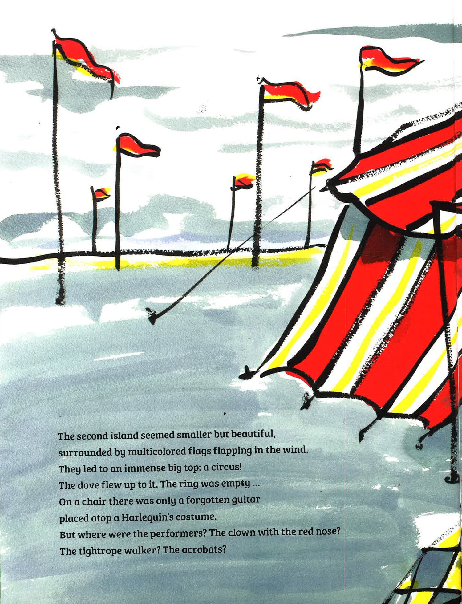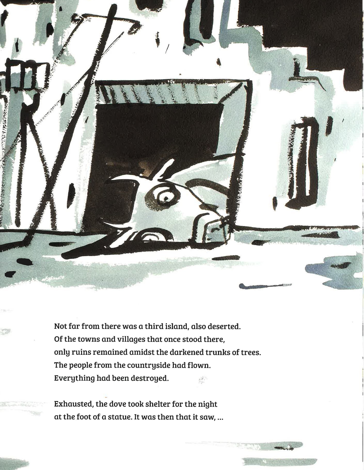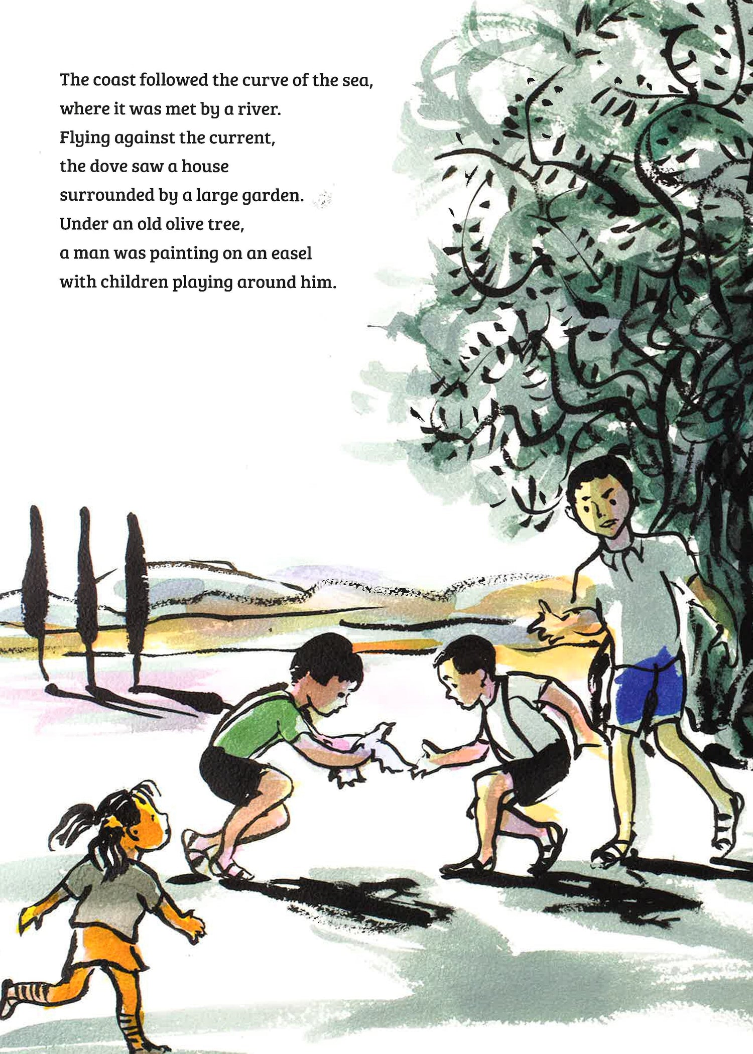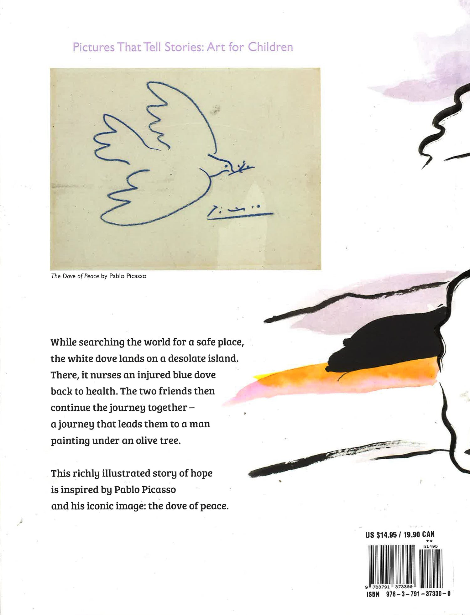 "A little white dot in the great sky," a dove sails over the earth looking for a place to land. She soars over a series of intriguing landscapes: rocky plains filled with strange objects; an abandoned circus; a deserted barn. Finally she meets a friend-a wounded blue dove. The two birds travel until the blue dove collapses in a garden where Picasso is painting with a group of children. Together the children and the artist help the wounded dove. Then the two doves fly away to spread peace in other parts of the world. Illustrated with bold, arresting gouache and watercolor paintings, this simple story packs in powerful meaning. Samples of Picasso's other artworks and styles are cleverly included in the book, allowing readers the chance to learn about one of the world's greatest artists-and one of his most enduring symbols.