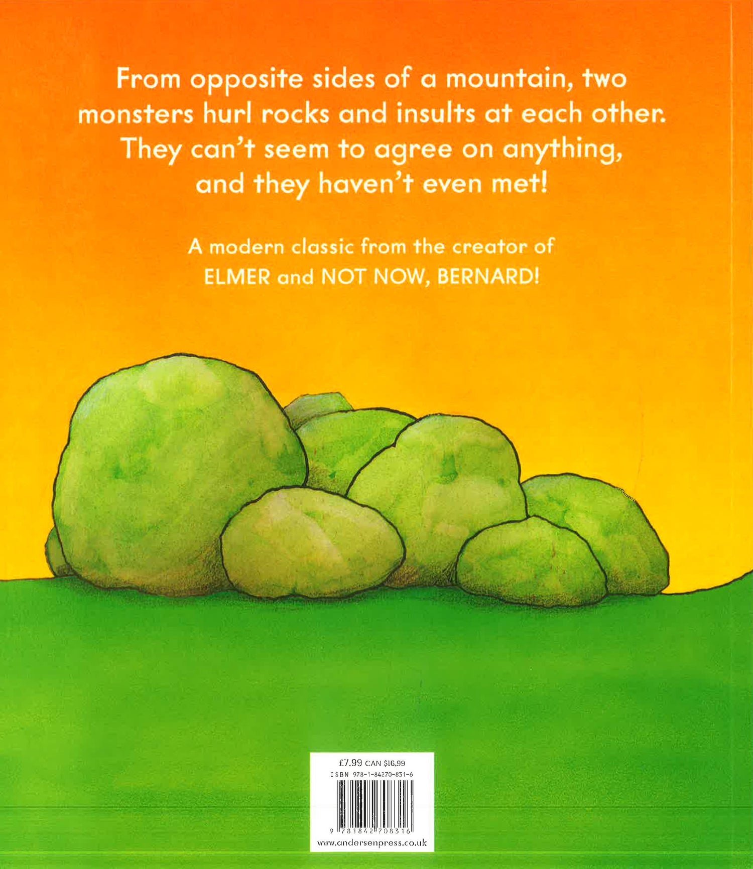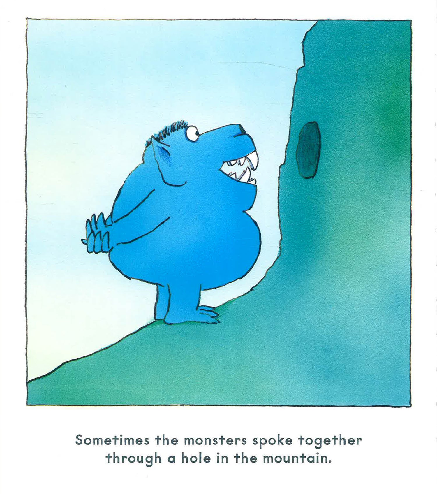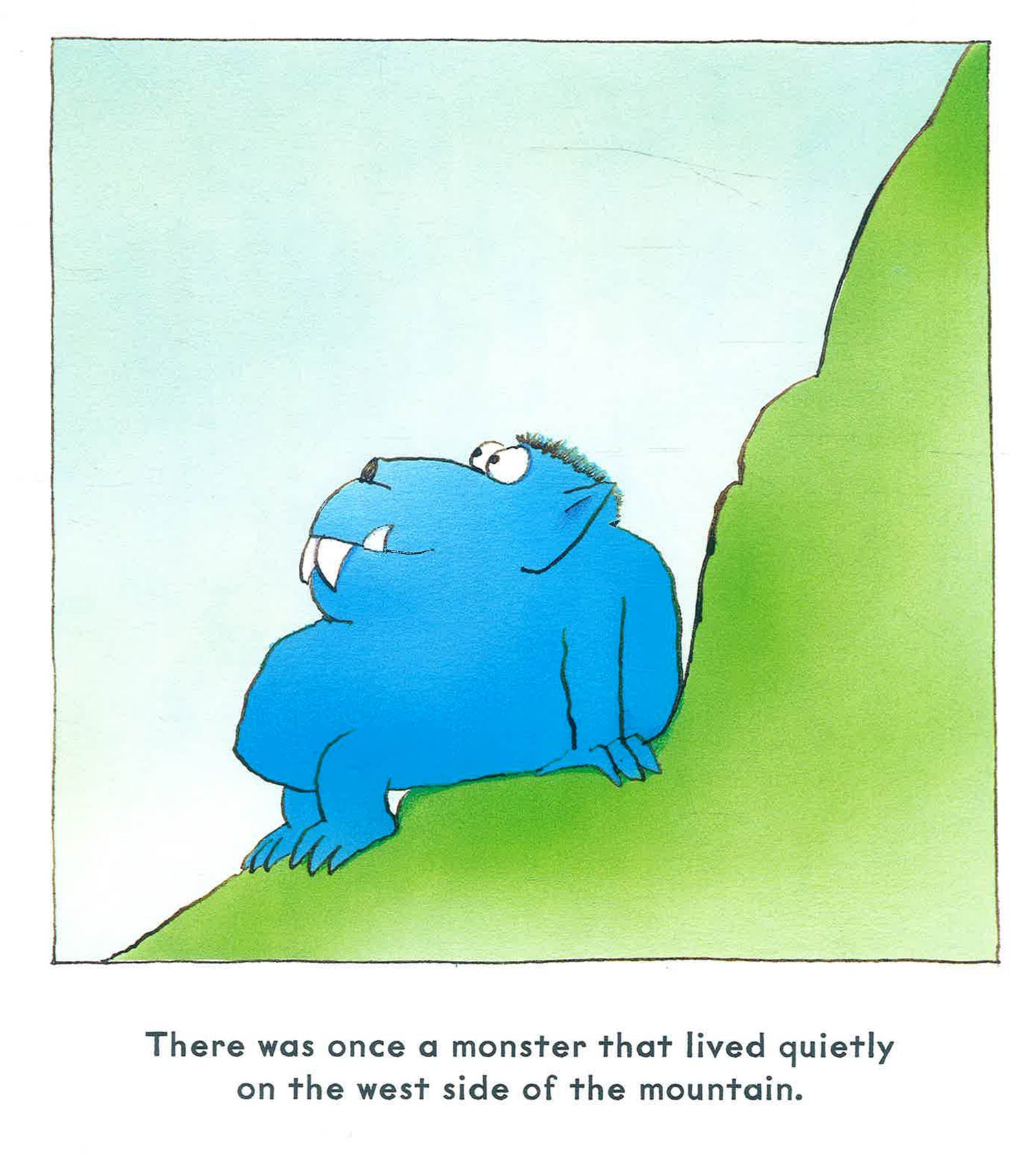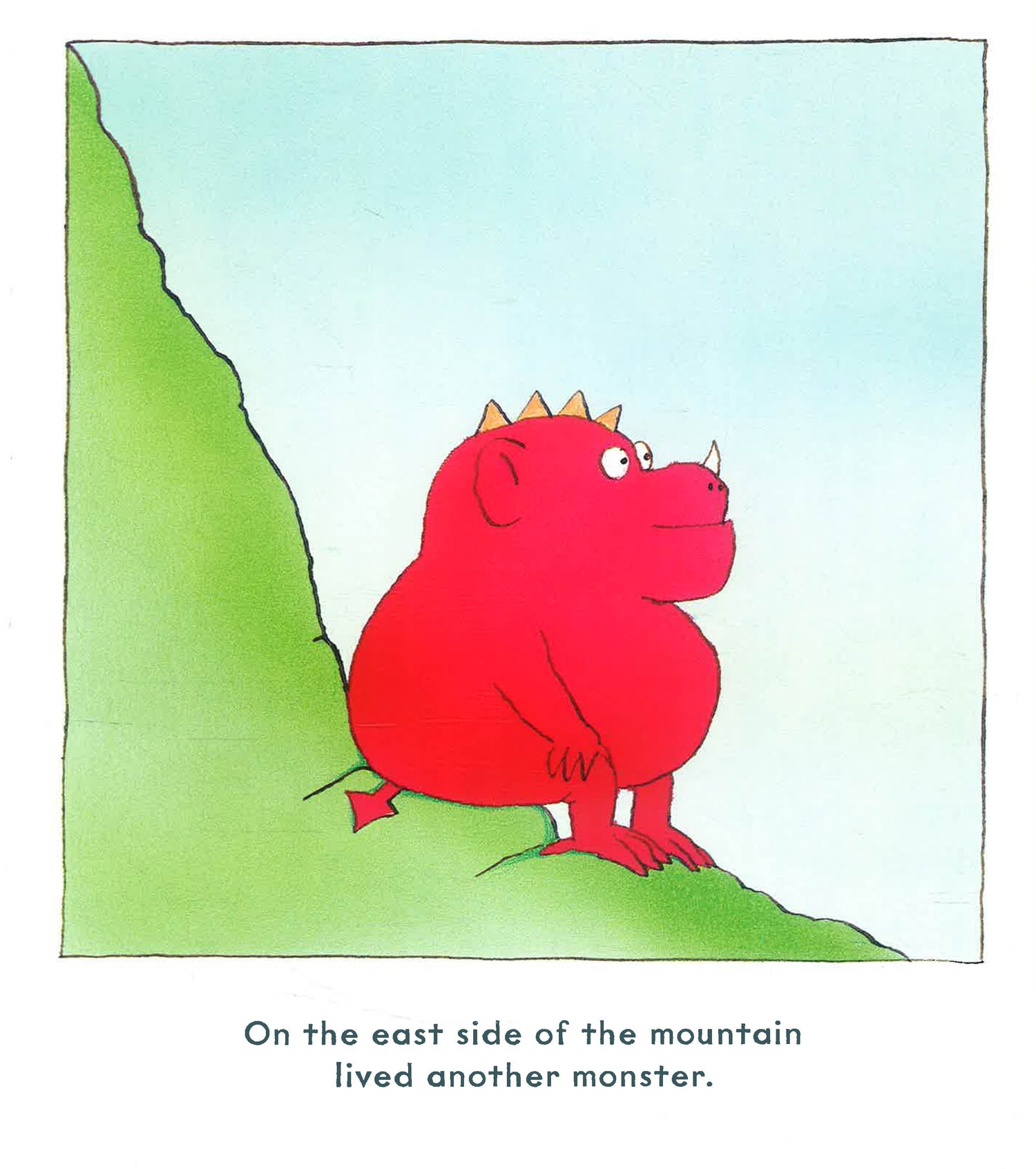 Two monsters live on either side of a mountain. Sometimes they talk through the hole in the mountain, but they never see each other. One evening, they get into a silly argument about whether day is departing or night is arriving, which escalates into a rock throwing fight, which eventually destroys the mountain, and enables the monsters to see each other's point of view and live together as friends.