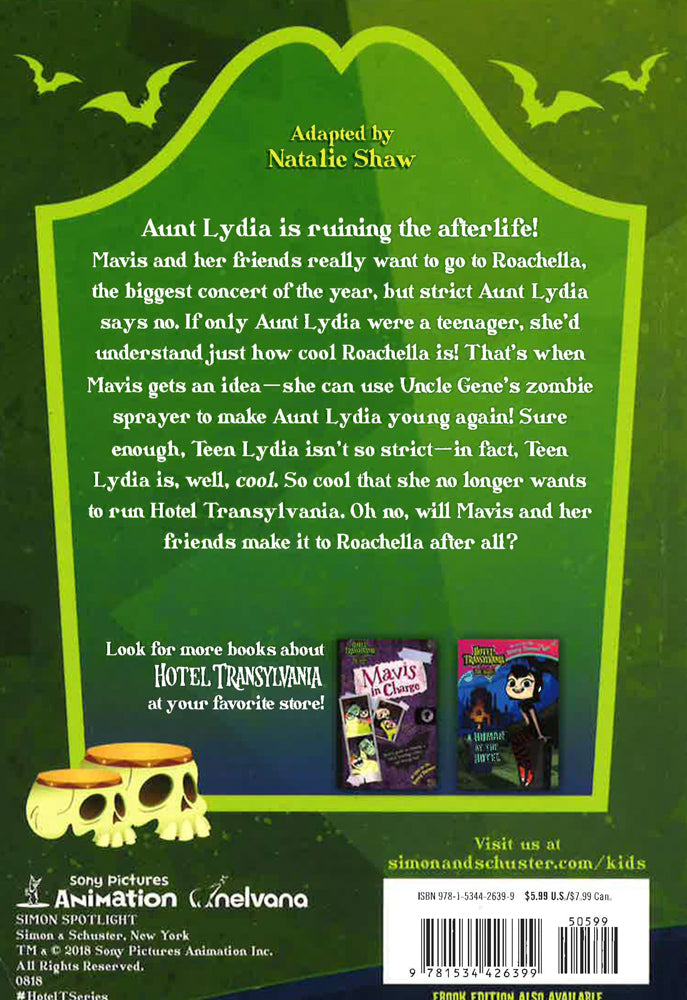 Mavis accidentally makes her Aunt Lydia young again in this hilarious novel based on an episode of the hit Disney Channel show Hotel Transylvania: The Series.Aunt Lydia is ruining the afterlife! Mavis and her friends really want to go to Roachella, the biggest concert of the year, but strict Aunt Lydia says no. If only Aunt Lydia were a teenager, she'd understand just how cool Roachella is! That's when Mavis gets an idea-she can use Uncle Gene's zombie sprayer to make Aunt Lydia young again! Sure enough, Teen Lydia isn't so uptight-in fact, Teen Lydia is, well, cool. So cool that she no longer wants to run Hotel Transylvania. If everyone goes to the concert, who will look after the hotel? Will Mavis and her friends make it to Roachella after all? (TM) & (c) 2018 Sony Pictures Animation Inc. All Rights Reserved.