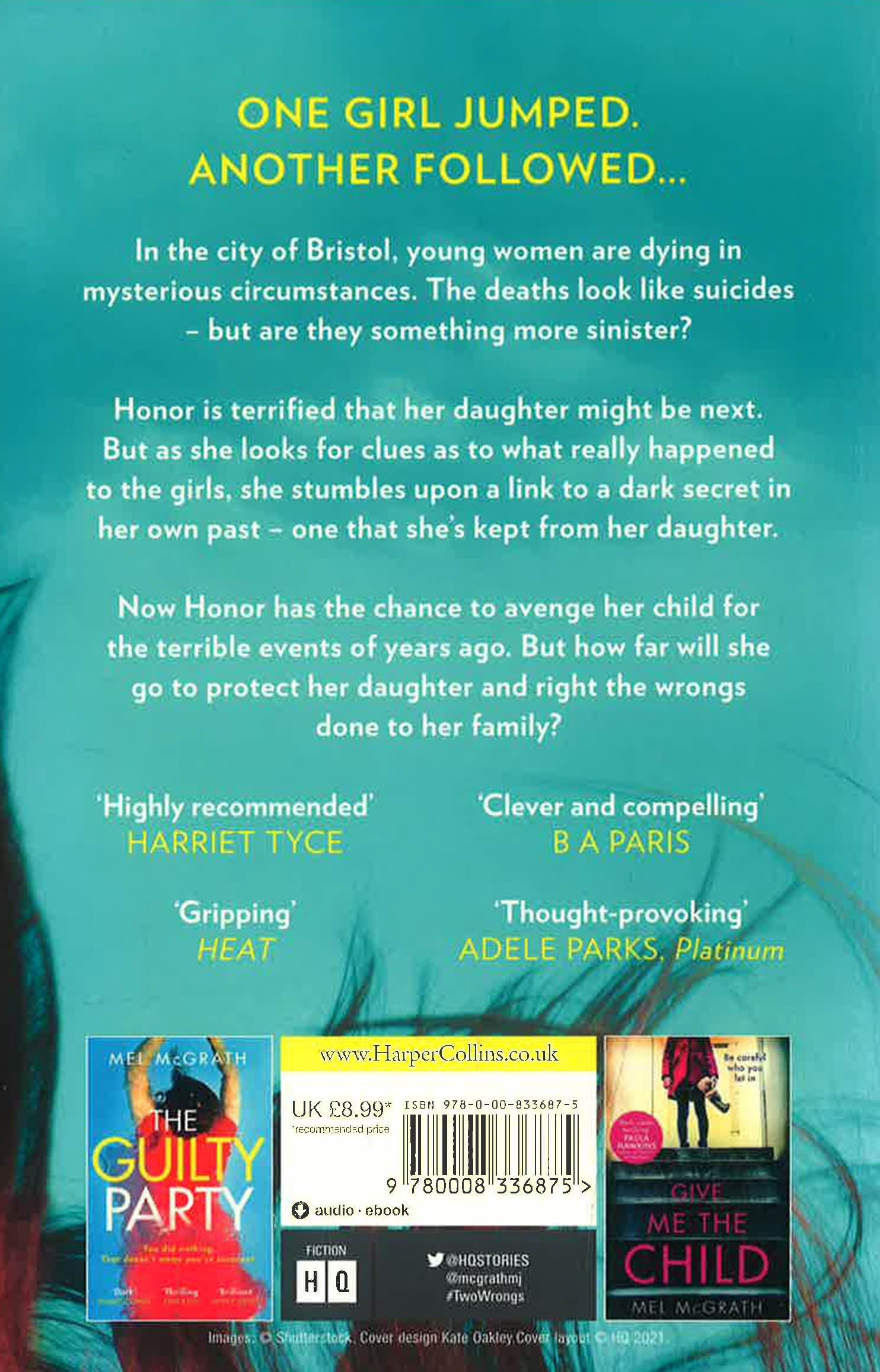 Dark, clever and page-turning, TWO WRONGS is the shocking new thriller from bestselling author Mel McGrath. 'UTTERLY chilling' PAULA HAWKINS 'The perfect read' B A PARIS 'Deliciously disturbing' ANN CLEEVES In the city of Bristol, young women are dying in mysterious circumstances. The deaths look like suicides - but are they something more sinister? Honor is terrified that her daughter might be next. But as she looks for clues as to what really happened to the girls, she stumbles upon a link to a dark secret in her own past - one that she's kept from her daughter. Now Honor has the chance to avenge her child for the terrible events of years ago. But how far will she go to protect her daughter and right the wrongs done to her family? 'I cared desperately about these characters and turned the pages frantically, praying for their survival. Clever, compassionate and completely compelling' Erin Kelly, bestselling author of Watch Her Fall 'I was completely drawn in... a timely addition to the academic noir genre, as #MeToo finally starts to catch up with universities in a long-awaited reckoning. Highly recommended' Harriet Tyce, bestselling author of Blood Orange 'Mel McGrath tackles hard-hitting issues in a thought-provoking way . . . a book-club novel ripe for discussion' Adele Parks, #1 bestselling author, Platinum (Book of the Month) 'An unsettling, compelling story. Mel McGrath has a unique skill for drawing flawed yet fascinating characters who captivate the reader' Rachel Abbott, author of Close Your Eyes 'I can't remember the last time I was so invested in a book' Sathnam Sanghera, The Times 'A gripping exploration of consent and power play, this is all too timely' Heat