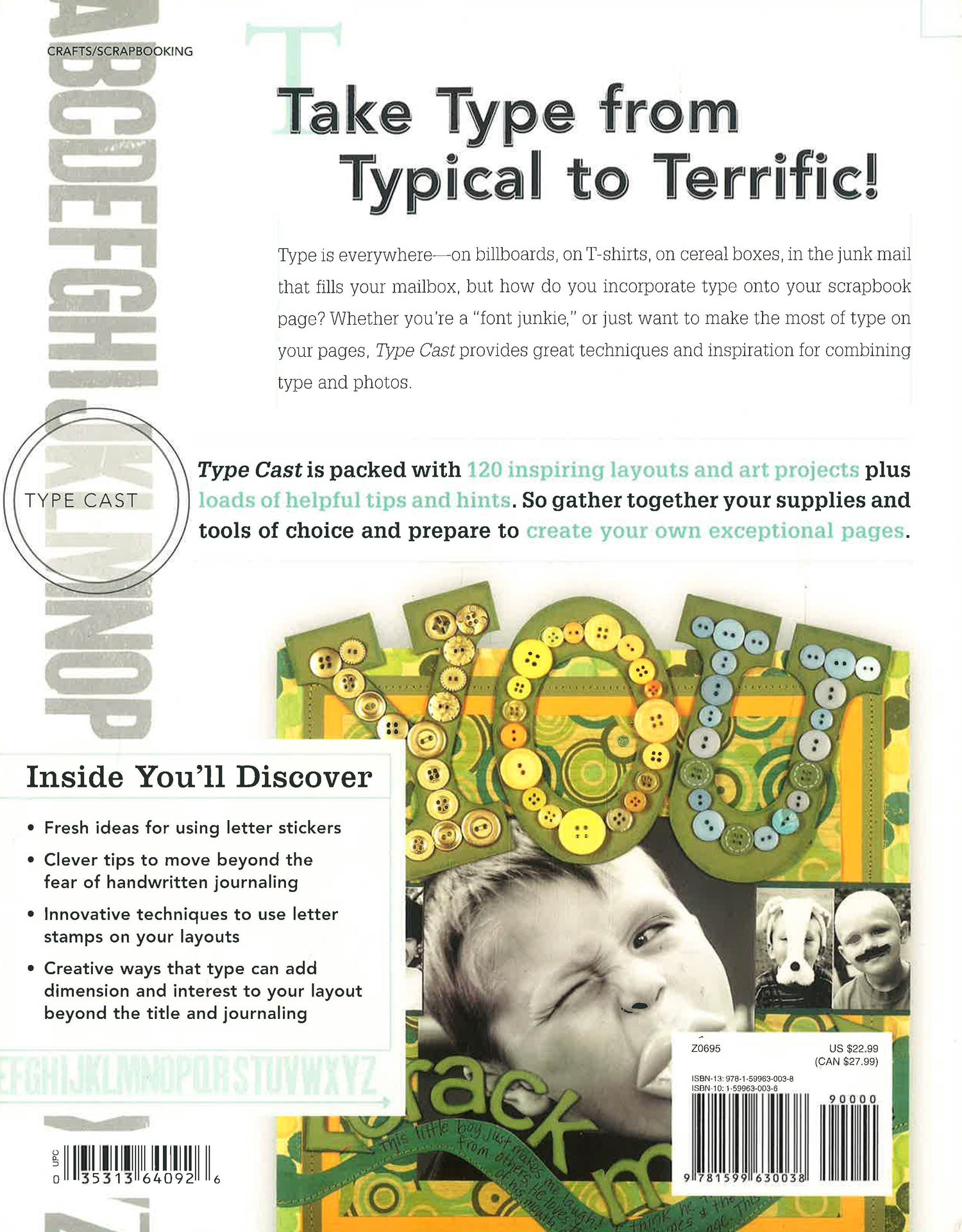 Combining learnable techniques with strong, inspiring artwork, "Type Cast" will teach readers how to get the most out of their tools, supplies, and even their own handwriting to create fabulous pages that fully integrate text into successful designs. With the help of professional scrapbook designers who love to play with type, readers will learn how to choose the perfect lettering to portray mood or theme; have fun mixing and matching letter types; integrate type into page design for good balance and proportion; create titles; and journal with maximum impact. Screen captures demonstrate ways to add digital type to handmade pages, while step-by-step photographs accompany written instruction to illustrate exciting techniques for using letter templates, stamps, die cuts and ready-mades.