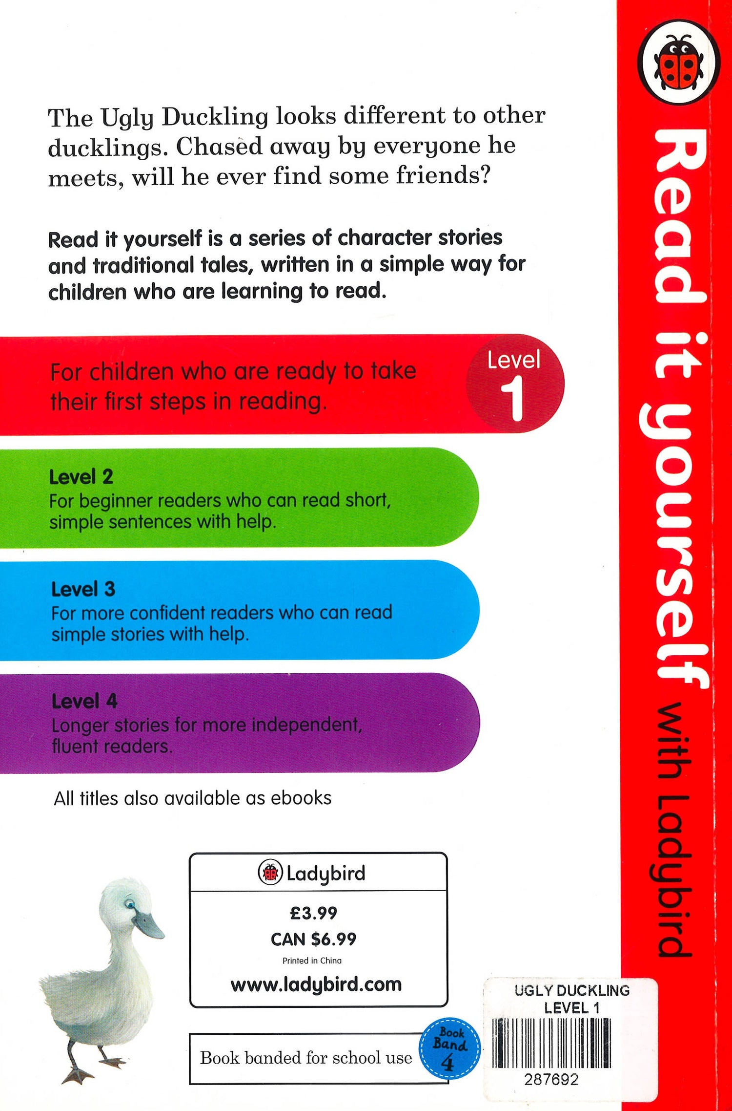 The Ugly Duckling is a Level 1 Read it yourself title, suitable for very early readers who have had some initial reading instruction and are ready to take their first steps in reading real stories. Each story is told very simply, using a small number of frequently repeated words.