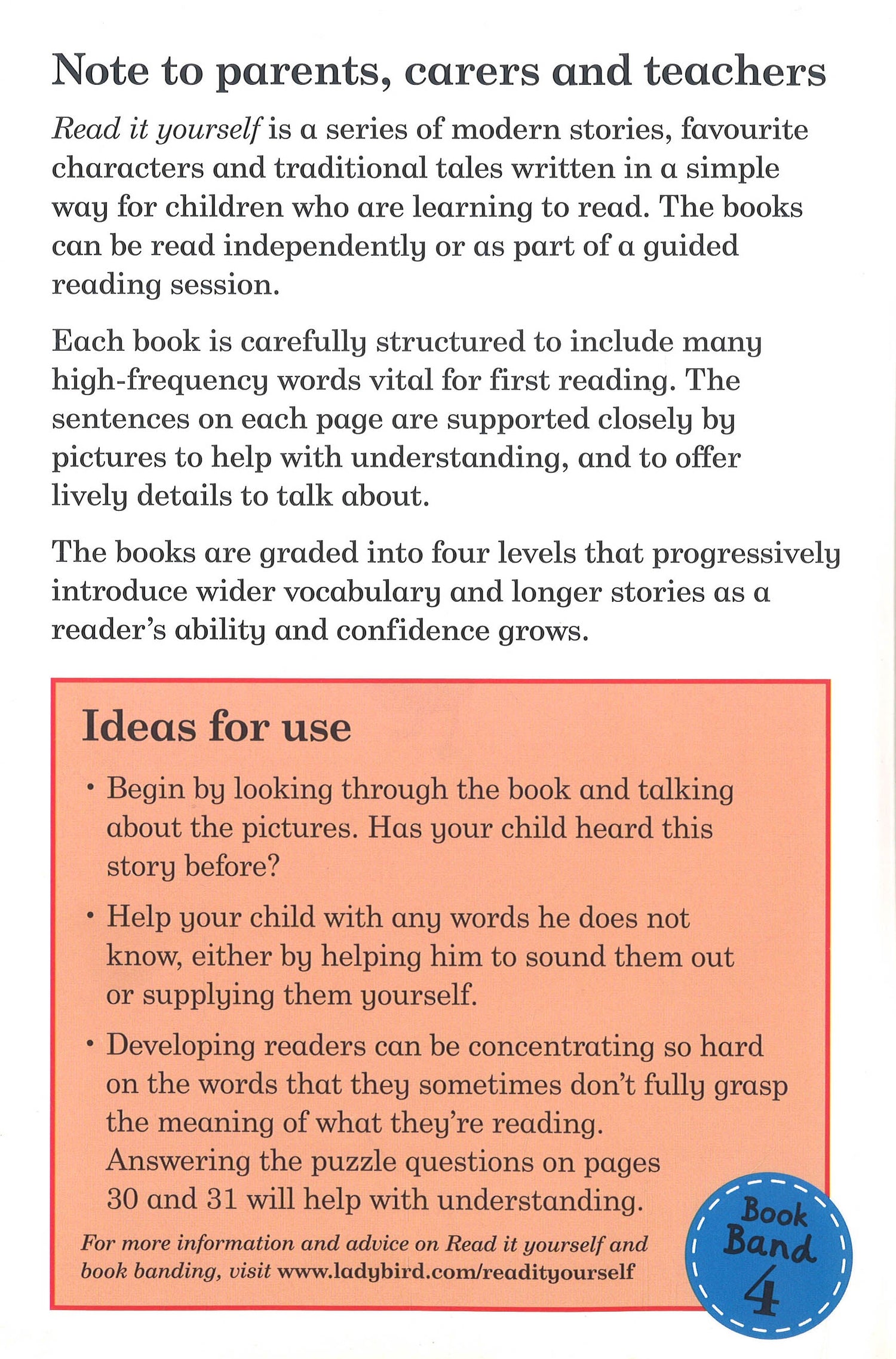 Each Read it yourself book is very carefully written to include many key, high-frequency words that are vital for learning to read, as well as a limited number of story words that are introduced and practised throughout. Simple sentences and frequently repeated words help to build the confidence of beginner readers and the four different levels of books support children all the way from very first reading practice through to independent, fluent reading.