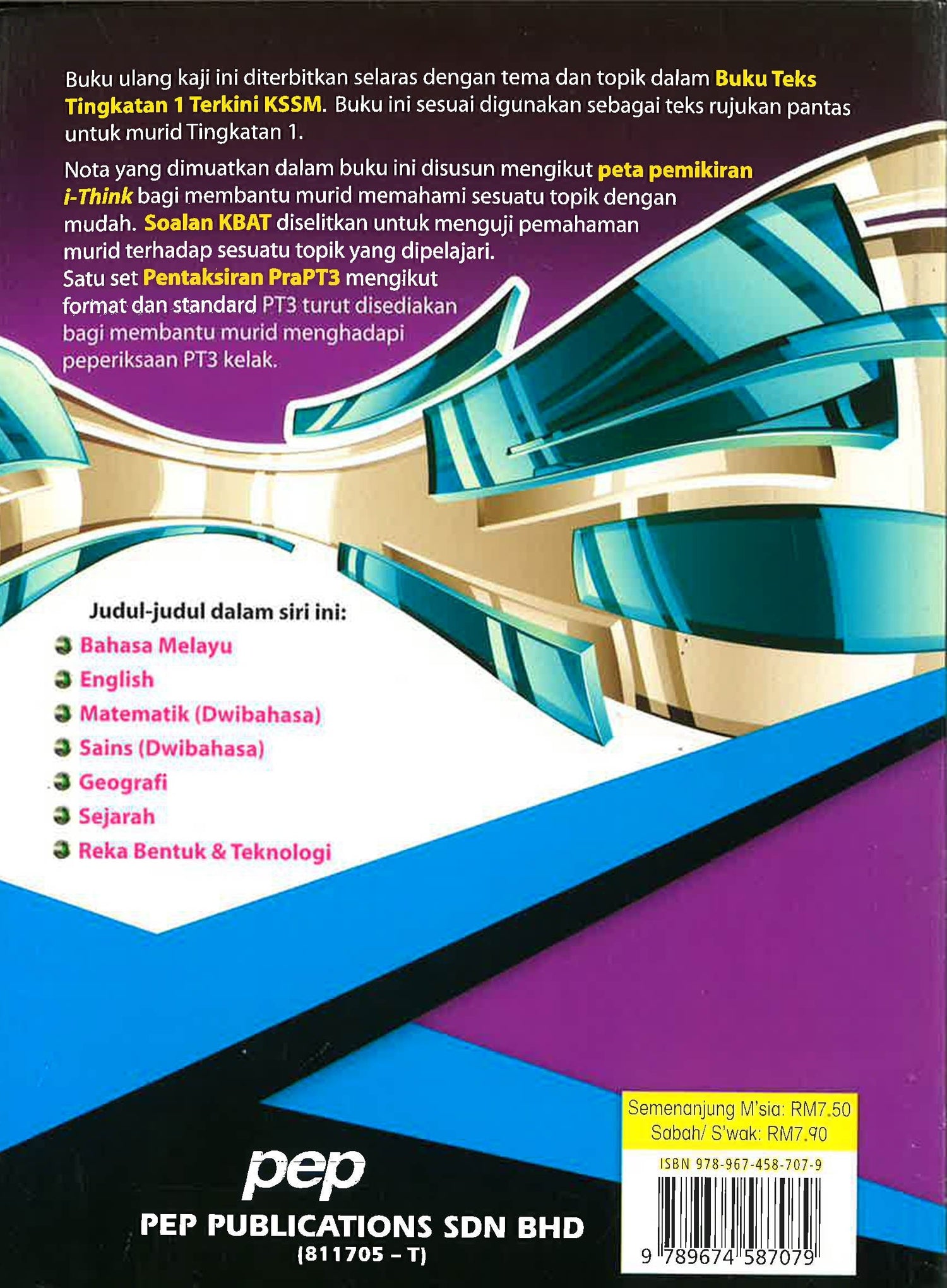 Buku ulangkaji ini diterbitkan selaras dengan tema dan topik dalam Buku Teks Tingkatan 1 Terkini KSSM. Buku ini sesuai digunakan sebagai teks rujukan pantas untuk murid Tingkatan 1. Nota yang dimuatkan dalam buku ini disusun mengikut peta pemikiran i-Think bagi membantu murid memahami sesuatu topik dengan mudah. Soalan KBAT diselitkan untuk menguji pemahaman murid terhadap sesuatu topik yang dipelajari. Satu set PentaksiranPraPT3 mengikut format dan standard PT3 turut disediakan bagi membantu murid menghadapi peperiksaan PT3 kelak.