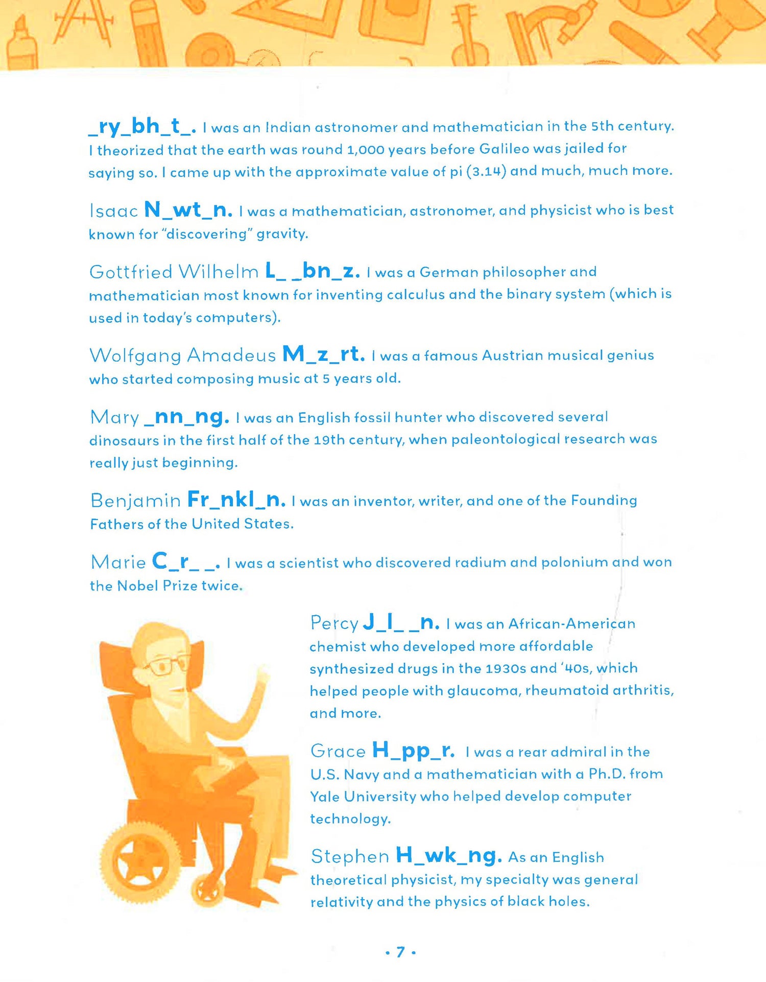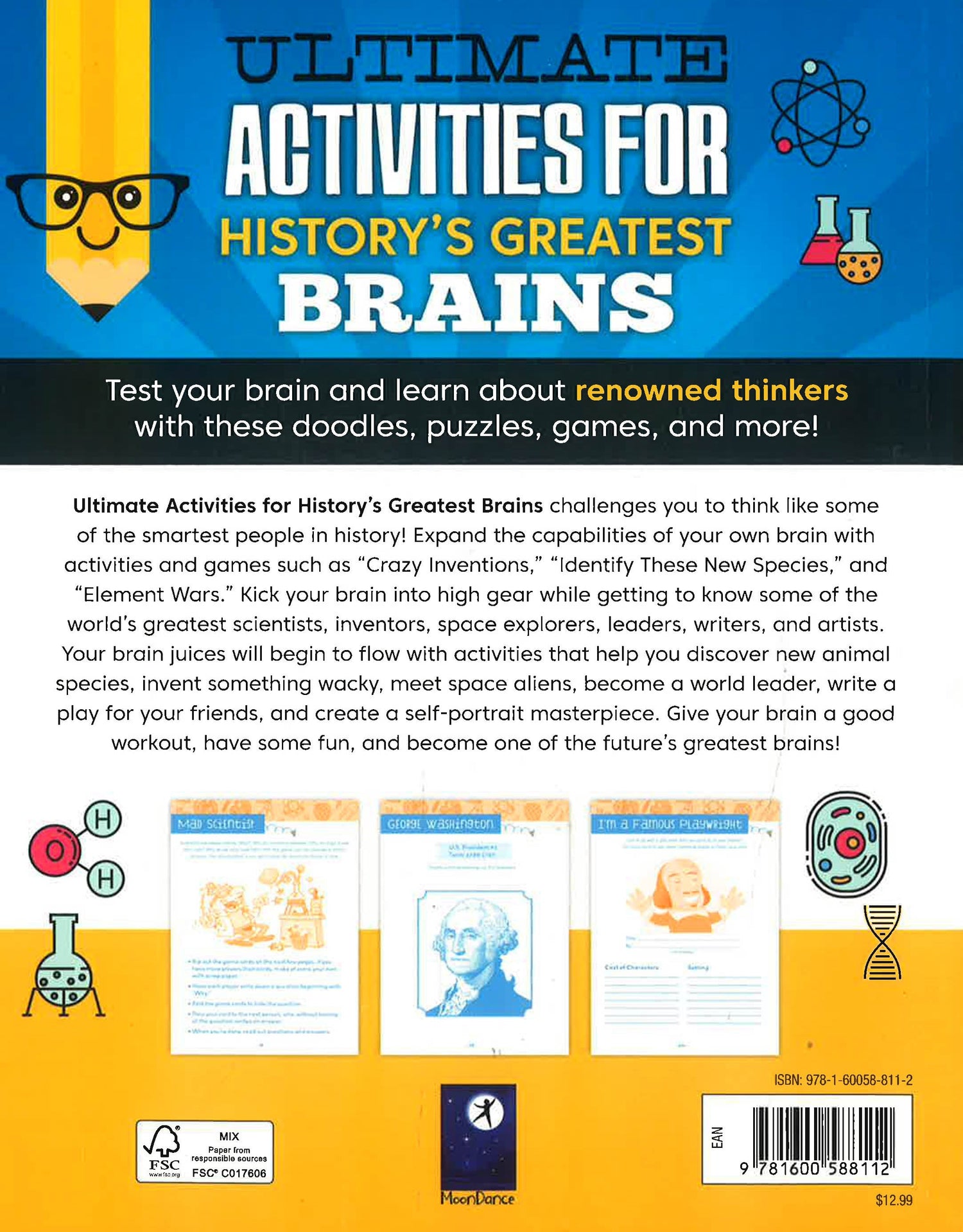 Ultimate Activities for History's Greatest Brains challenges you to think like some of the smartest people in history! Expand the capabilities of your own brain with activities and games such as 'Crazy Inventions,' 'Identify These New Species,' and 'Element Wars.' Kick your brain into high gear while getting to know some of the world's greatest scientists, inventors, space explorers, leaders, writers and artists. Your brain juices will begin to flow with activities that help you discover new animal species, invent something wacky, meet space aliens, become a world leader, write a play for your friends and create a self-portrait masterpiece. Give your brain a good workout, have some fun and become one of the future's greatest brains!