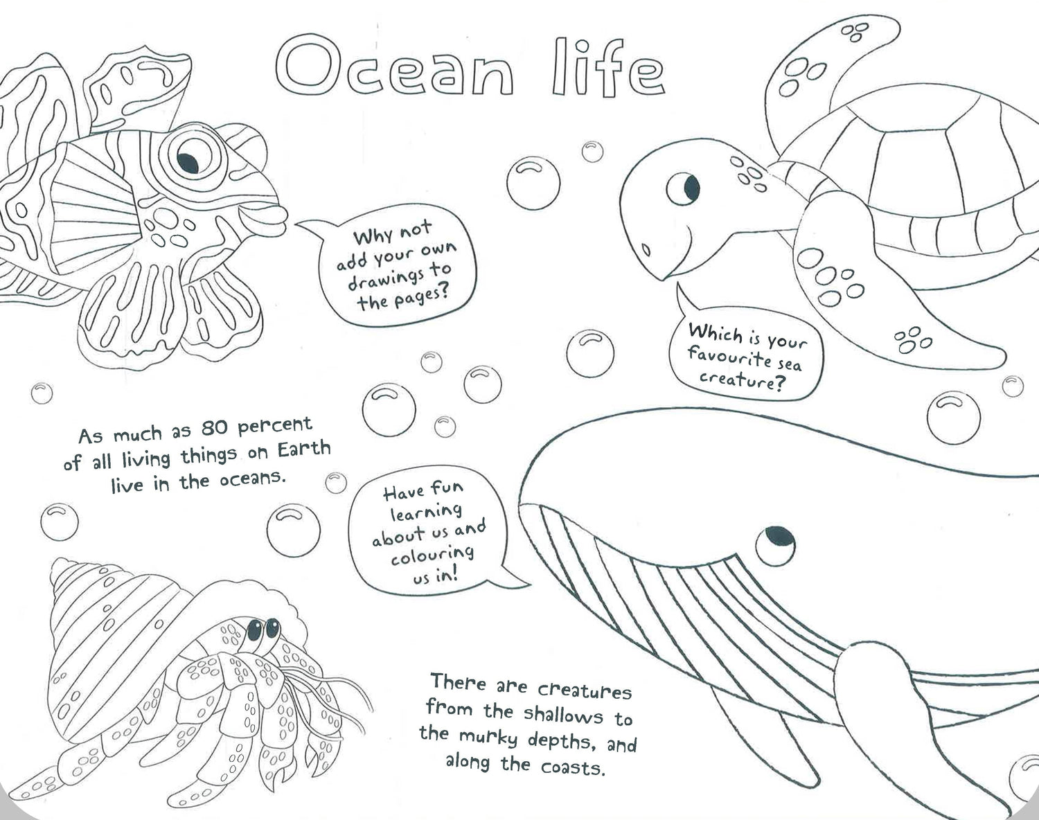 - 30+ tear-out pages to colour in, each featuring a different animal or ocean habitat