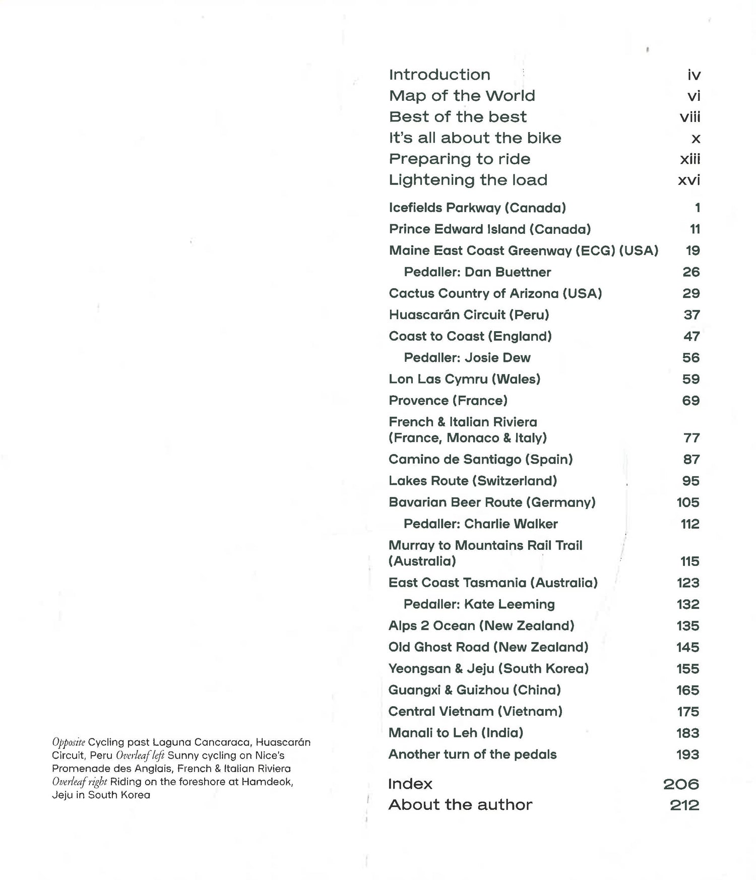 Including detailed descriptions, suggested itineraries, maps, photos and even interviews with world cyclists, the Ultimate Cycling Trips: World is the perfect guide for planning your own cycling adventure. There are trips to suit every fitness level, from riding through the Italian and French Riviera, to Canada's wildlife-rich Icefields Parkway, and the volcanic island of Jeju off the southern tip of South Korea.