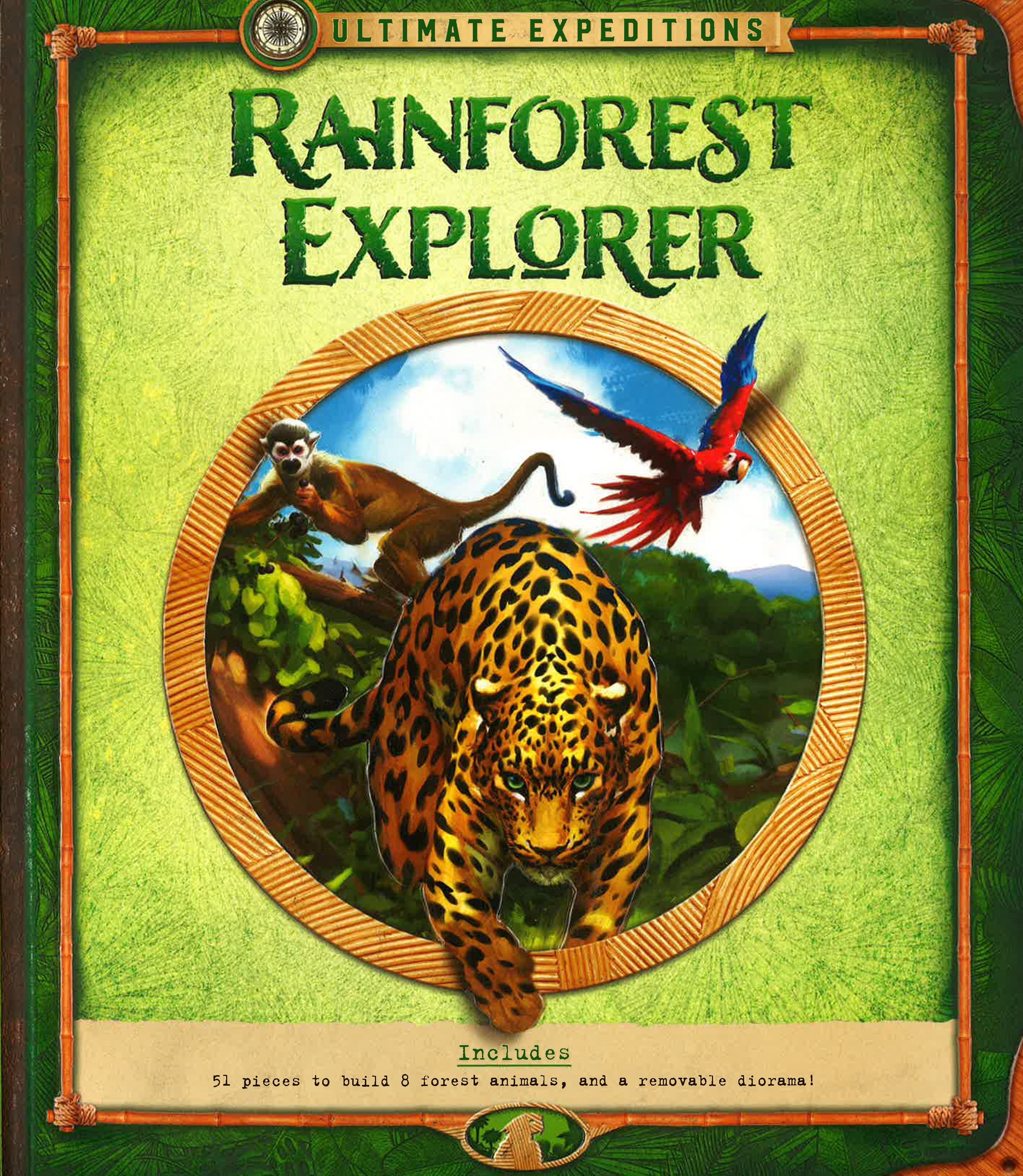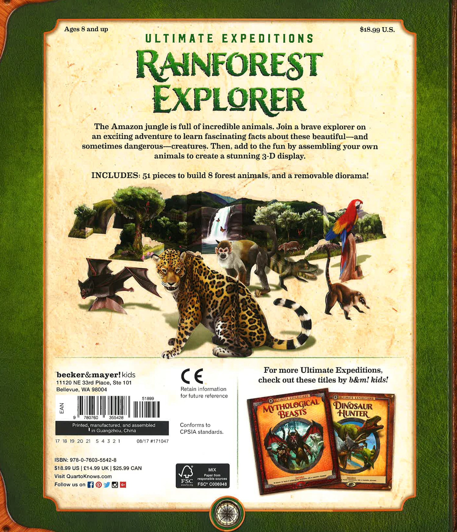 Greetings adventurer! Are you prepared to delve deep in the Amazon jungle? Ultimate Expeditions Rainforest Explorer will take you to a place where awe-inspiring adventure awaits... but so does danger! The world's most massive rain forest promises both beauty and peril. Ultimate Expeditions Rainforest Explorer presents young readers with the thrilling tales of famed explorer Harold Bennington. Harold has just returned from an exciting research expedition where he recorded his observations of the most magnificent creatures he has ever encountered. From pink river dolphins, to blood-drinking vampire bats, to fierce jaguars, these rare, beautiful beasts are described so vividly they seem to pounce off the page! Ultimate Expeditions Rainforest Explorer comes complete with illustrations, maps, photos, and facts, making it the perfect companion for any aspiring adventurer. As an added bonus, each of Mr. Bennington's eight animal profiles come with assembly instructions and all the materials you need to make your own 3-D model.