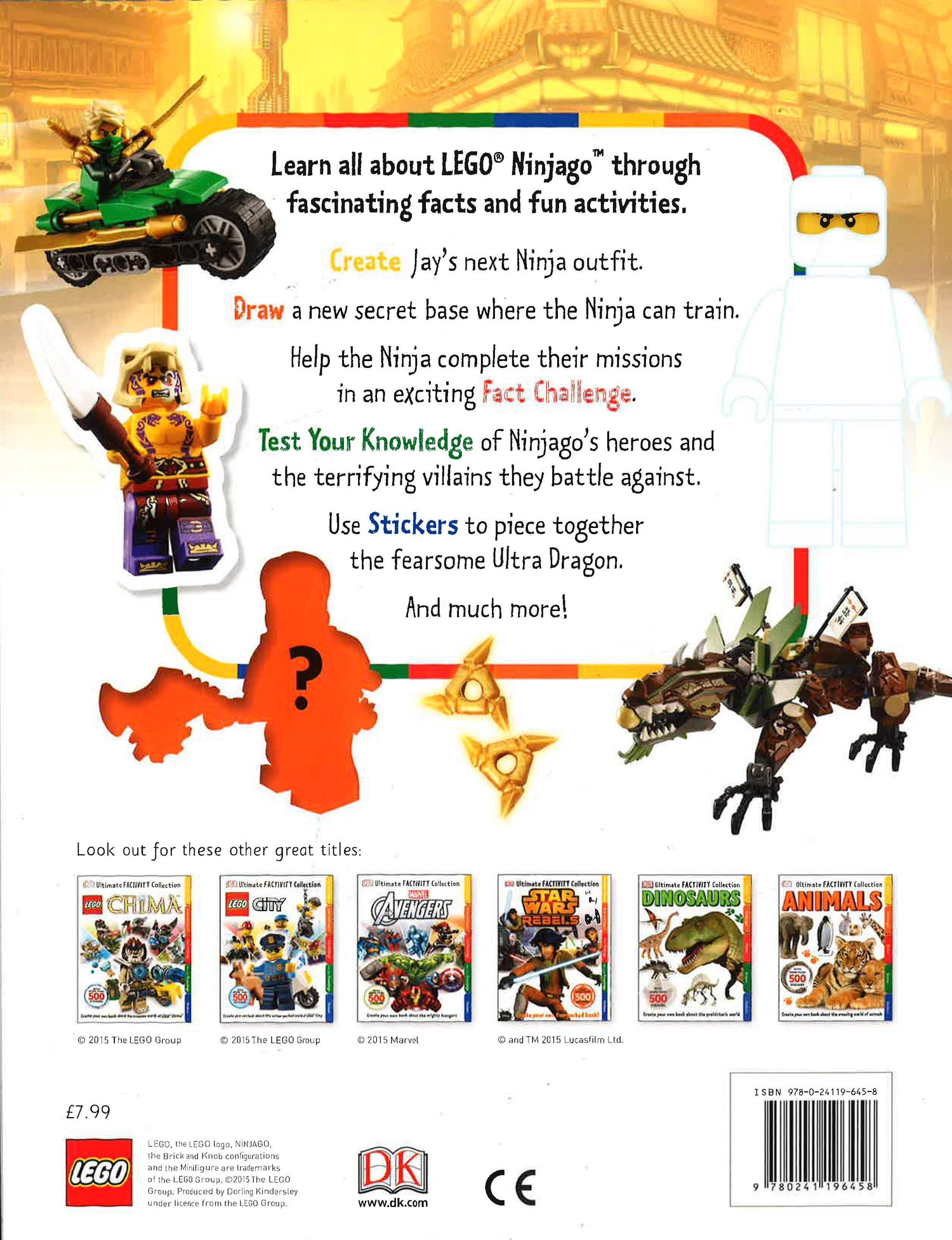 This fact-packed LEGO (R) NINJAGO (R) activity book is filled with adventures. It combines cool facts about the Ninja and their enemies with fun activities. Learn all about the Ninja through games and sticker activities. Discover their amazing weapons and vehicles, and become as wise as Master Wu. Engaging LEGO NINJAGO facts are discovered through each activity, while fun challenges and interesting puzzles inspire creativity.LEGO, the LEGO logo, NINJAGO, the Brick and Knob configurations and the Minifigure are trademarks of the LEGO Group. (c)2015 The LEGO Group. Produced by Dorling Kindersley under licence from the LEGO Group.
