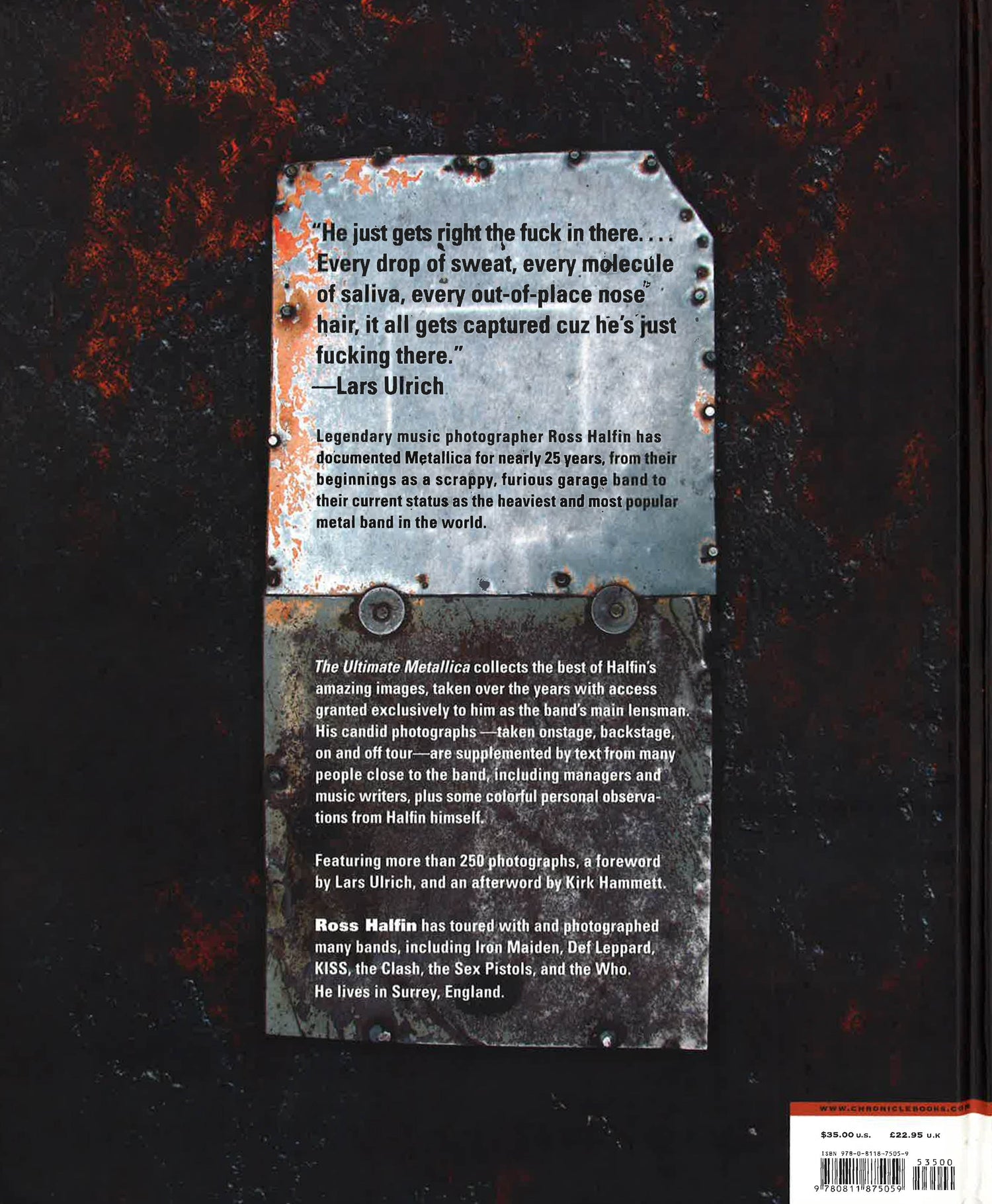 Legendary music photographer Ross Halfin has documented Metallica for nearly 25 years, from their beginnings as a scrappy, furious garage band to their current status as the heaviest and most popular metal band in the world. The Ultimate Metallica collects the best of Halfin's amazing images, taken over the years with access granted exclusively to him as the band's main lensman. His candid photographs-taken on stage, backstage, on and off tour-are supplemented by text from many people close to the band, including managers and music writers, plus some colorful personal observations from Halfin himself."