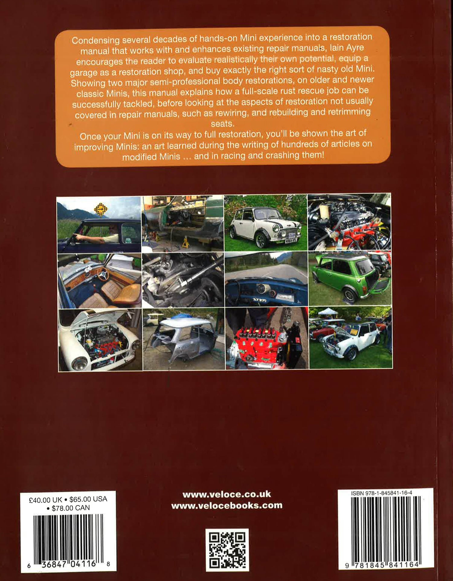 Condensing several decades of hands-on Mini experience into a restoration manual that works with and enhances existing repair manuals, Iain Ayre encourages the reader to evaluate realistically their own potential, equip a garage as a restoration shop, and buy exactly the right sort of nasty old Mini.