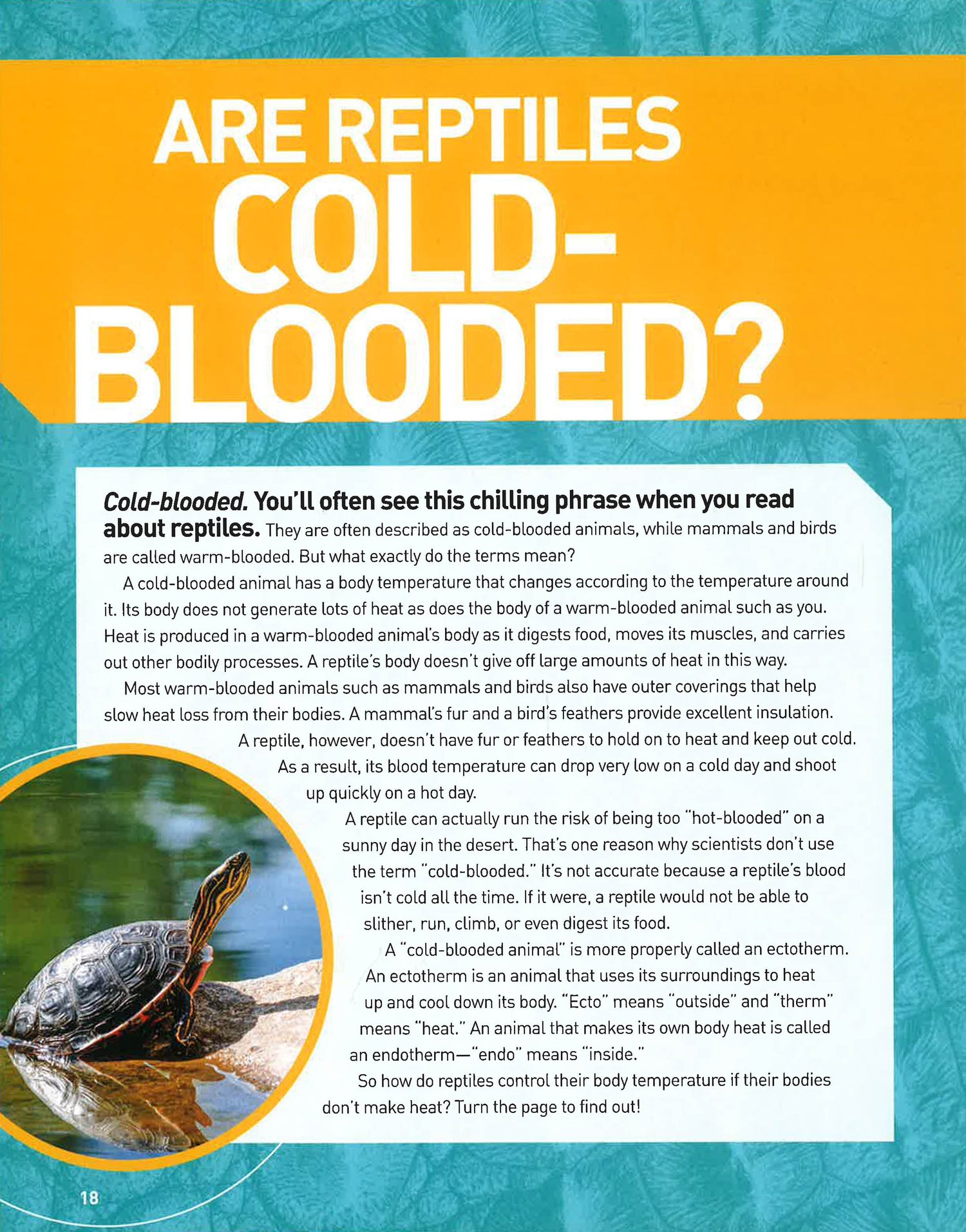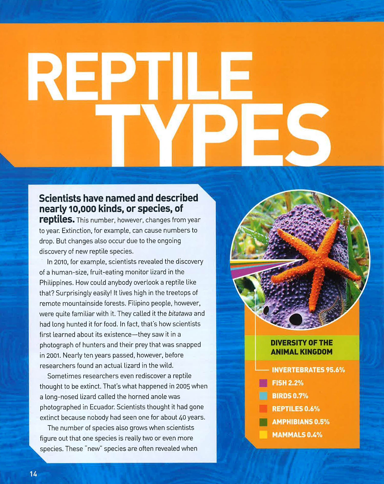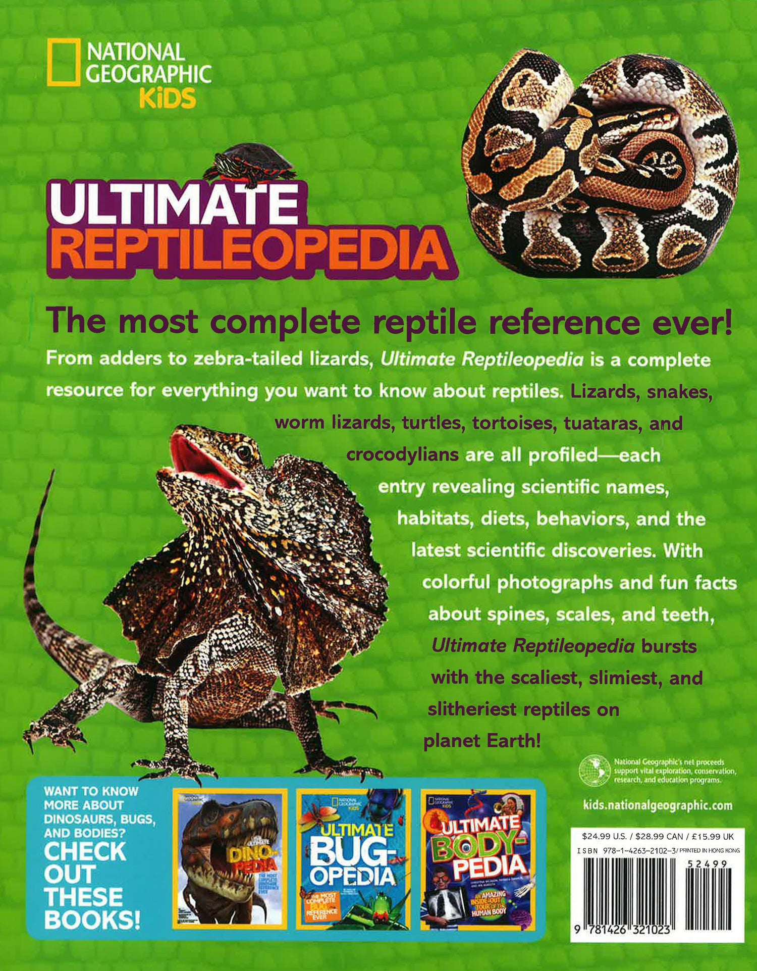 The natural world experts at National Geographic present the ultimate reference book on reptiles, designed just for kids. Crawling with fascinating facts, lively text, and tons of cool, colourful, images of the weirdest and wackiest reptiles on planet Earth. Snakey, slimey, scaley, and sensational! Welcome to the amazing world of the most popular reptiles on Earth. With colourful photographs and fun facts, this easy-to-use encyclopaedia profiles snakes, lizards, amphibians, turtles and tortoises, crocodilians, and tuatara. Profiles are accompanied by Did You Know? details and fast facts including scientific name, size, diet, and habitat.