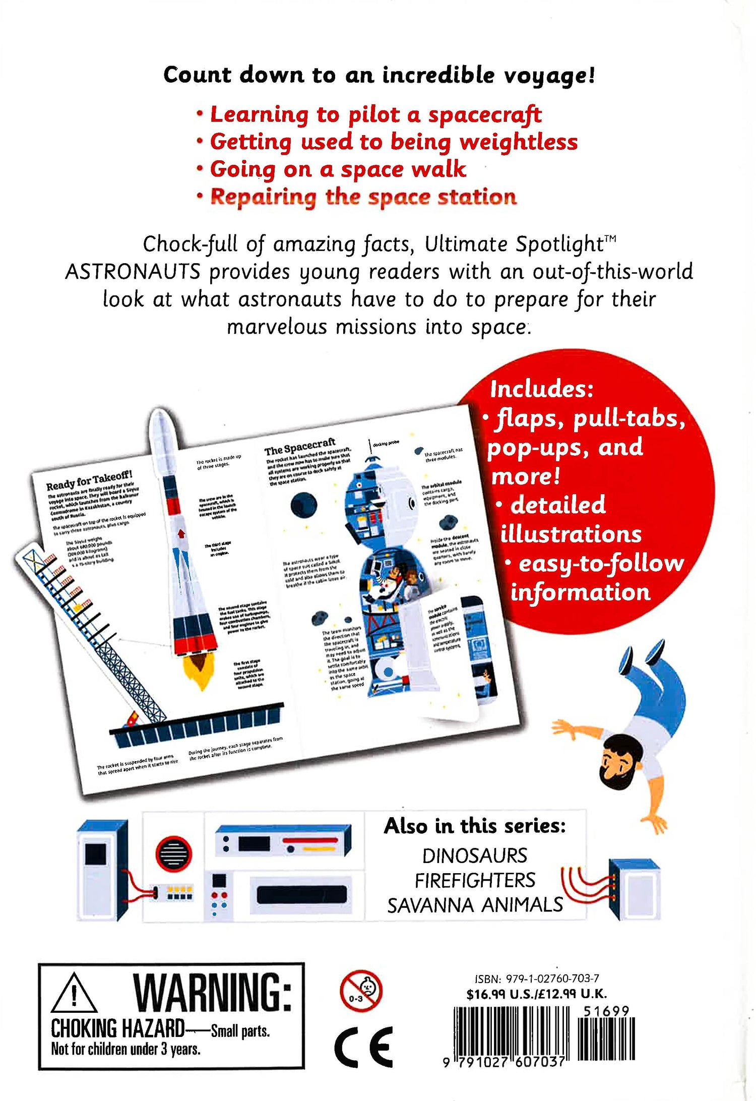 Count down to an incredible voyage! * Learning to pilot a spacecraft * Getting used to being weightless * Going on a space walk * Repairing the space station Chock-full of amazing facts, Ultimate SpotlightTM Astronaut provides young readers with an out-of-this-world look at what astronauts have to do to prepare for their marvelous missions into space. Includes flaps, pull-tabs, pop-ups, and more!