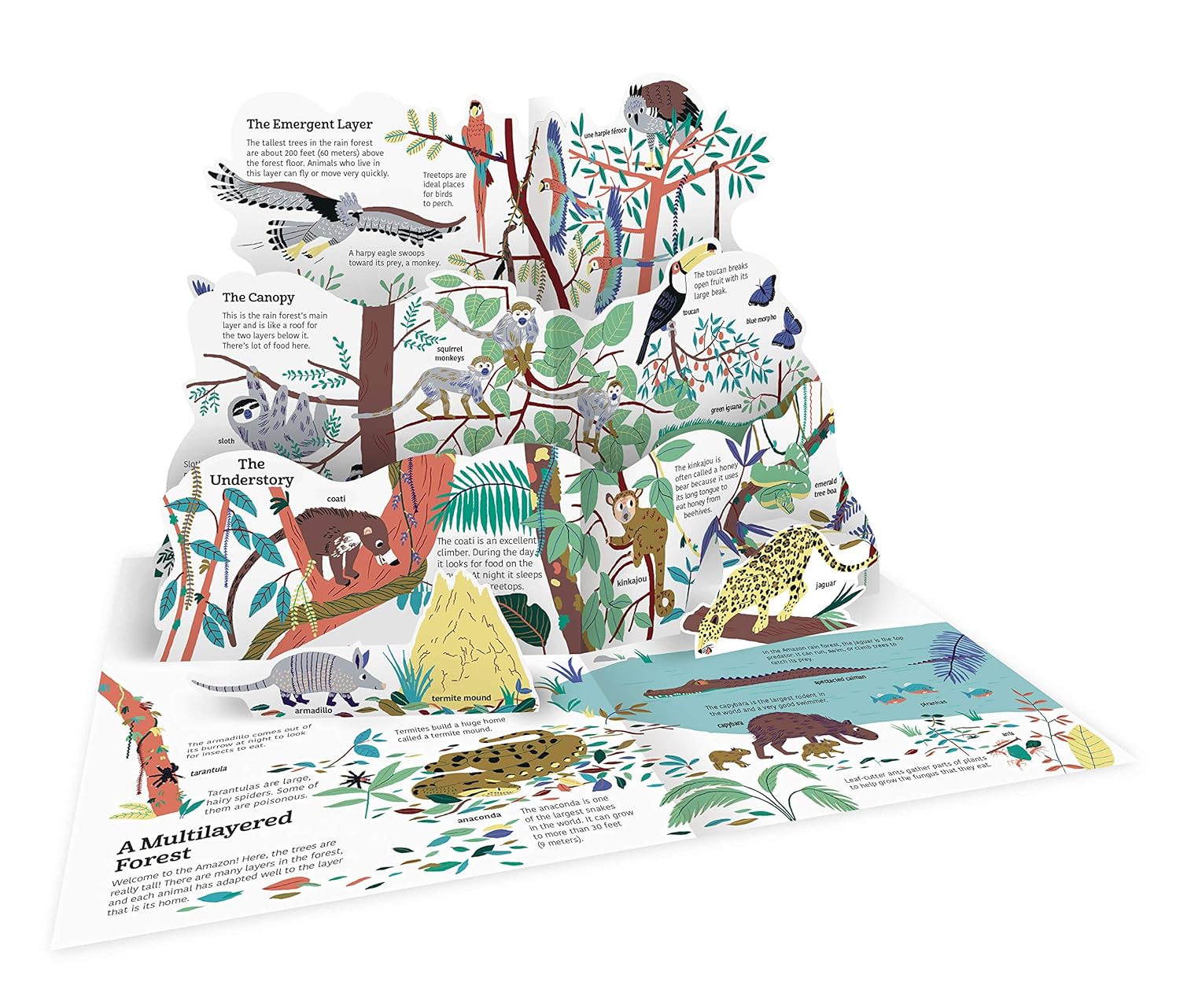 Discover animals in rain forests around the world: Turn a page to reveal a grand pop-up of the different layers of the rain forest, rotate a wheel to see bonobos at play, and open big flaps to uncover animals at night.