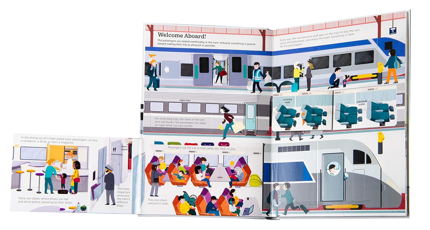 Discover the wonderful world of trains: Pull a tab to open train doors, life flaps to see inside a train car, or turn a wheel to see different types of trains. Chock-full of age appropriate information, this book is an exciting introduction for young train and transportation enthusiasts.