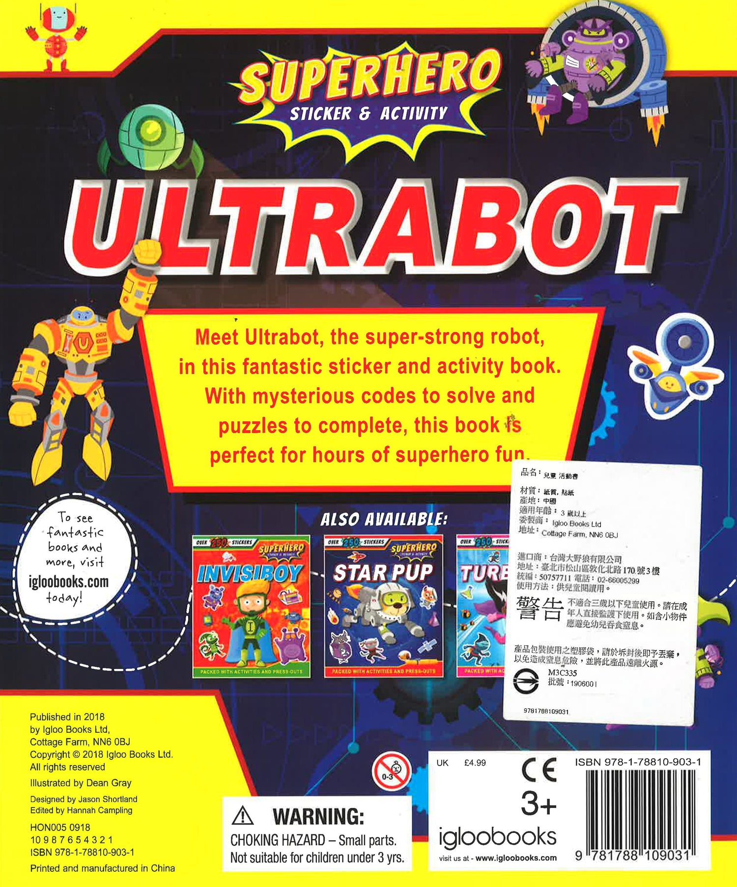 Meet Ultrabot, the super-strong robot, in this fantastic sticker and activity book. With mysterious codes to solve and puzzles to complete, this book is perfect for hours of superhero fun. (Age Range 4-6)