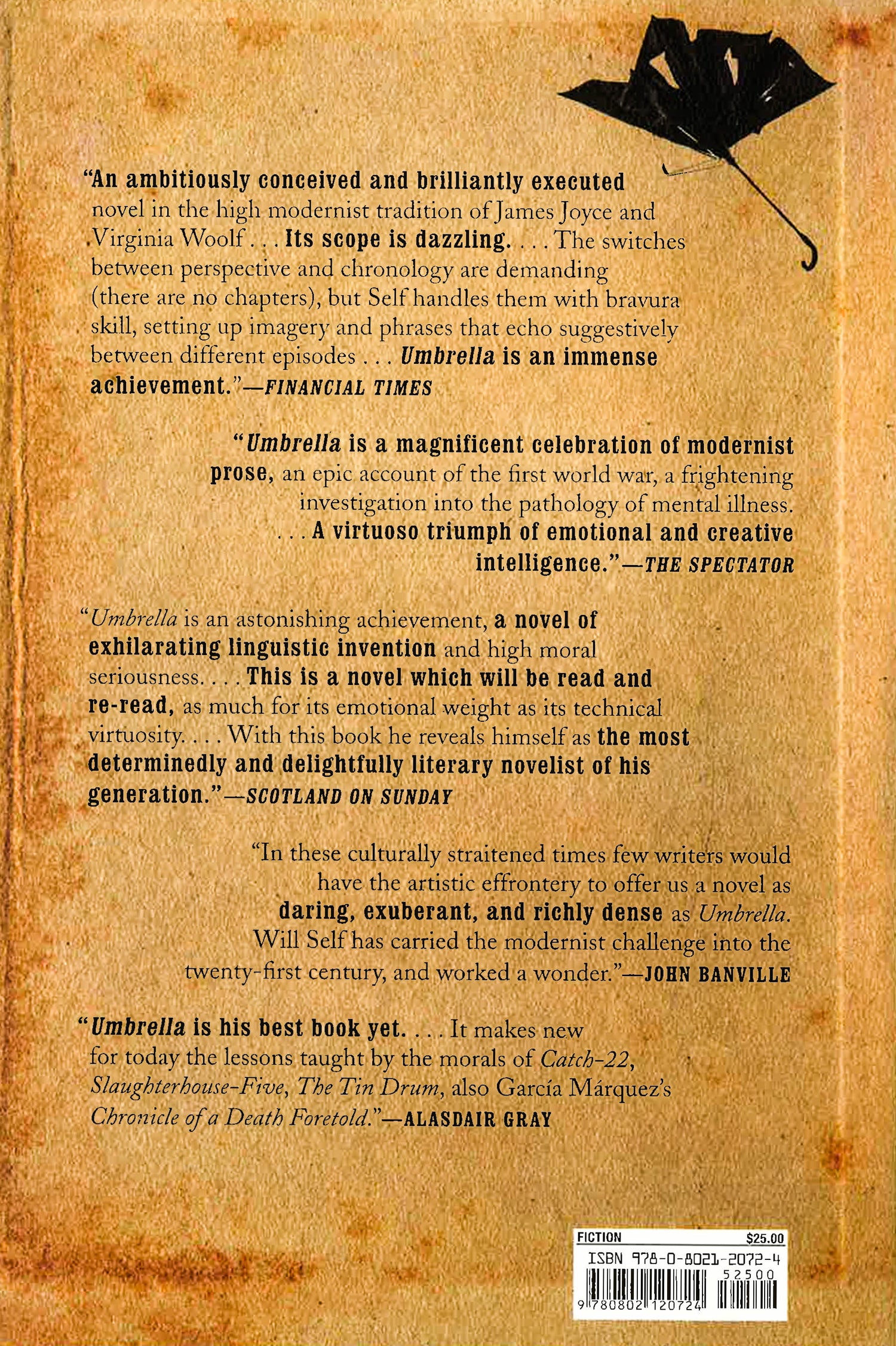 Radical and uncompromising, Umbrella is a tour de force from one of England s most acclaimed contemporary writers, and Self s most ambitious novel to date. Moving between Edwardian London and a suburban mental hospital in 1971, Umbrella exposes the twentieth century s technological searchlight as refracted through the dark glass of a long term mental institution. While making his first tours of the hospital at which he has just begun working, maverick psychiatrist Zachary Busner notices that many of the patients exhibit a strange physical tic: rapid, precise movements that they repeat over and over. One of these patients is Audrey Dearth, an elderly woman born in the slums of West London in 1890. Audrey s memories of a bygone Edwardian London, her lovers, involvement with early feminist and socialist movements, and, in particular, her time working in an umbrella shop, alternate with Busner s attempts to treat her condition and bring light to her clouded world. Busner s investigations into Audrey s illness lead to discoveries about her family that are shocking and tragic."