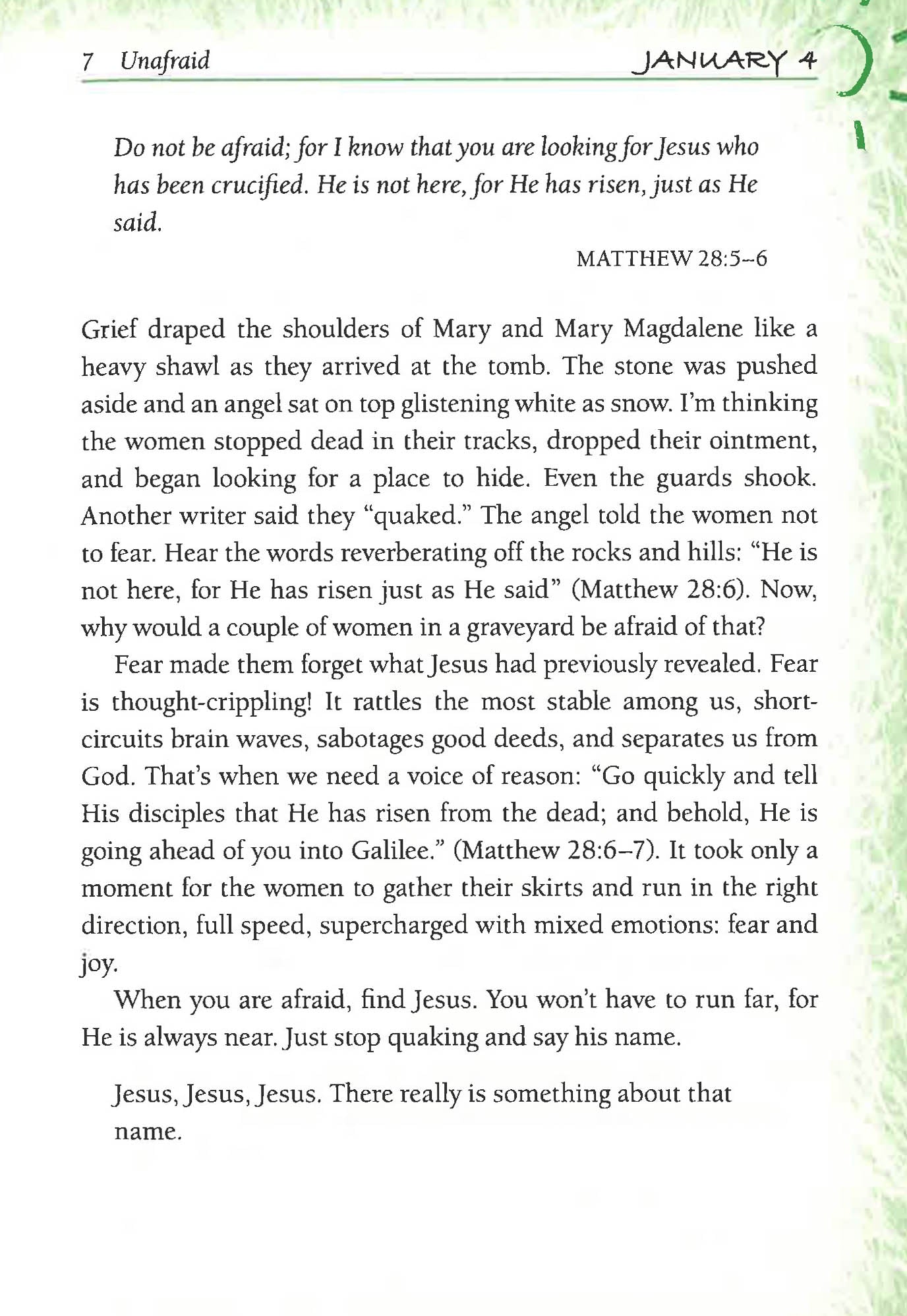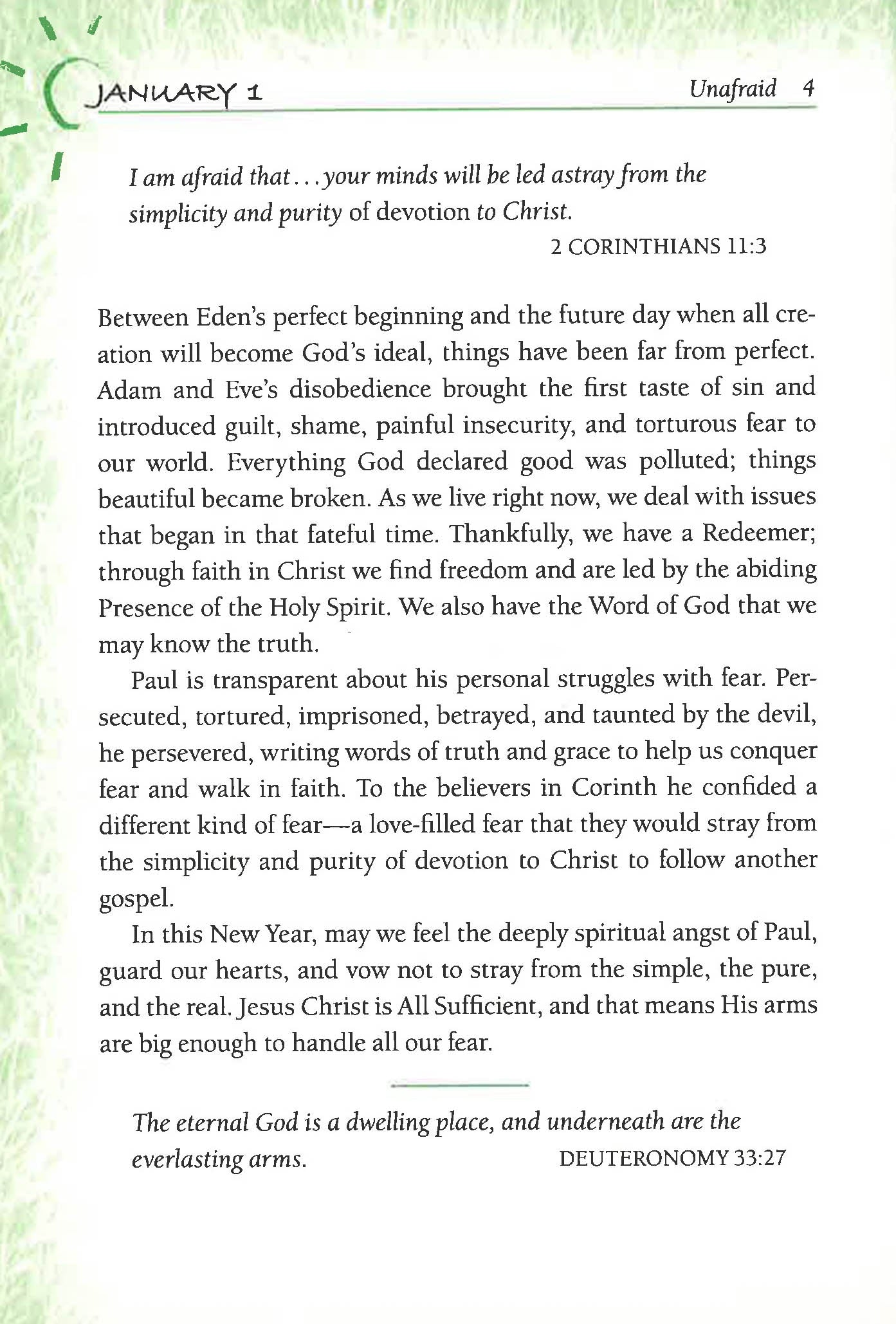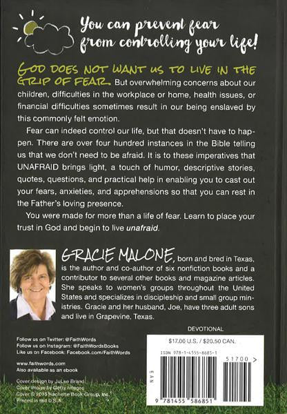 To live without fear is one of the most challenging goals anyone can make in life. Fear lurks in the deep recesses of the human heart and surprises even the most mature and courageous Christian. There are over 400 instances in the Bible of God telling His children to be unafraid. If repetition has anything to do with how important something is, then this was a big one. But rather than being a command or admonition, the tone spoken in turn by God, angels, and disciples is compelling and encouraging, like a parent comforting a fearful child. In UNAFRAID, Gracie Malone provides a daily touch of humor, stories, quotes, prayers, and encouragement to everyone who is fighting to trust in the only One who can take their fear away.