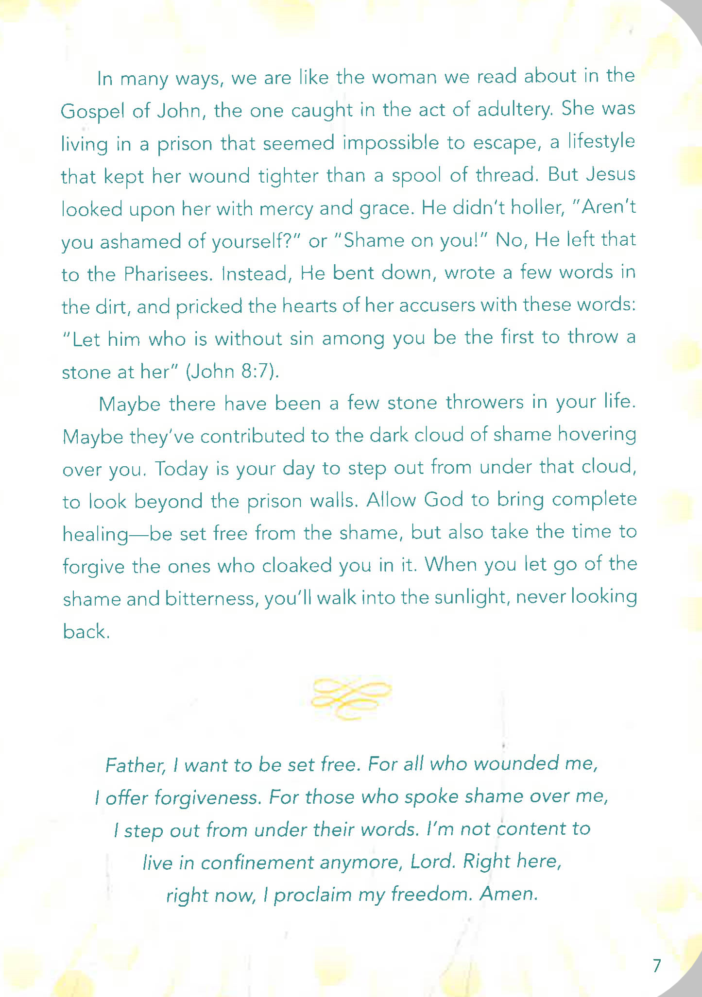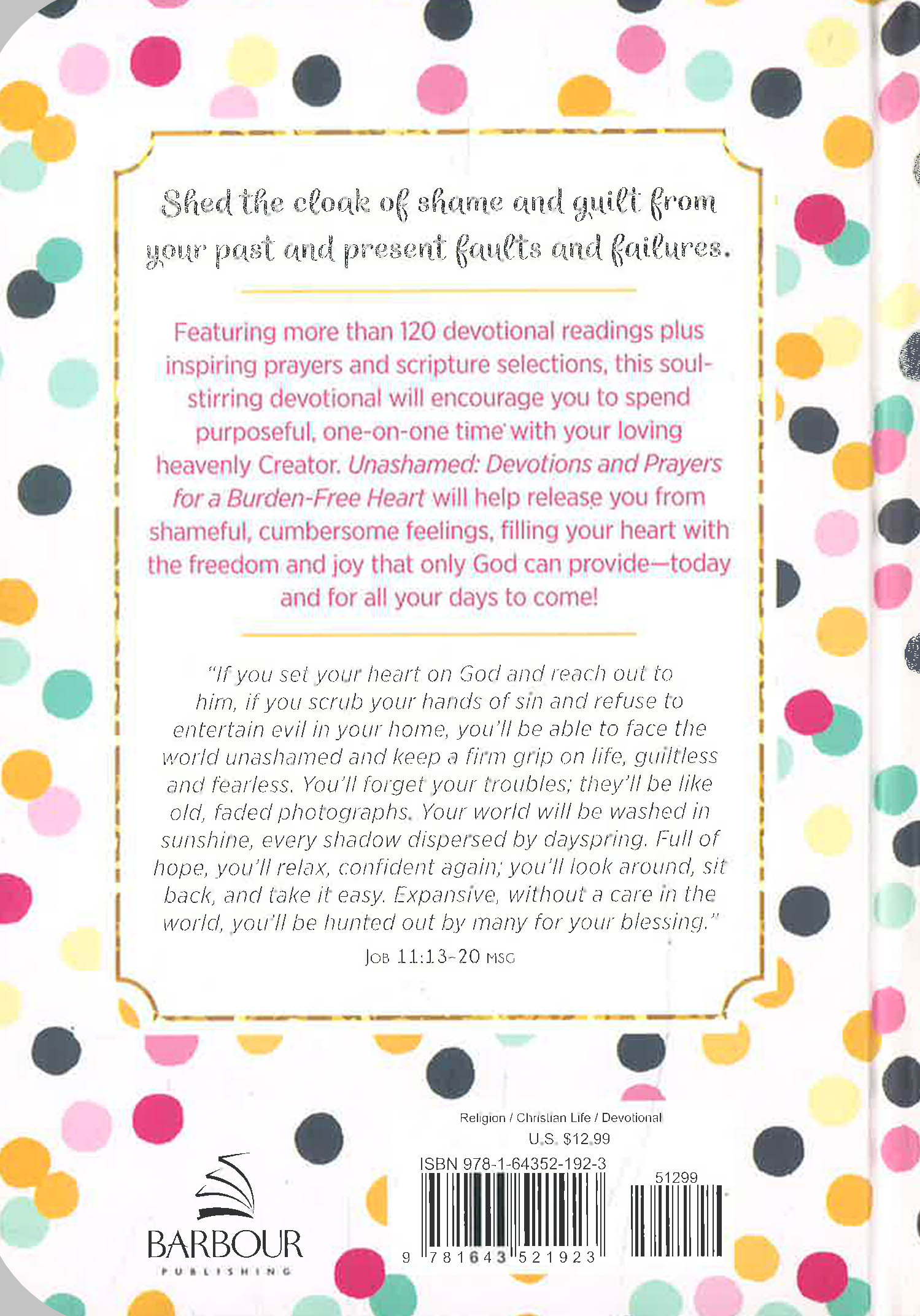 Featuring more than 120 devotional readings plus inspiring prayers and scripture selections, this soul-stirring devotional will encourage you to spend purposeful, one-on-one time with your loving heavenly Creator. Unashamed: Devotions and Prayers for a Burden-Free Heart will help release you from shameful, cumbersome feelings, filling your heart with the freedom and joy that only God can provide--today and for all your days to come!