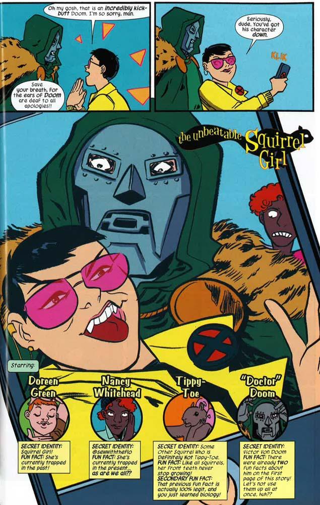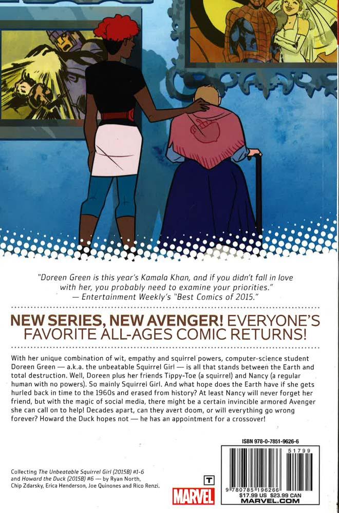 New series, New Avenger! With her unique combination of wit, empathy and squirrel powers, computer science student Doreen Green - aka the unbeatable Squirrel Girl - is all that stands between the Earth and total destruction. Well, Doreen plus her friends Tippy-Toe (a squirrel) and Nancy (a regular human with no powers). So, mainly Squirrel Girl. Then what hope does the Earth have if she gets hurled back in time to the 1960s and erased from history? At least Nancy will never forget her friend, but what invincible armored Avenger can she call on to help, through the magic of social media? Decades apart, can they avert doom, or will everything go wrong forever? Howard the Duck hopes not...he has an appointment for a crossover! COLLECTING: The Unbeatable Squirrel Girl 1-6, Howard the Duck 6