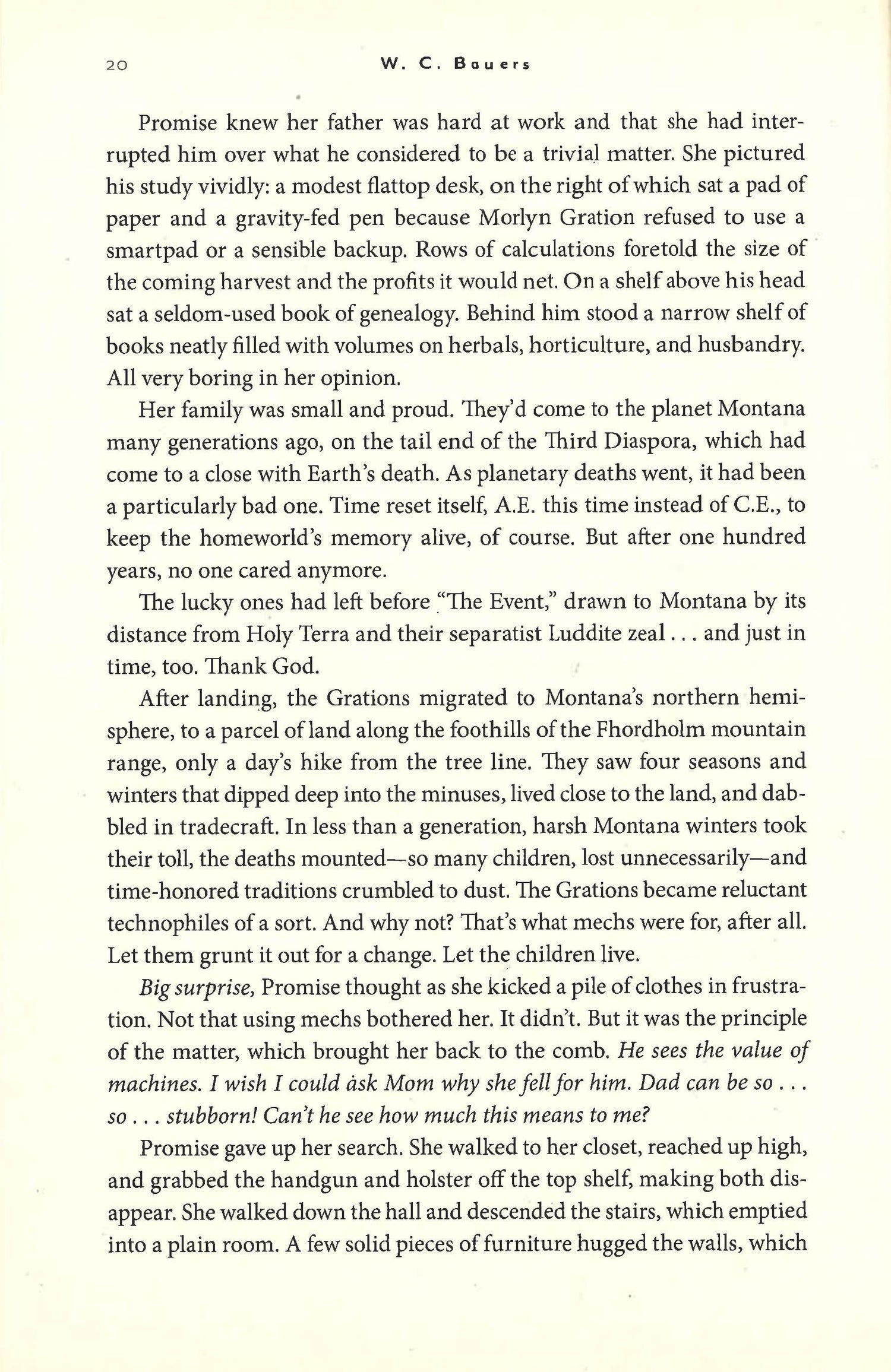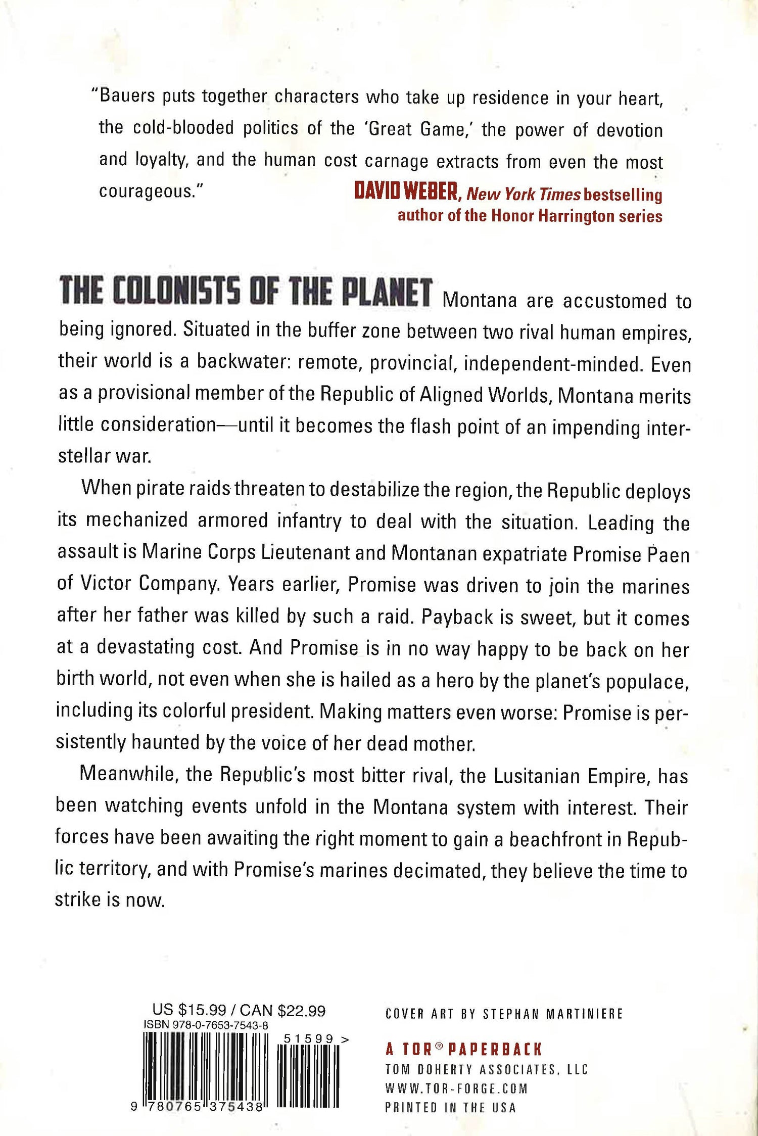 The colonists of the planet Montana are accustomed to being ignored. Situated in the buffer zone between two rival human empires, their world is a backwater: remote, provincial, independently minded. Even as a provisional member of the Republic of Aligned Worlds, Montana merits little consideration--until it becomes the flashpoint in an impending interstellar war.When pirate raids threaten to destabilize the region, the RAW deploys its mechanized armored infantry to deal with the situation. Leading the assault is Marine Corps Lieutenant and Montanan expatriate Promise Paen of Victor Company. Years earlier, Promise was driven to join the Marines after her father was killed by such a raid. Payback is sweet, but it comes at a tremendous and devastating cost. And Promise is in no way happy to be back on her birthworld, not even when she is hailed as a hero by the planet's populace, including its colorful president. Making matters even worse: Promise is persistently haunted by the voice of her dead mother.Meanwhile, the RAW's most bitter rival, the Lusitanian Empire, has been watching events unfold in the Montana system with interest. Their forces have been awaiting the right moment to gain a beachhead in Republic territory, and with Promise's Marines decimated, they believe the time to strike is now.