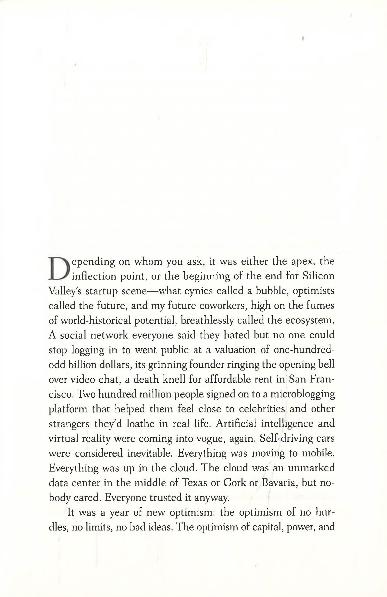 Anna arrived amidst a massive cultural shift, as the tech industry rapidly transformed into a locus of wealth and power rivaling Wall Street. But amid the company ski vacations and in-office speakeasies, boyish camaraderie and ride-or-die corporate fealty, a new Silicon Valley began to emerge: one in far over its head, one that enriched itself at the expense of the idyllic future it claimed to be building.