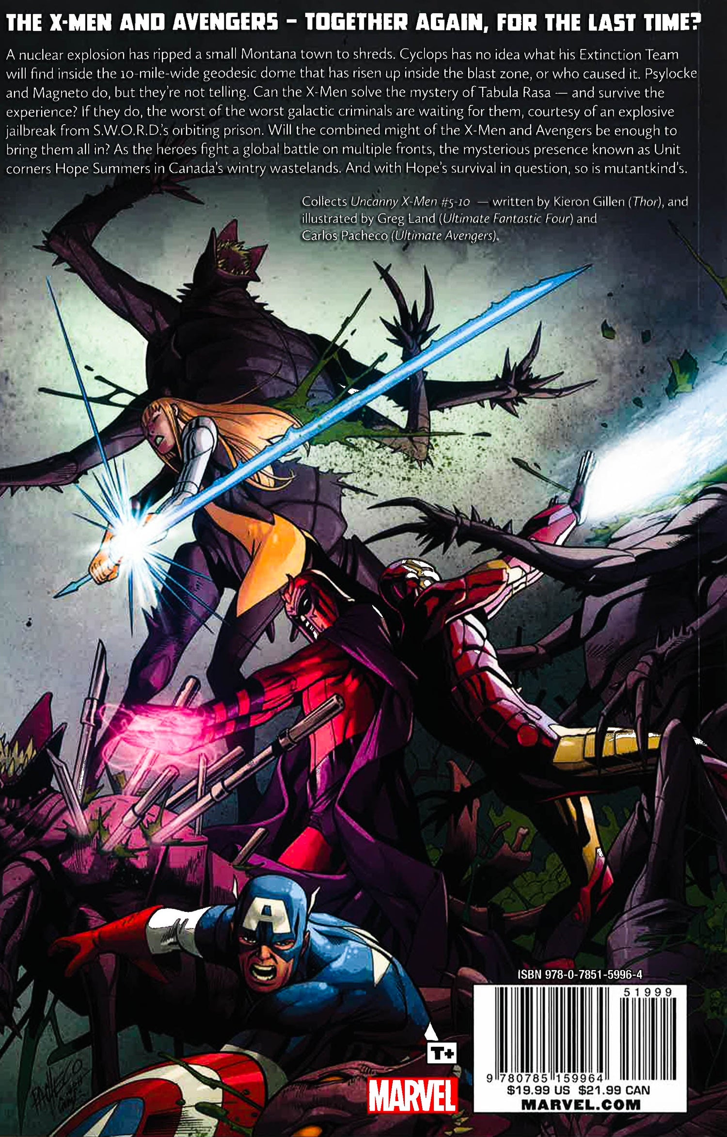 A nuclear explosion has ripped a small Montana town to shreds. Cyclops has no idea what his Extinction Team will find inside the 10-mile-wide geodesic dome that has risen up inside the blast zone, or who caused it. Psylocke and Magneto do, but they're not telling. Can the X-Men solve the mystery of Tabula Rasa - and survive the experience? If they do, the worst of the worst galactic criminals are waiting for them, courtesy of an explosive jailbreak from S.W.O.R.D.'s orbiting prison. Will the combined might of the X-Men and Avengers be enough to bring them all in?