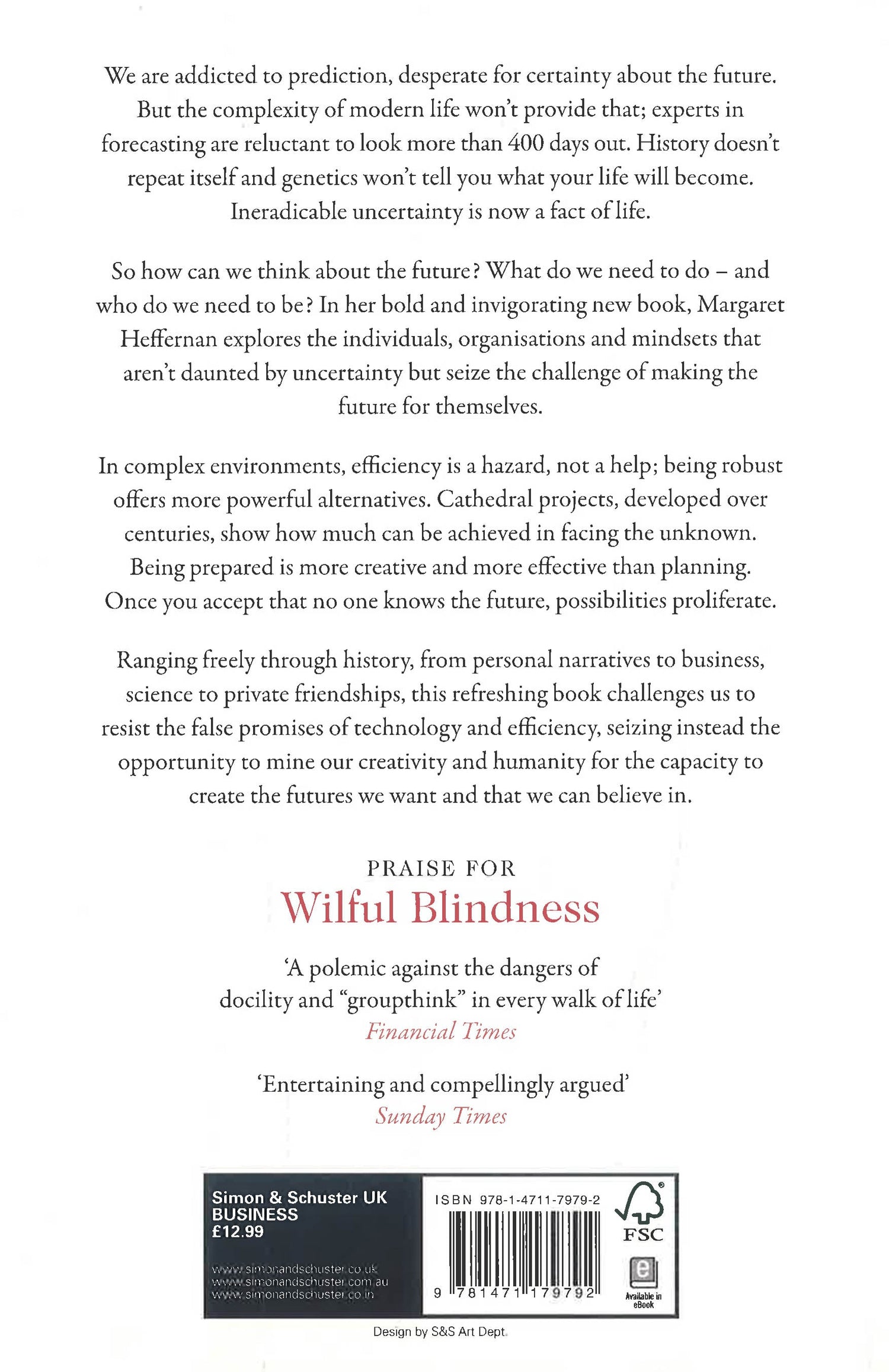 In complex environments, efficiency is a hazard not a help; being robust is the better, safer option. Drawing on a wide array of people and places, Margaret Heffernan looks at long-term projects developed over generations that could never have been planned the way that they have been run. Experiments, led by individuals and nations, discover new possibilities and options. Radical exercises in forging new futures with wildly diverse participants allow everyone to create outcomes together that none could do alone. Existential crises reveal the vital social component in resilience. Death is certain, but how we approach it impacts the future of those we leave behind. And preparedness – doing everything today that you might need for tomorrow – provides the antidote to passivity and prediction.