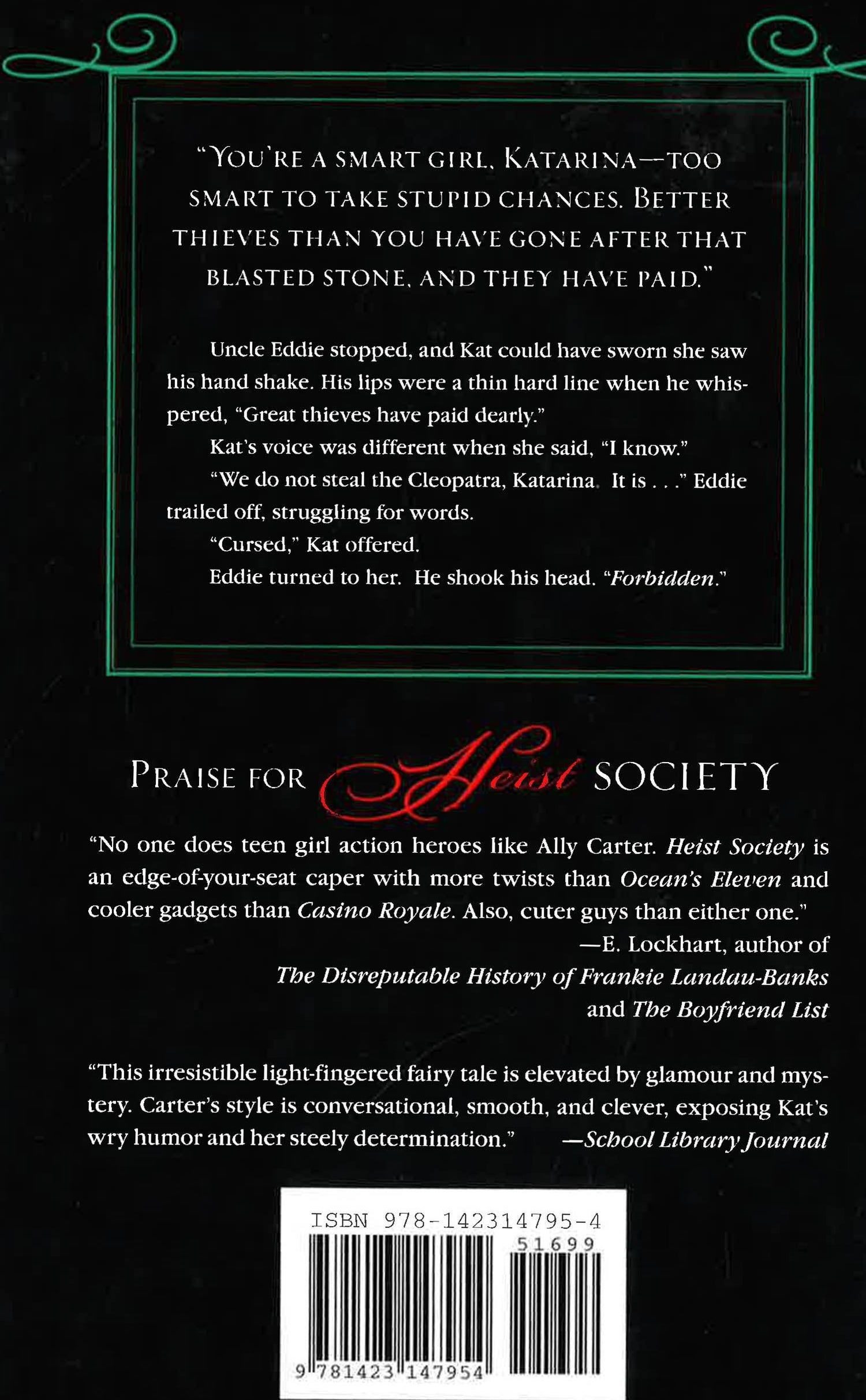 Katarina Bishop has worn a lot of labels in her short life, Friend, Niece, Daughter, Thief, but for the last two months she's simply been known as the girl who robbed the greatest museum in the world. That's why Kat isn't surprised when she's asked to steal the infamous Cleopatra Emerald so it can be returned to its rightful owners. There are only three problems. First, the gem is owned by the most secure auction house in the world. Second, since the fall of the Egyptian empire and the suicide of Cleopatra, no one who holds the emerald keeps it for long, and in Kat's world, history almost always repeats itself. But it's the third problem that makes Kat's crew the most nervous and that is simply... the emerald is cursed.