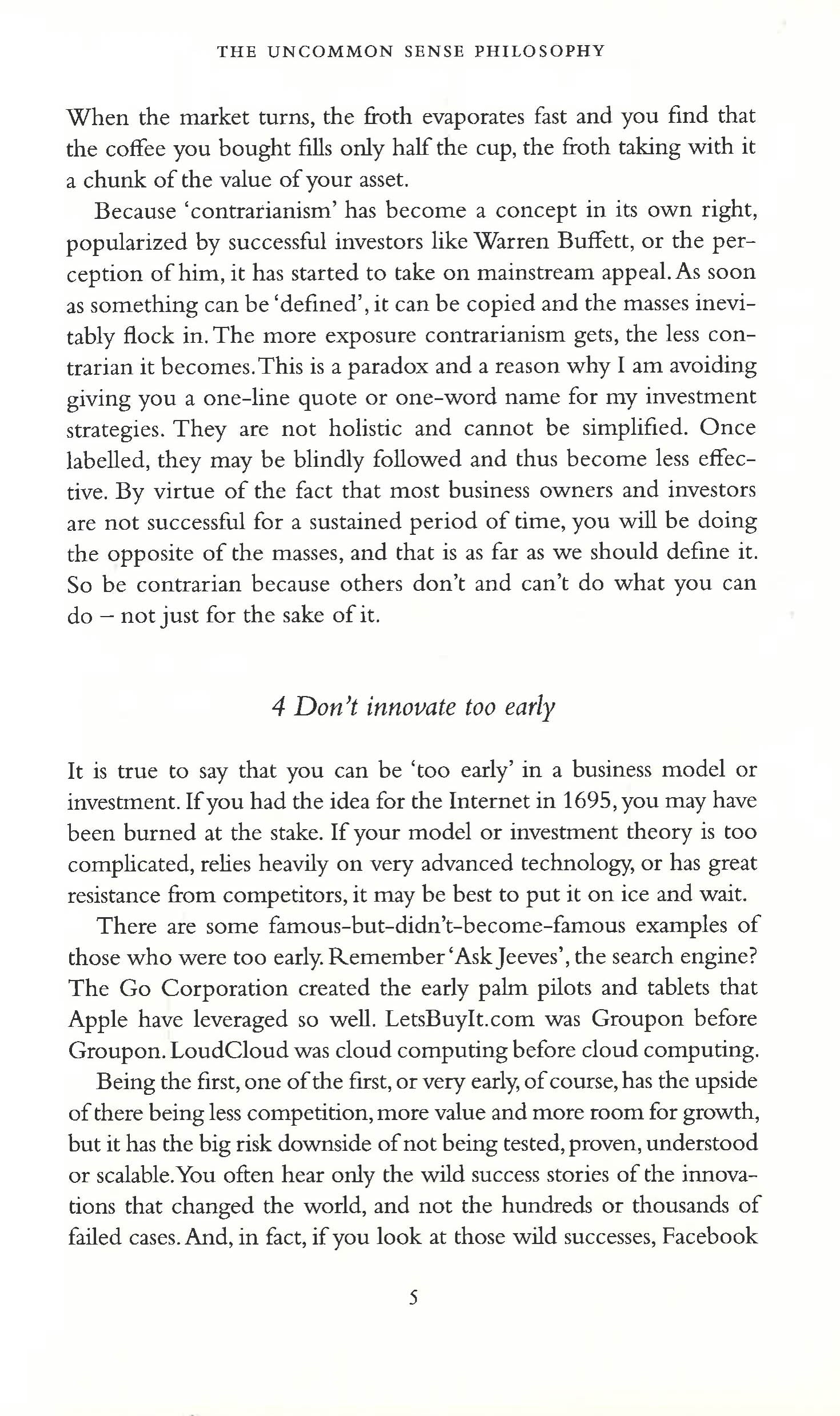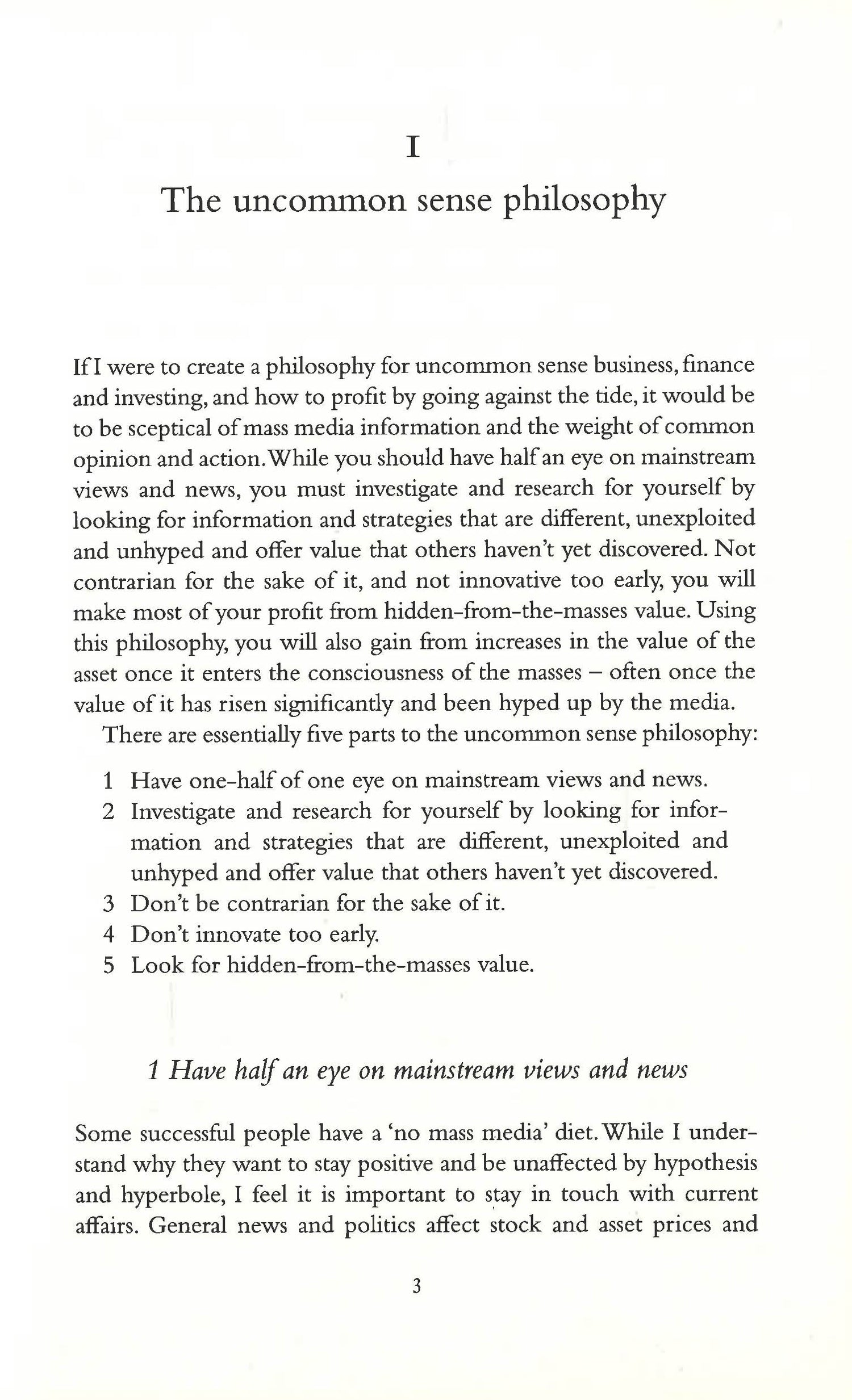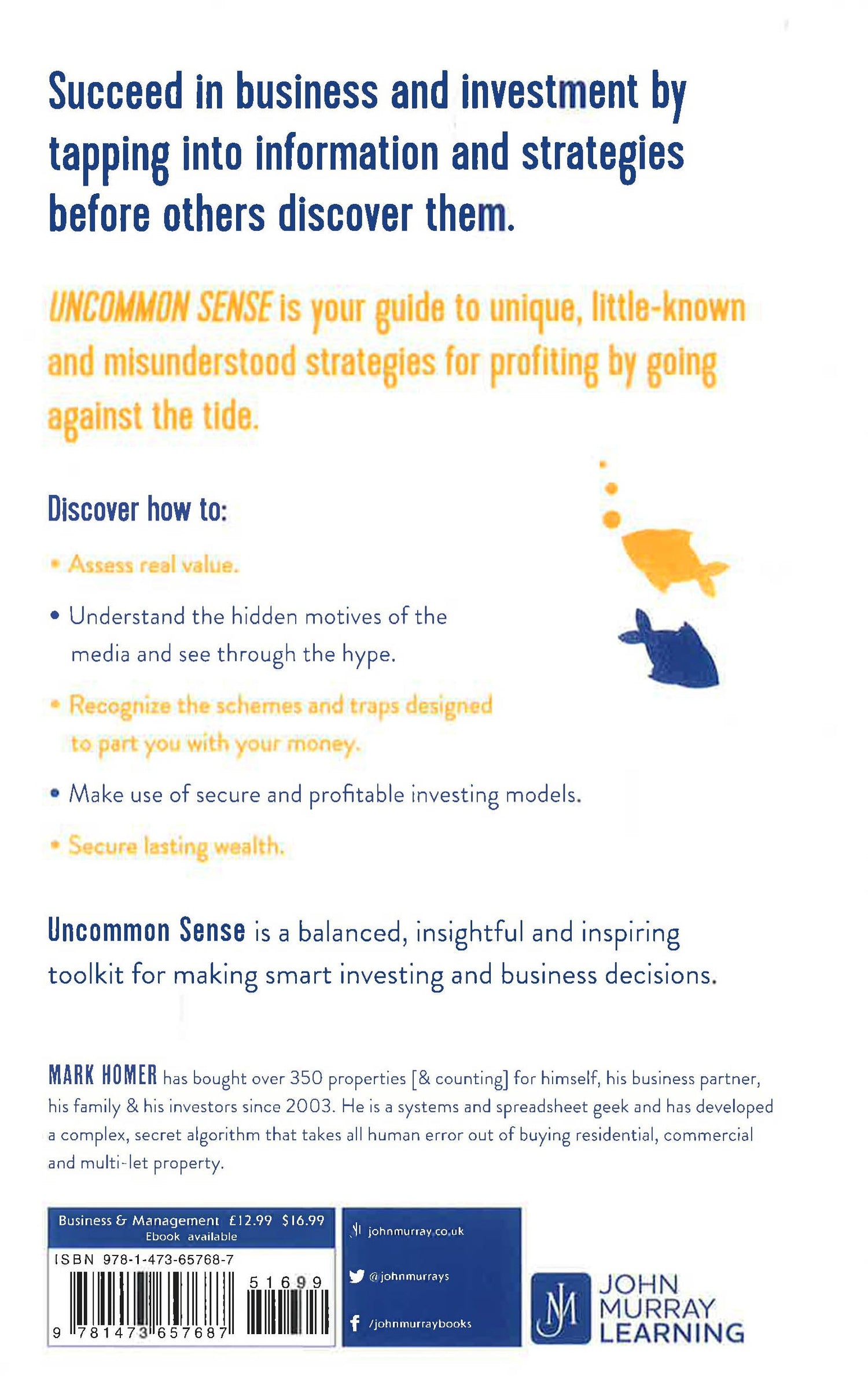 How would you like to succeed in business and master investment by profiting in untapped areas that the masses know nothing about? Uncommon Sense guides you to unique, little-known and commonly misunderstood strategies that generate lasting revenue and sustained results by going against the tide.In this book you'll discover:- How to asses real value, understand the hidden motives of the media and see through hype.- Real business investing models such as hybriding and super-specialisation which will enable you to invest securely and profitably.- Understand the popular misonceptions, schemes, traps and truths which part you from your money - and learn how to defend yourself against them and secure lasting wealth.Essential reading for investors, innovators and entrepreneurs, Uncommon Sense provides a balanced, insightful and inspiring toolkit for making smart decisions in investing and business.
