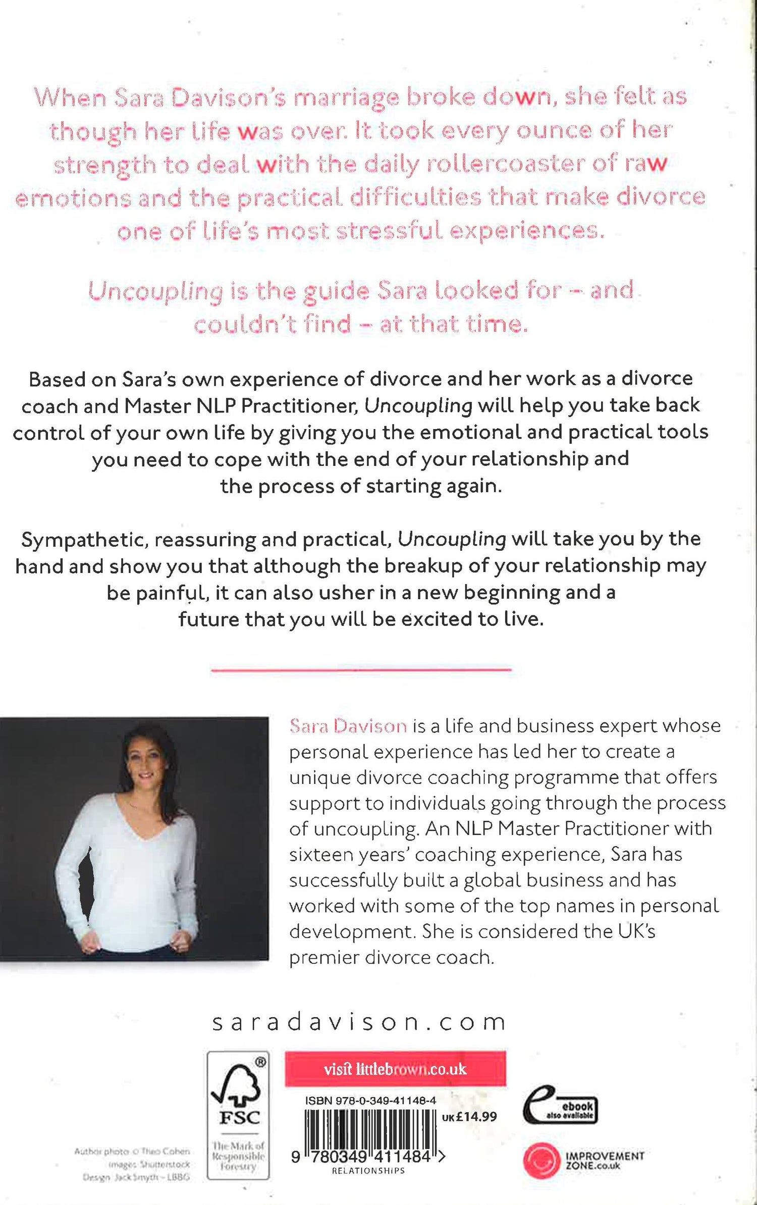 When Sara Davison's marriage broke down, she felt as though her life was over. It took every ounce of her strength to deal with the daily rollercoaster of raw emotions and the practical difficulties that make divorce one of life's most stressful experiences.Uncoupling is the guide Sara looked for - and couldn't find - at that time.Based on Sara's own experience of divorce and her work as a divorce coach and Master NLP Practitioner, Uncoupling will help you take back control of your own life by giving you the emotional and practical tools you need to cope with the end of your relationship and the process of starting again.Sympathetic, reassuring and practical, Uncoupling will take you by the hand and show you that although the breakup of your relationship may be painful, it can also usher in a new beginning and a future that you will be excited to live.