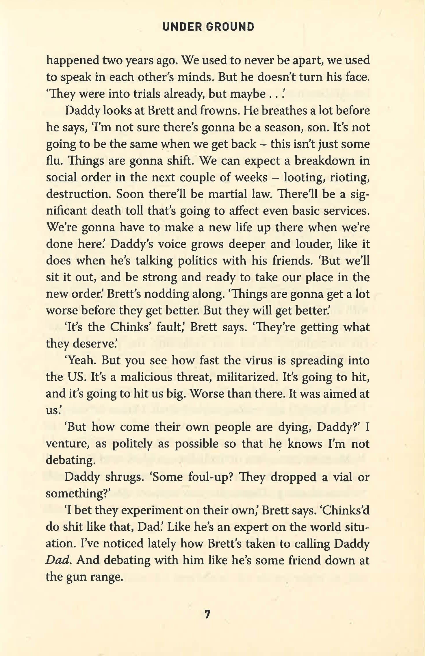 THEY THOUGHT THEY WERE SAFE . . . The Sanctum is a luxurious, self-sustaining survival condominium situated underground. It's a plush bolt-hole for the rich and paranoid - a place where they can wait out the apocalypse in style. When a devastating super-flu virus hits, several families race to reach The Sanctum. All have their own motivations for entering. All are hiding secrets. But when the door locks and someone dies, they realize the greatest threat to their survival may not be above ground - it may already be inside . . . Under Ground is a page-turning locked-room mystery from the combined talents of Sarah Lotz and Louis Greenberg, writing as S. L. Grey. It is perfect for fans of Under the Dome by Stephen King and films such as The Hole and The Descent (with a pinch of And Then There Were None by Agatha Christie).