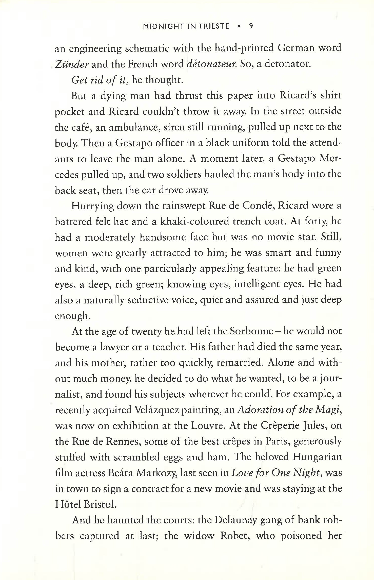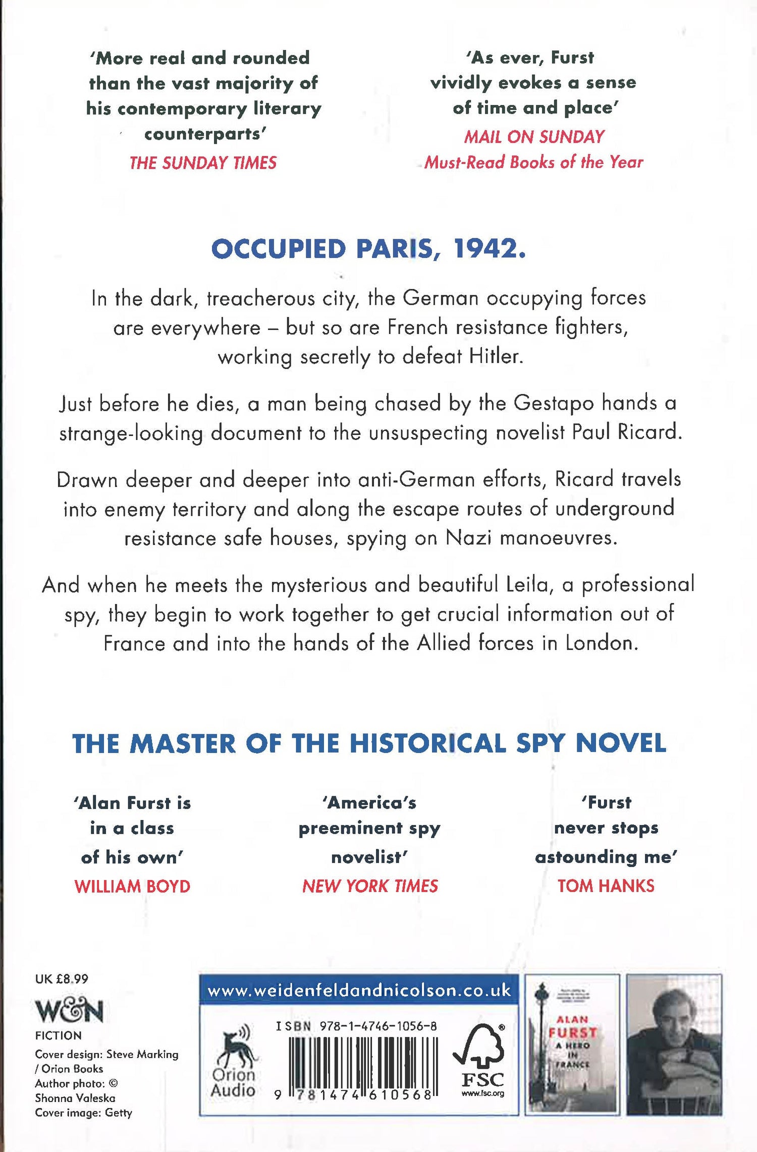 From the master of espionage and intrigue, this novel about heroic resistance fighters in 1942 occupied Paris is based on true events of Polish prisoners in Nazi Germany, who smuggled valuable intelligence to Paris and the resistance. Occupied Paris in 1942, a dark, treacherous city now ruled by the German security services, where French resistance networks are working secretly to defeat Hitler. Just before he dies, a man being chased by the Gestapo hands off to Paul Ricard a strange looking drawing. It looks like a part for a military weapon; Ricard realizes it must be an important document smuggled out of Germany to aid the resistance. As Ricard is drawn deeper and deeper into the French resistance network, his increasingly dangerous assignments lead him to travel to Germany, and along the underground safe houses of the resistance--and to meet the mysterious and beautiful Leila, a professional spy. Alan Furst has been called "one of the best contemporary writers" by David McCullough, and "the most talented espionage novelist of our generation" by Vince Flynn.