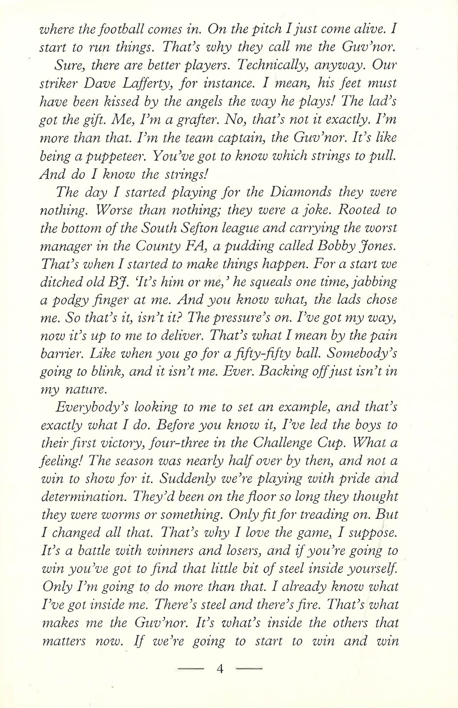 The Rough Diamonds are a close-knit team. Kev McGovern, their captain, makes sure they work hard and play hard, but Kev acts Swiftly when too many of the lads just aren't playing the game and let pressures off the pitch threaten the team's future.