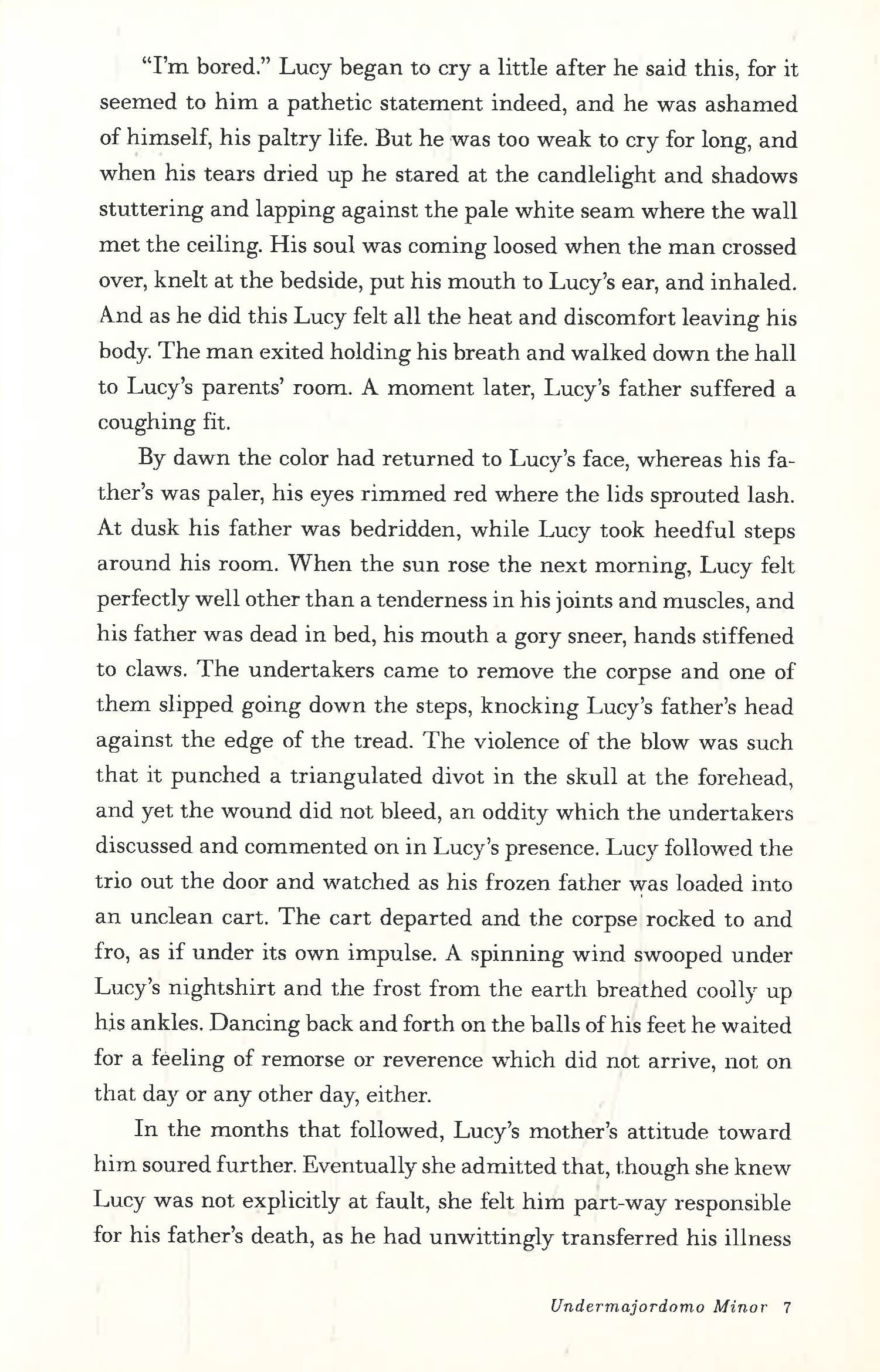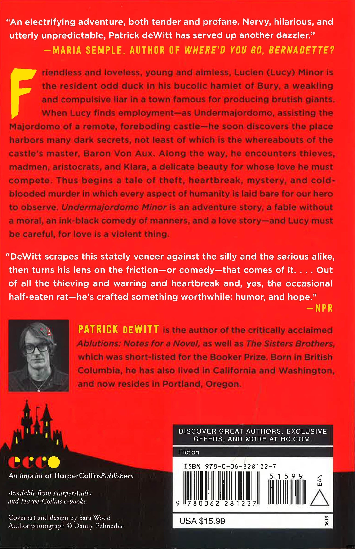 Friendless and loveless, young and aimless, Lucien (Lucy) Minor is the resident odd duck in his bucolic hamlet of Bury, a weakling and compulsive liar in a town famous for producing brutish giants. When Lucy finds employment—as Undermajordomo, assisting the Majordomo of a remote, foreboding castle—he soon discovers the place harbors many dark secrets, not least of which is the whereabouts of the castle’s master, Baron Von Aux. Along the way, he encounters thieves, madmen, aristocrats, and Klara, a delicate beauty for whose love he must compete. Thus begins a tale of theft, heartbreak, mystery, and cold-blooded murder in which every aspect of humanity is laid bare for our hero to observe. Undermajordomo Minor is an adventure story, a fable without a moral, an ink-black comedy of manners, and a love story—and Lucy must be careful, for love is a violent thing.