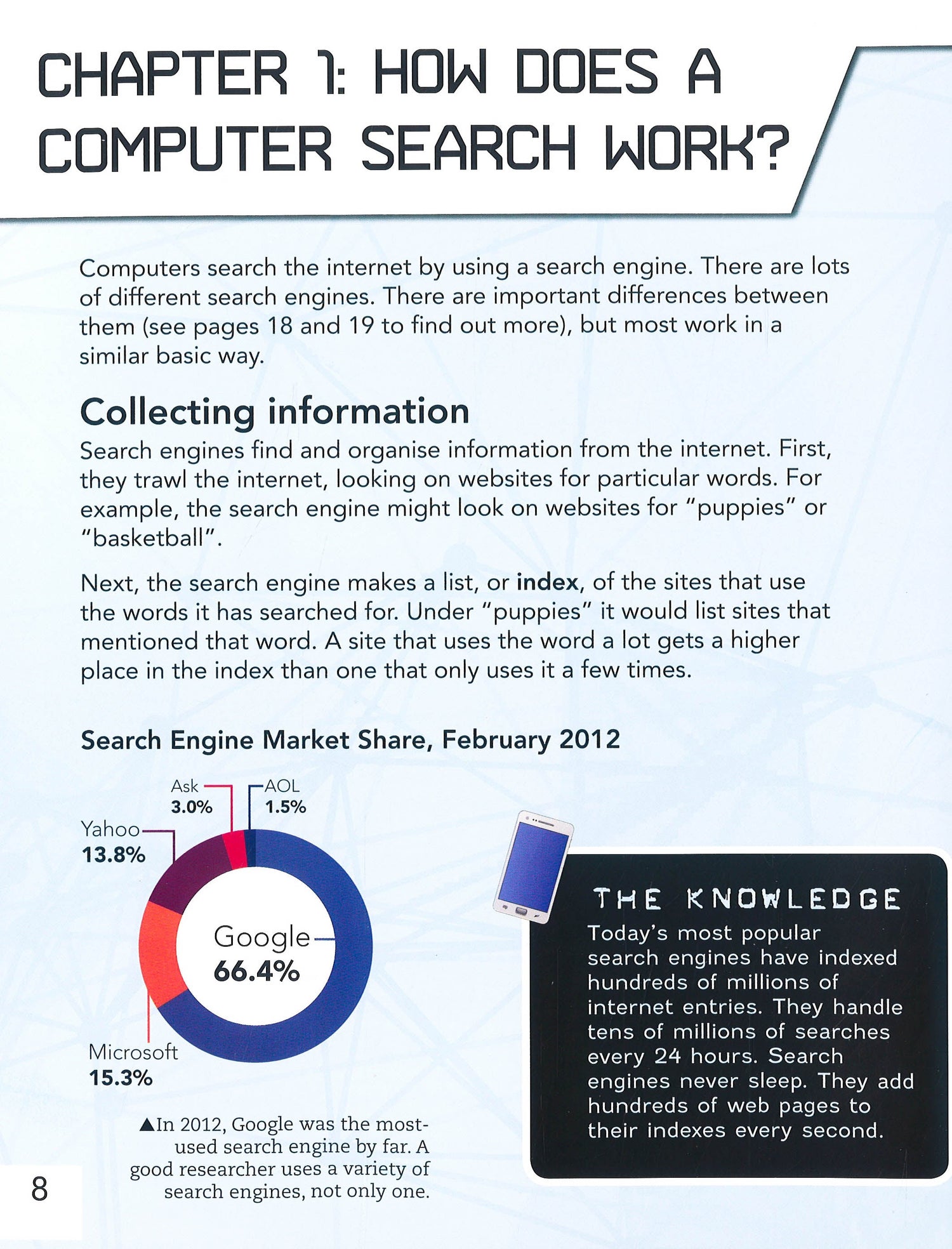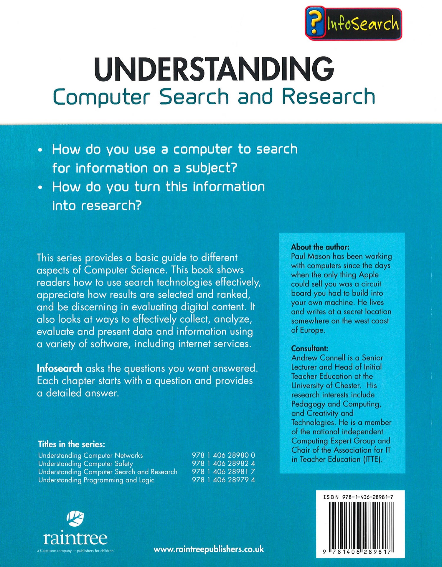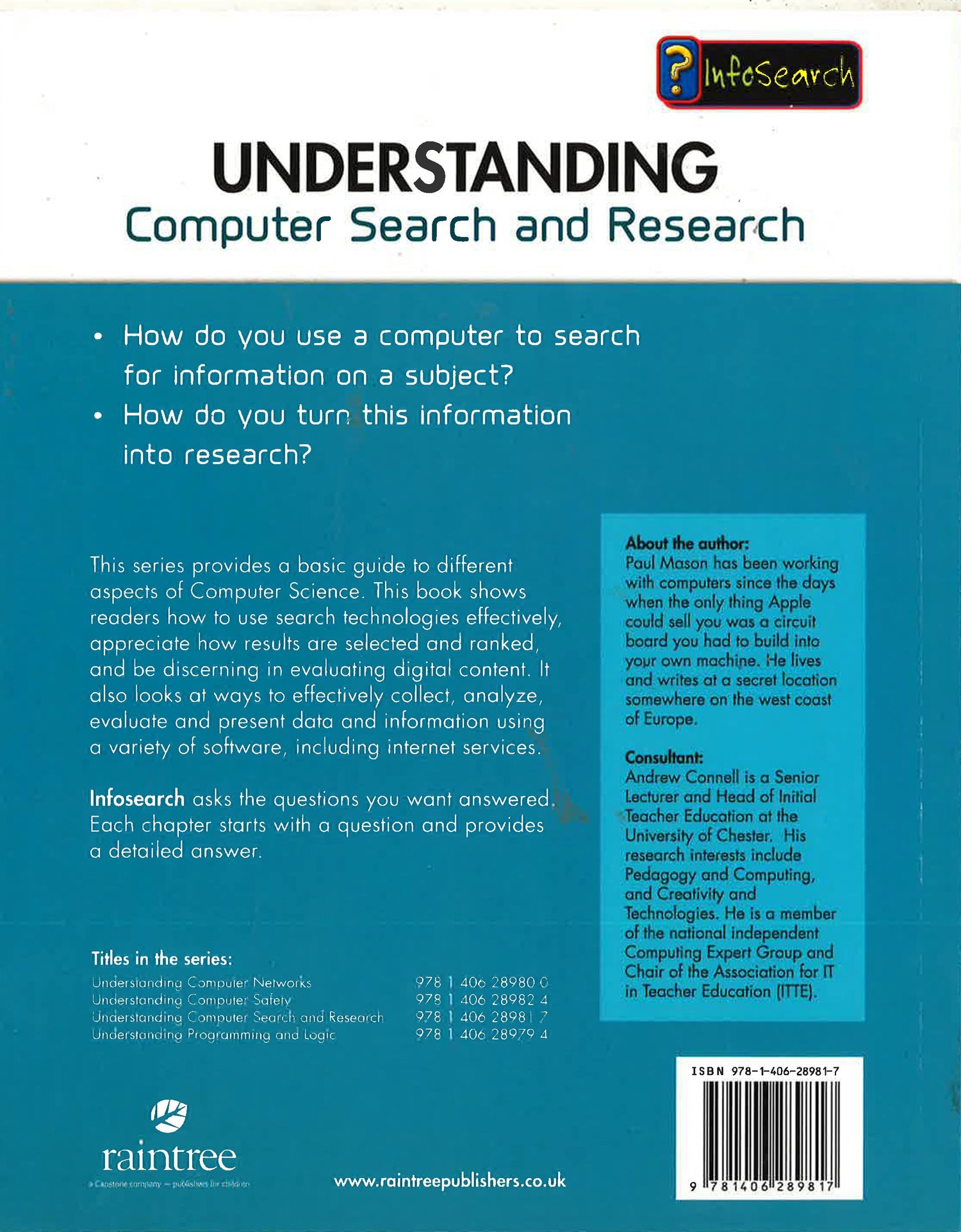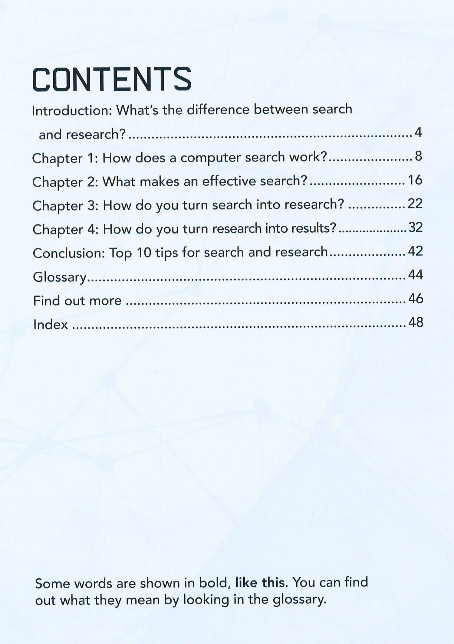 This book looks at the basics of computer search and research. It explains the difference between search and research, how to search and how to organise the results of a search to turn them into research. It describes how search engines work, and how to get the best results from your search. There are tips for successful searches including how to spot plagiarism and how to acknowledge sources. Try This features give suggestions for practising search techniques, and there are fact boxes to illustrate the topics covered.