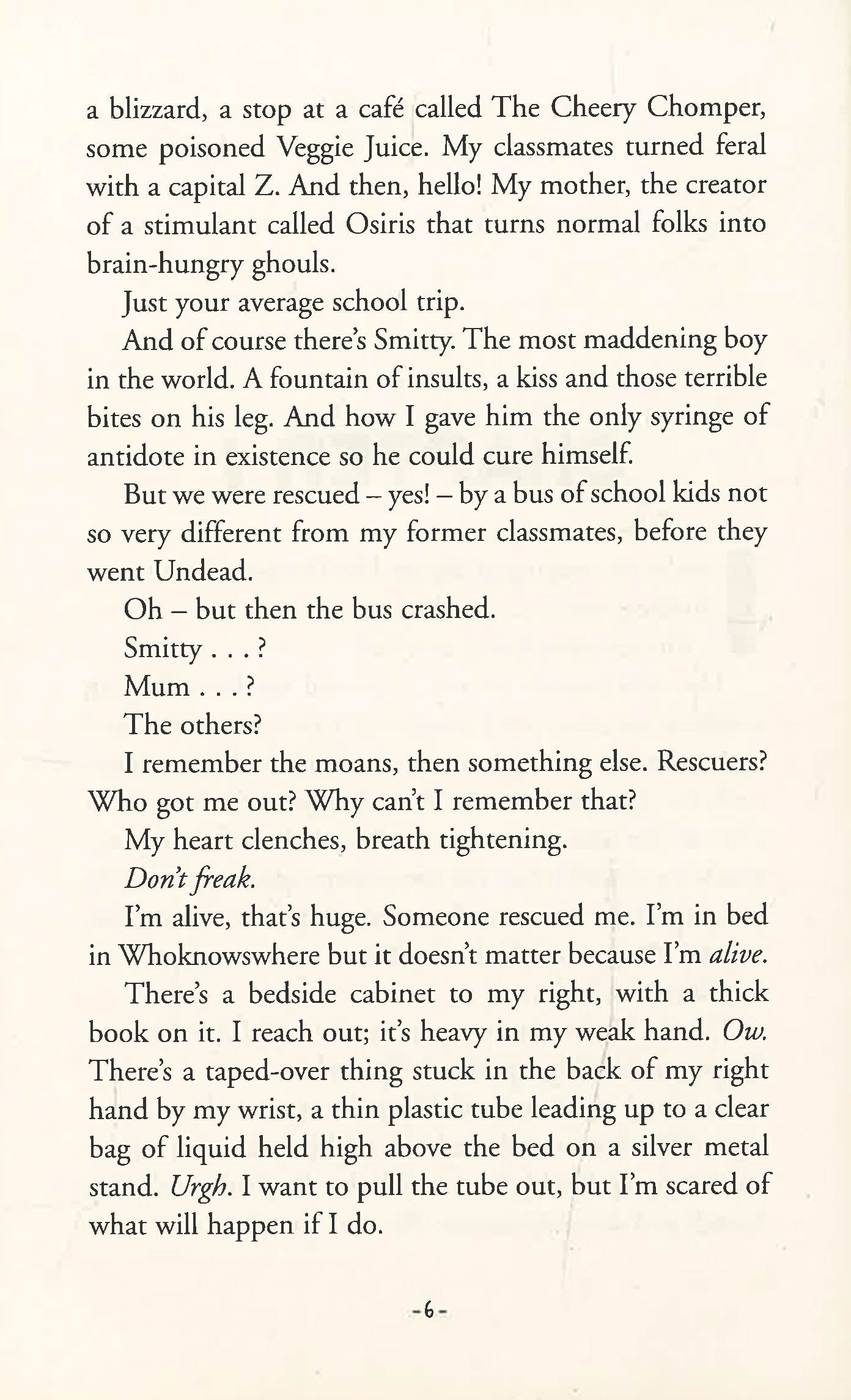 The good news: Bobby survived her Undead school trip. Bad news: her best mate, Smitty, is missing. Bobby knows she's got to find him . even if it means risking it all and going out into the starving-zombie-infested wastelands again. Even if it means taking fellow survivors - including a couple of old frenemies - along for the ride. And even if the zombies are not the only ones who are chasing them this time.